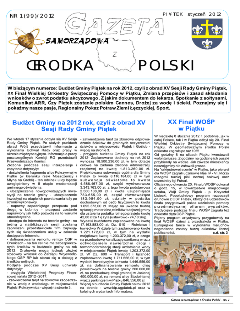 PI¥TEK NR 1 (99)/2012 ŒRODKA z styczeñ 2012 POLSKI W bie cym numerze: Bud et Gminy Pi tek na rok 2012, czyli z obrad XV Sesji Rady Gminy Pi tek, XX Fina Wielkiej Orkiestry wi tecznej Pomocy w Pi tku, Zmiana przepisów i zasad sk adania wniosków o zwrot podatku akcyzowego, Z jakim dokumentem do lekarza, Spotkanie z so tysami, Komunikat ARR, Czy Pi tek zostanie polskim Cannes, Dro ej za wod cieki, Poznajmy si i poka my nasze pasje, Regionalny Pokaz Potraw Ziemi czyckiej, Sport. Bud et Gminy na 2012 rok, czyli z obrad XV Sesji Rady Gminy Pi tek We wtorek 17 stycznia odby a si XV Sesja Rady Gminy Pi tek. Po sta ych punktach obrad Wójt przedstawi informacje z wykonania Uchwa Rady oraz pracy w okresie mi dzysesyjnym. Informacje o pracy poszczególnych Komisji RG przedstawili Przewodnicz cy Komisji. one podczas sesji interpelacje i zapytania dotyczy y: - do wietlenia fragmentu ulicy Pokrzywnej w Pi tku (w kierunku rzeki Moszczenicy i yna na Grobli) - ten odcinek ulicy b dzie uwzgl dniony w II etapie modernizacji gminnego o wietlenia. - ubezpieczenia nowopowstaj cych inwestycji na terenie gminy - ubezpieczenie inwestycji na etapie ich powstawania le y po stronie wykonawcy. - naprawy zapadni tego przepustu pod drog ubnicy - przepust zostanie naprawiony jak tylko pozwol na to warunki atmosferyczne. - dost pu do Internetu na terenie gminy - na jedn z najbli szych sesji zostan zaproszeni przedstawiciele firm zajmuj cych si wiadczeniem us ug w zakresie dost pu do Internetu. - dofinansowania remontu remizy OSP w Orenicach - na ten cel nie ma zabezpieczonych rodków w bud ecie gminy na rok 2012. Druhowie mog jednak z stosowny wniosek do Zarz du Wojewódzkiego OSP RP lub stara si o dotacj z rodków unijnych. Podj te podczas XV Ses ji uchwa y dotyczy y: - przyj cia Wieloletniej Prognozy Finansowej na lata 2012 - 2017. - zatwierdzenia taryf na zbiorowe zaopatrzenie w wod z wodoci gu w miejscowo ci Pi tek i Pokrzywnica - wi cej na stronie 3. - zatwierdzenia taryf za zbiorowe odprowadzanie cieków do gminnych oczyszczalni cieków w miejscowo ci Pi tek i Go lub wi cej na stronie 3. - przyj cia bud etu Gminy Pi tek na rok 2012- Zaplanowane dochody na rok 2012 wynosz 18.500.236,00 z , w tym dotacje celowe na zadania zlecone administracji rz dowej na kwot 1.813.260,00 z . Projektowana subwencja ogólna dla Gminy Pi tek to kwota 8.116.184,00 z w tym subwencja o wiatowa to kwota 4.588.467,00 z , cz wyrównawcza 3.343.763,00 z , z tego kwota podstawowa 2.560.108,00 z i kwota uzupe niaj ca 783.655,00 z , cz równowa ca 18 3.9 54, 00 z ; ud zia y w pod atku dochodowym od osób fizycznych to kwota 1.695.373,00 z . Maj c na uwadze trudn sytuacj materialn rolników tutejszej gminy dla ustalenia podatku rolnego przyj to kwot 42,00 z za 1 q yta (ustawowo - 74,18 z /q). Wydatki bud etowe zaplanowano na kwot 17.163.883,00 z . Dz. 010 – Rolnictwo i owiectwo W dziale tym zaplanowano kwot 1.221.172,00 z , w tym na wydatki maj tkowe kwot 1.203.372,00 z , z czego na przebudow kanalizacj sanitarn wraz z od tw o rze ni em n aw ier zch ni d r og i i termomodernizacj stacji uzdatniania wody w miejscowo ci Pi tek kwot 1.203.372,00 . W Dz. 600 – Transport i czno zaplanowano kwot 1.711.556,00 z , w tym wydatki inwestycyjne to kwota 1.446.556,00 . na dofinansowanie remontu dróg powiatowych na terenie gminy 200.000,00 , na przebudow drogi gminnej w Jasionej 400.000,00 z , na remont ulicy Stodolnianej wraz z parkingiem w Pi tku 846.556,00 z . Wi cej o bud ecie Gminy Pi tek na rok 2012 na stronie - www.bip.ugpiatek.pl oraz w kolejnych wydaniach Informatora. XX Fina WO P w Pi tku W niedziel 8 stycznia 2012 r. podobnie, jak w ca ej Polsce, tak i w Pi tku odby si 20. Fina Wielkiej Orkiestry wi tecznej Pomocy w Pi tku. W geometrycznym rodku Polski orkiestra zagra a po raz 10 !!! Od godziny 8 na ulicach Pi tku kwestowali wolontariusze. Z godziny na godzin ich puszki przybiera y na wadze. Jak zawsze mieszka cy naszej gminy nie owali grosza. Na "orkiestrowej scenie" w Pi tku, jako pierwsi dla WO P zagrali uczniowie klas IV - VI, którzy rozegrali turniej pi ki no nej halowej oraz uczestnicy ligi Futsal. Oficjalnego otwarcia 20. Fina u WO P dokona o godz. 15, w towarzystwie miejscowego sztabu, Wójt Gminy Pi tek - p. Krzysztof Lisiecki. Popo udniowy program rozpocz li druhowie z OSP Pi tek, którzy dla uczestników fina u przygotowali pokaz udzielania pomocy p r z e dm e d y c zn e j of i a r o m w yp a d kó w. Tradycyjnie podczas fina u WO P zagra a te orkiestra d ta OSP Pi tek. Pi kny program artystyczny przygotowa y na fina WO P dzieci z przedszkola w Pi tku. Europejskie ta ce w wykonaniu maluchów nagrodzone zosta y burz oklasków licznej publiczno ci. c.d. str. 3 Gazeta samorz dowa z rodka P olski - str. 1 Konkurs ofert Na podstawie art. 13 ustawy z dnia 24 kwietnia 2003 r. o dzia alno ci po ytku publicznego i o wolontariacie oraz uchwa y Nr XIII/61/11 Rady Gminy Pi tek z dnia 22 listopada 2011 r. w sprawie Programu Wspó pr acy z O rga nizacjami Pozarz dowymi na rok 2012 Wójt Gminy Pi tek og asza otwarty konkurs ofert na realizacj zadania publicznego w 2012 r. w dziedzinie upowszechniania kultury fizycznej i sportu. Szczegó y na stronie www.bip.ugpiatek.pl oraz www.gminapiatek.pl XII Regionalny Pokaz Potraw Ziemi czyckiej W T usty Czwartek, tj. 16 lutego 2012 r. o godz. 11.00 odb dzie si w Domu Kultury w czycy X II R E G IO N ALN Y P O K AZ POTRAW ZIEMI CZYCKIEJ "Ziemniaki, pyry, grule". Organizatorami imprezy s : Stowarzyszenie Kobiet Z iemi czyckiej, Starostwo Powiatowe w czycy, Dom Kultury w czycy, Muzeum w czycy, Urz d Miasta w czycy przy wspó pracy: Urz du Gminy w czycy, ODR Bratoszewice Rejon czyca, Urz du Gminy w Pi tku, Urz du Gminy w Daszynie, Urz du Gminy w Górze w. Ma gorzaty, Urz du Gminy w Witoni, Urz du Gminy w winicach Warckich, Urz du Gminy w Grabowie, Urz du Gminy w Wartkowicach, Urz du Gminy w Dalikowie i Fundacji Rozwoju Gmin "Prym". Zapraszamy do udzia u Ko a Gospody i Stowarzyszenia dzia aj ce na terenie 
