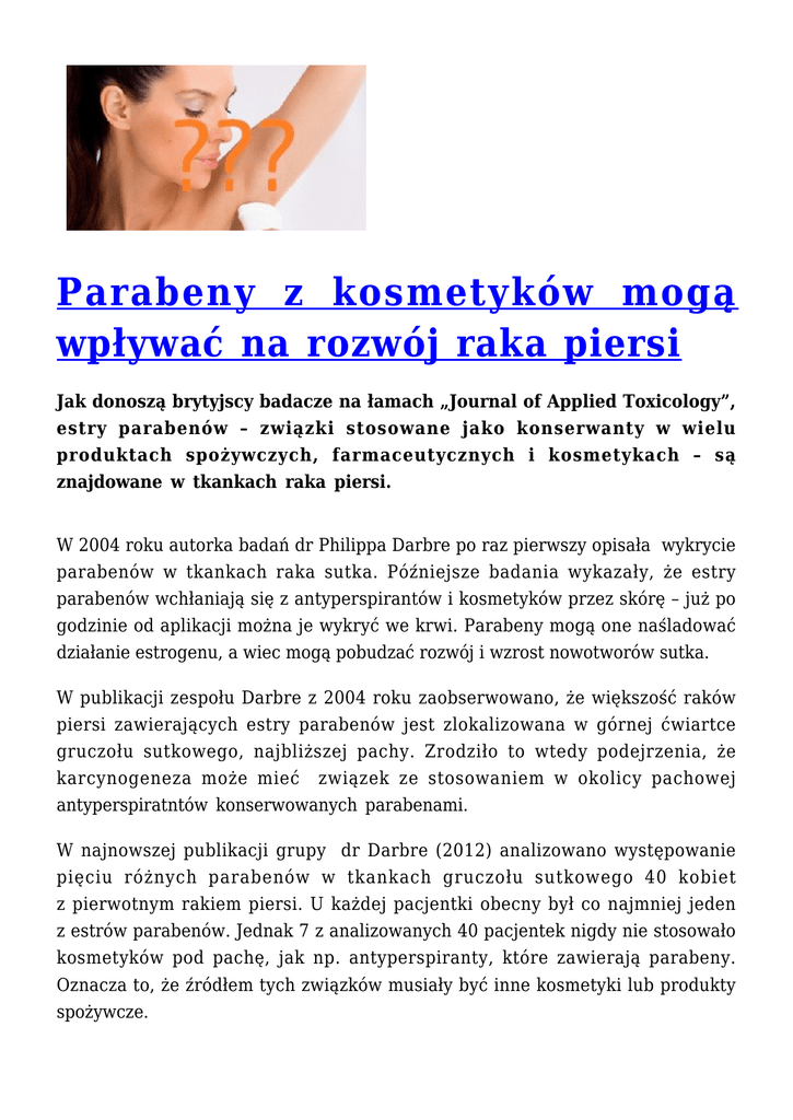 Parabeny z kosmetyków mogą wpływać na rozwój raka piersi Jak donoszą brytyjscy badacze na łamach „Journal of Applied Toxicology”, estry parabenów – związki stosowane jako konserwanty w wielu produktach spożywczych, farmaceutycznych i kosmetykach – są znajdowane w tkankach raka piersi. W 2004 roku autorka badań dr Philippa Darbre po raz pierwszy opisała wykrycie parabenów w tkankach raka sutka. Późniejsze badania wykazały, że estry parabenów wchłaniają się z antyperspirantów i kosmetyków przez skórę – już po godzinie od aplikacji można je wykryć we krwi. Parabeny mogą one naśladować działanie estrogenu, a wiec mogą pobudzać rozwój i wzrost nowotworów sutka. W publikacji zespołu Darbre z 2004 roku zaobserwowano, że większość raków piersi zawierających estry parabenów jest zlokalizowana w górnej ćwiartce gruczołu sutkowego, najbliższej pachy. Zrodziło to wtedy podejrzenia, że karcynogeneza może mieć związek ze stosowaniem w okolicy pachowej antyperspiratntów konserwowanych parabenami. W najnowszej publikacji grupy dr Darbre (2012) analizowano występowanie pięciu różnych parabenów w tkankach gruczołu sutkowego 40 kobiet z pierwotnym rakiem piersi. U każdej pacjentki obecny był co najmniej jeden z estrów parabenów. Jednak 7 z analizowanych 40 pacjentek nigdy nie stosowało kosmetyków pod pachę, jak np. antyperspiranty, które zawierają parabeny. Oznacza to, że źródłem tych związków musiały być inne kosmetyki lub produkty spożywcze. Jak mówią autorzy pracy – obecność danej substancji chemicznej w tkance nie oznacza jeszcze, że przyczynia się ona do rozwoju raka – do tego potrzebnych jest wiele czynników. Ale skoro okazuje się, że związki te wnikają do ludzkiego gruczołu sutkowego, konieczne jest przeprowadzenie dalszych badań, aby ocenić, czy ich obecność ma wpływ na rozwój nowotworu. Więcej: http://www.ncbi.nlm.nih.gov/pubmed/22237600 Nadal nie jest jasne jak parabeny dostają się do organizmu. Data publikacji: 20.01.2012r.