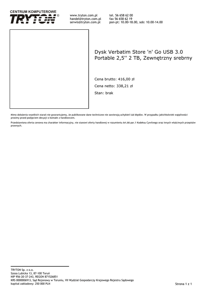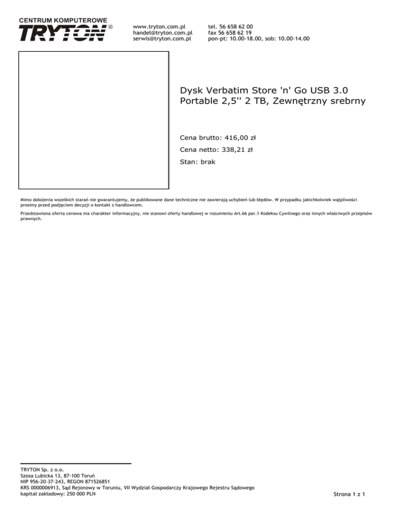 www.tryton.com.pl [email protected] [email protected] tel. 56 658 62 00 fax 56 658 62 19 pon-pt: 10.00-18.00, sob: 10.00-14.00 Dysk Verbatim Store 'n' Go USB 3.0 Portable 2,5'' 2 TB, Zewnętrzny srebrny Cena brutto: 416,00 zł Cena netto: 338,21 zł Stan: brak Mimo dołożenia wszelkich starań nie gwarantujemy, że publikowane dane techniczne nie zawierają uchybień lub błędów. W przypadku jakichkolwiek wątpliwości prosimy przed podjęciem decyzji o kontakt z handlowcem. Przedstawiona oferta cenowa ma charakter informacyjny, nie stanowi oferty handlowej w rozumieniu Art.66 par.1 Kodeksu Cywilnego oraz innych właściwych przepisów prawnych. TRYTON Sp. z o.o. Szosa Lubicka 13, 87-100 Toruń NIP 956-20-37-243, REGON 871526851 KRS 0000006913, Sąd Rejonowy w Toruniu, VII Wydział Gospodarczy Krajowego Rejestru Sądowego kapitał zakładowy: 250 000 PLN Strona 1 z 1