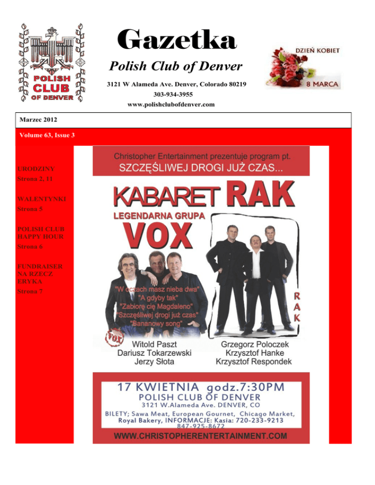 Gazetka Polish Club of Denver 3121 W Alameda Ave. Denver, Colorado 80219 303-934-3955 www.polishclubofdenver.com Marzec 2012 Volume 63, Issue 3 URODZINY Strona 2, 11 WALENTYNKI Strona 5 POLISH CLUB HAPPY HOUR Strona 6 FUNDRAISER NA RZECZ ERYKA Strona 7 Agnieszka Płonska 3/01 Aleksander Zagol 3/01 Maria Kulp 3/02 Elizabeth Kulesz-Federowicz 3/02 Anna Przybyłek 3/03 Zarząd Klubu składa serdeczne podziękowania Członkom oraz przyjaciołom Polskiego Klubu w Denver za zaangażownie w akcję charytatywną „Białaczka to nie wyrok” dla Eryka Walaszczyka. Z Państwa pomocą zebralismy ponad $24,000 na rzecz chorego chłopca! Thank you to all members and friends of the Polish Club of Denver who supported our fndraiser for Eryk Walaszczyk. Together, we raised over $24,000! Dariusz Sikora 3/03 Anna Lesky 3/06 Dolores Mrozek 3/08 Tom Szynakiewicz 3/14 Ksiądz Jan Mucha 3/16 Maciek Wardak 3/16 Maria Bonaparte 3/17 Gerard Wiktor 3/17 Marek Kedzior 3/19 Barbara Chodan 3/20 Katarzyna Majkut-Szuta 3/22 Teresa Gadzina 3/23 Zarząd Polskiego Klubu w Denver ma zaszczyt powitać nową członkinię Komisji Rewizyjnej Panią Anne Michaelis. Dziękujemy za cheć pracy na rzecz Klubu. We would like to welcome Ms. Anna Michaelis as the new member of the Audit Comitee. Thank you for your voluntary work for the Polish Club of Denver. Antoni Mohelicki 3/23 Jolanta Dębski 3/24 Anthony Nykiel 3/24 Janina Jarosz 3/25 Tom Altman 3/26 Maria Dobis 3/26 Janine Fleischauger 3/26 Halina Płatek 3/26 Zbigniew Retecki 3/26 Cyril Barton-Dobenin 3/27 Dorota Skotnicki 3/28 Richard Trzcinski 3/28 Zuzanna Felczynska 3/31 Andy Kilinski 3/31 2 Drogim seniorom życzymy udanej wycieczki do Greeley! Wycieczka - pielgrzymka do relikwii Błogoslawionego Jana Pawła II organizowana dla seniorów pod patronatem Polskiej Parafii. We wish our senior members a safe trip to Salida! GAZETKA Zarząd Prywatnie... Z Trzeciej Półki... Podróże małe i duże czyli jak zostaliśmy światowcami Wojciech Mann & Krzysztof Materna SABINA KALISZAN VICE PREZYDENT Sabina pochodzi z Nakła nad Notecią. Do Kolorado przyjechała z mężem i dwójka dzieci w 1984 r. Już po trzech miesiącach wstąpiła wraz z całą rodziną do Klubu Polskiego. Dzieci Sabiny należaly w tym czasie do grupy tanecznej „Orlęta” prowadzonej przy Klubie przez Joannę i Bogdana Pelszyńskich. Członkowie Klubu szybko docenili starania Sabiny na rzecz tutejszej Polonii. Po dwóch latach została wybrana na stanowisko Program Dyrektor. Z początkiem lat 90, Sabina zerwała swoje członkostwo w Klubie. W 1994 ponownie wstapila do Klubu, i od razu zabrala się do pracy pełną parą. Przez cztery kadencje pełniła funkcję skarbnika, nastepnie była członkiem komisji rewizyjnej, dyr. członkostwa, a obecnie pełni funkcję Vice Prezydenta Klubu. Jako vice prezydent, Sabina pomaga Prezydentowi w zarzadzaniu i koordynowaniu wszelkich dzialan klubowych. Sabina mieszka w Lakewood z mężem Stanisławem, z ktorym swiętowali 39 lat malżenstwa. Maja dwoje dorosłych dzieci, trzy wnuczki, a czwarte przyjdzie na swiat w lipcu. Sabina lubi pomagać innym, ale najważniejsza jest dla niej rodzina, bliscy i sprawdzeni przyjaciele. Bardzo lubi spotkania seniorów przy polskiej parafii w każdy drugi czwartek miesiąca. Wojciech Mann i Krzysztof Materna oprócz tego, że bardzo często ze sobą współpracowali są od wielu lat dobrymi przyjaciółmi. Zdarzyło im się nie jeden raz podróżować wspólnie – czy to służbowo czy prywatnie a garść wspomnień z tych wojaży można znaleźć w ich wspólnej książce „Podróże małe i duże czyli jak zostaliśmy światowcami”. Autorzy podeszli do swojego utworu z ogromnym poczuciem humoru, dystansem i niezwykłym ciepłem. Ich historie opowiadane naprzemiennie, często pełne wzajemnych wtrąceń i dygresji czyta się znakomicie. Serdecznie Polecam! Joanna Rocwa, Dyr. Biblioteki 3 Panu Romanowi Sałacie, życzenia szybkiego powrotu do zdrowia, życzą Zarząd i członkowie Klubu. Gratulacje dla Congratulations Państwa Mariolii i to Krzysztof and Krzysztofa Stoch z Mariola Stoch on okazji narodzin your first pierwszej wnuczki! Granddaughter! Warm wishes for a speedy recovery to Mr. Roman Salata, Board and Fellow Members News From the Colorado Society of Friends of John Paul II Foundation. Towarzystwo Przyjaciół Fundacji Jana Pawła II w Kolorado zaprasza Panstwa do St. Cabrini Shrine w Golden na uroczystość upamiętniającą rocznicę śmierci błogoslawionego Jana Pawła II . 31 marca, sobota, godzina 13:00. Jan Paweł II odszedł od nas 2 kwietnia 2005 roku. W tym roku rocznica śmierci Błogosławionego Ojca Swiętego przypada w poniedziałek. W wigilię tej rocznicy, 1 kwietnia, jest Niedziela Palmowa. Aby umożliwić wszystkim uczestnictwo we wspólnej modlitwie, uroczystość upamiętniającą rocznicę śmierci Błogosławionego Jana Pawła II organizujemy w sobotę 31 marca. Spotkamy się w Mother Cabrini Shrine (20189 Cabrini Boulevard, Golden,Co) o godzinie 13:00 pod krzyżem przy wejściu na stopnie Drogi Krzyżowej. Modlitwy przy Stacjach Drogi Krzyżowej poprowadzi Proboszcz polskiej parafii Sw. Józefa w Denver i Kapelan Fundacji Jana Pawła II w Kolorado ks. Marek Cieśla TChr. Po modlitwie zapraszamy na podwieczorek. 2 kwietnia, poniedziałek, godzina 17:30 Zapraszamy na Mszę w intencji kanonizacji Jana Pawła II do Bazyliki Katedralnej pw. Niepokalanego Poczęcia przy Logan i Colfax. Spotkamy się w prawej nawie przed obrazem Matki Boskiej Częstochowskiej. Po Mszy wspólna modlitwa przy pomniku Jana Pawła II znajdującego się przy katedrze. Prosimy o przyniesienie zniczy. Organizatorzy uroczystości: Barbara Popielak, Teresa Descour, Szymon Łobocki. Informacje: 303 840 0721 4 Fotorelacja z Walentynek w Polskim Klubie ♥ Valentine’s Day Dance at the Polish Club ♥ February 11, 2012 More Pictures on www.polishclubofdenver.com 5 W dniu 17 lutego w restauracji The Belvedere w downtown odbylo sie 
