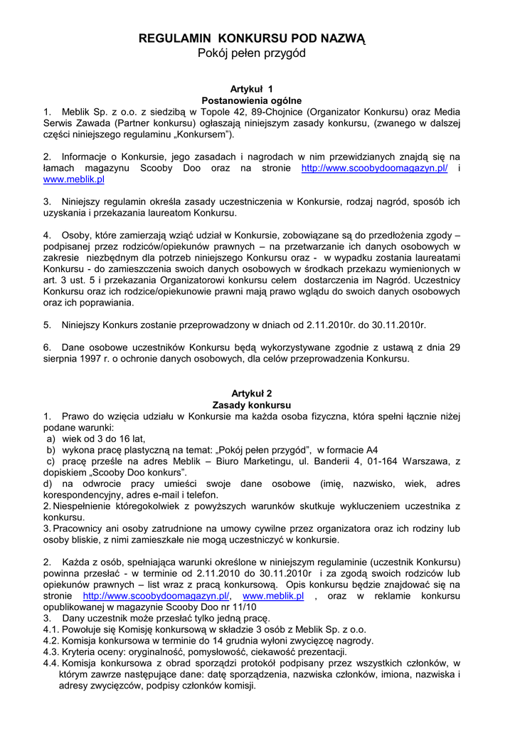 REGULAMIN KONKURSU POD NAZWĄ Pokój pełen przygód Artykuł 1 Postanowienia ogólne 1. Meblik Sp. z o.o. z siedzibą w Topole 42, 89-Chojnice (Organizator Konkursu) oraz Media Serwis Zawada (Partner konkursu) ogłaszają niniejszym zasady konkursu, (zwanego w dalszej części niniejszego regulaminu „Konkursem”). 2. Informacje o Konkursie, jego zasadach i nagrodach w nim przewidzianych znajdą się na łamach magazynu Scooby Doo oraz na stronie http://www.scoobydoomagazyn.pl/ i www.meblik.pl 3. Niniejszy regulamin określa zasady uczestniczenia w Konkursie, rodzaj nagród, sposób ich uzyskania i przekazania laureatom Konkursu. 4. Osoby, które zamierzają wziąć udział w Konkursie, zobowiązane są do przedłożenia zgody – podpisanej przez rodziców/opiekunów prawnych – na przetwarzanie ich danych osobowych w zakresie niezbędnym dla potrzeb niniejszego Konkursu oraz - w wypadku zostania laureatami Konkursu - do zamieszczenia swoich danych osobowych w środkach przekazu wymienionych w art. 3 ust. 5 i przekazania Organizatorowi konkursu celem dostarczenia im Nagród. Uczestnicy Konkursu oraz ich rodzice/opiekunowie prawni mają prawo wglądu do swoich danych osobowych oraz ich poprawiania. 5. Niniejszy Konkurs zostanie przeprowadzony w dniach od 2.11.2010r. do 30.11.2010r. 6. Dane osobowe uczestników Konkursu będą wykorzystywane zgodnie z ustawą z dnia 29 sierpnia 1997 r. o ochronie danych osobowych, dla celów przeprowadzenia Konkursu. Artykuł 2 Zasady konkursu 1. Prawo do wzięcia udziału w Konkursie ma każda osoba fizyczna, która spełni łącznie niżej podane warunki: a) wiek od 3 do 16 lat, b) wykona pracę plastyczną na temat: „Pokój pełen przygód”, w formacie A4 c) pracę prześle na adres Meblik – Biuro Marketingu, ul. Banderii 4, 01-164 Warszawa, z dopiskiem „Scooby Doo konkurs”. d) na odwrocie pracy umieści swoje dane osobowe (imię, nazwisko, wiek, adres korespondencyjny, adres e-mail i telefon. 2. Niespełnienie któregokolwiek z powyższych warunków skutkuje wykluczeniem uczestnika z konkursu. 3. Pracownicy ani osoby zatrudnione na umowy cywilne przez organizatora oraz ich rodziny lub osoby bliskie, z nimi zamieszkałe nie mogą uczestniczyć w konkursie. 2. Każda z osób, spełniająca warunki określone w niniejszym regulaminie (uczestnik Konkursu) powinna przesłać - w terminie od 2.11.2010 do 30.11.2010r i za zgodą swoich rodziców lub opiekunów prawnych – list wraz z pracą konkursową. Opis konkursu będzie znajdować się na stronie http://www.scoobydoomagazyn.pl/, www.meblik.pl , oraz w reklamie konkursu opublikowanej w magazynie Scooby Doo nr 11/10 3. Dany uczestnik może przesłać tylko jedną pracę. 4.1. Powołuje się Komisję konkursową w składzie 3 osób z Meblik Sp. z o.o. 4.2. Komisja konkursowa w terminie do 14 grudnia wyłoni zwycięzcę nagrody. 4.3. Kryteria oceny: oryginalność, pomysłowość, ciekawość prezentacji. 4.4. Komisja konkursowa z obrad sporządzi protokół podpisany przez wszystkich członków, w którym zawrze następujące dane: datę sporządzenia, nazwiska członków, imiona, nazwiska i adresy zwycięzców, podpisy członków komisji. 5. Informacja o zwycięzcach nagrody głównej i nagród dodatkowych zostanie opublikowana w na stronie magazynu „Scooby-Doo Magazyn”, www.meblik.pl oraz przekazana przez pocztę bezpośrednio zainteresowanym. Artykuł 3 Nagrody 1. Spośród uczestników Konkursu, którzy prześlą w terminie od 2.11.2010 do 30.11.2010r. prawidłowe odpowiedzi oraz swoje dane osobowe, zostanie wyłonionych 16 laureatów Konkursu. 2. Laureatom Konkursu zostaną przyznane Nagrody : a) Nagroda główna: zestaw mebli za 3.000 zł, do wyboru z kolekcji: Dakar, Mustang, Sawanna, Orchidea, Formuła, Księżniczka, Oceanic lub Podróżnik – wygrywa praca która zostanie w ocenie Komisji konkursowej uznana za najbardziej oryginalną i pomysłową. b) Nagrody dodatkowe: 5 skrzyń na skarby o wartości 450 zł każda, do wyboru z kolekcji oferowanych przez Meblika na stronie www.meblik.pl oraz 10 tabliczek z imieniem laureata o wartości 150 zł każda 3. Nagrody zostaną przyznane w dniu 14.12.2010r. Wybór laureatów Konkursu nastąpi w siedzibie Biura Marketingu Organizatora Konkursu. 4. Niezwłocznie po zakończeniu przyznawania Nagród zostanie sporządzony protokół dotyczący jego przebiegu. 5. Informacja o laureatach Konkursu zostanie zamieszczona w dniu 15.12.2010r. na stronie http://www.scoobydoomagazyn.pl/ i www.meblik.pl 6. Nagroda główna o której mowa w ustępie 2 pkt a niniejszego artykułu, zostanie dostarczona oraz zmontowana przez Organizatora Konkursu firmę Meblik Sp. z o.o., po uzgodnieniu ze Zwycięzcą kolekcji, miejsca i czasu dostawy, z zastrzeżeniem postanowień ust. 8 – ust. 13 poniżej, w ciągu 6 tygodni. 7. Nagrody dodatkowe o których mowa w ustępie 2 pkt b niniejszego artykułu, zostaną dostarczone i zmontowane przez organizatora Konkursu firmę Meblik Sp.zo.o., po uzgodnieniu ze Zwycięzcami kolekcji, miejsca i czasu dostawy z zastrzeżeniem postanowień ust.8 – ust 13 poniżej, w ciągu 6 tygodni. 8. Wygrana Nagroda Główna oraz Nagrody Dodatkowe podlegają opodatkowaniu zgodnie z obowiązującymi przepisami ustawy o podatku dochodowym od osób fizycznych. Organizator informuje, że zobowiązany jest pobrać kwotę zryczałtowanego podatku od nagród, od laureata Nagrody Głównej, oraz od laureatów Nagród Dodatkowych, przed jej wydaniem. 9. Podatek dochodowy od Nagrody Głównej obciąża Laureata Konkursu. Laureat Konkursu zobowiązany jest do wpłaty kwoty podatku od Nagrody Głównej w wysokości 300 zł (słownie: trzysta zł ), na poniższe konto Organizatora: PKO : 86 1020 1491 0000 4702 0038 9429 . Nagrody Dodatkowe zwolnione są z podatku. 10. W przypadku gdy laureaci nagród nie przekażą Organizatorowi Konkursu kwoty podatku do dnia 30.12.2010 r., tracą prawo do Nagród. W powyższym przypadku Organizator Konkursu nie 