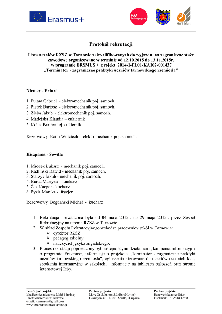 Protokół rekrutacji Lista uczniów RZSZ w Tarnowie zakwalifikowanych do wyjazdu na zagraniczne staże zawodowe organizowane w terminie od 12.10.2015 do 13.11.2015r. w programie ERSMUS + projekt 2014-1-PL01-KA102-001437 „Terminator - zagraniczne praktyki uczniów tarnowskiego rzemiosła” Niemcy - Erfurt 1. Fulara Gabriel - elektromechanik poj. samoch. 2. Piątek Bartosz - elektromechanik poj. samoch. 3. Zięba Jakub - elektromechanik poj. samoch. 4. Madejska Klaudia – cukiernik 5. Kolak Bartłomiej cukiernik Rezerwowy Katra Wojciech - elektromechanik poj. samoch. Hiszpania - Sewilla 1. Mrozek Łukasz - mechanik poj. samoch. 2. Radliński Dawid - mechanik poj. samoch. 3. Starzyk Jakub - mechanik poj. samoch. 4. Burza Martyna - kucharz 5. Żak Kacper - kucharz 6. Pyzia Monika - fryzjer Rezerwowy Bogdański Michał - kucharz 1. Rekrutacja prowadzona była od 04 maja 2015r. do 29 maja 2015r. przez Zespół Rekrutacyjny na terenie RZSZ w Tarnowie. 2. W skład Zespołu Rekrutacyjnego wchodzą pracownicy szkół w Tarnowie: dyrektor RZSZ pedagog szkolny nauczyciel języka angielskiego. 3. Proces rekrutacji poprzedzony był następującymi działaniami; kampania informacyjna o programie Erasmus+, informacje o projekcie „Terminator - zagraniczne praktyki uczniów tarnowskiego rzemiosła”, ogłoszenia kierowane do uczniów ostatnich klas, spotkania informacyjne w szkołach, informacje na tablicach ogłoszeń oraz stronie internetowej Izby. Beneficjent projektu: Izba Rzemieślnicza oraz Małej i Średniej Przedsiębiorczości w Tarnowie e-mail: [email protected] www.izbarzemieslnicza.tarnow.pl Partner projektu: Move On Solutions S.L (EuroMoving) C/Arrayan 40B. 41003. Sevilla, Hiszpania Partner projektu: Handwerkskammer Erfurt Fischmarkt 13 99084 Erfurt 4. Uczestnikiem projektu mogła być osoba, która z własnej inicjatywy, dobrowolnie wyraża chęć uczestnictwa w projekcie i spełnia wymagania określone w §3 pkt.5 Regulaminu rekrutacji i uczestnictwa w projekcie. 5. Proces rekrutacji obejmował: złożenie u wychowawcy klasy formularza aplikacyjnego o zakwalifikowanie do udziału w projekcie wraz z wymaganymi dokumentami, w tym wydruku z dziennika (z aktualnego semestru) z ocenami, ilością godzin opuszczonych, uwagami o zachowaniu, rozmowę kwalifikacyjną, akceptację wniosku przez Zespół ds. rekrutacji, sporządzenie listy głównej i rezerwowej. 6. Do udziału w projekcie spośród chętnych którzy złożyli formularze aplikacyjne, do udziału w projekcie zakwalifikowane zostały osoby, które otrzymały pozytywną opinię wychowawcy, pedagoga szkolnego i dyrektora szkoły. Formularze z danymi stanowią załączniki do protokołu. 7. Proces rekrutacji został zakończony sporządzeniem przez Zespół Rekrutacyjny listy osób zakwalifikowanych, opublikowaniem na tablicy informacyjnej w RZSZ w Tarnowie oraz na stronie internetowej Izby. 8. Wolne miejsce, po rezygnacji zakwalifikowanego uczestnika zajmuje pierwsza w kolejności osoba z listy rezerwowej. 9. Po pozytywnym zakończeniu procesu rekrutacji uczeń z rodzicami podpisuje Oświadczenie o wyrażeniu zgody na uczestnictwo w projekcie, Umowę o staż oraz Porozumienie o programie stażu. 10. Każdy zakwalifikowany uczeń musi wziąć udział we wszystkich rodzajach zajęć przygotowujących, objętych Projektem. 11. W przypadku zbyt małej liczby Uczestników rekrutacja może zostać wznowiona w dowolnym momencie trwania projektu. 12. Wyniki rekrutacji przeprowadzonej przez Zespół Rekrutacyjny przedstawione zostają do ostatecznej akceptacji Lidera projektu – dyrektora Izby Rzemieślniczej w Tarnowie. 1. Dyrektor RZSZ Krzysztof Majchrowicz 2. Pedagog szkolny Barbara Zembura 3. Nauczyciel j. angielskiego Małgorzata Wajda Tarnów 29.05.2015r. Beneficjent projektu: Izba Rzemieślnicza oraz Małej i Średniej Przedsiębiorczości w Tarnowie e-mail: [email protected] www.izbarzemieslnicza.tarnow.pl Partner projektu: Move On Solutions S.L (EuroMoving) C/Arrayan 40B. 41003. Sevilla, Hiszpania Partner projektu: Handwerkskammer Erfurt Fischmarkt 13 99084 Erfurt