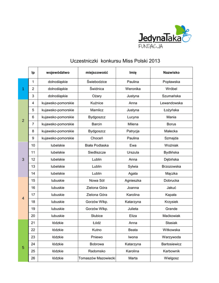 Uczestniczki konkursu Miss Polski 2013 1 2 3 4 5 lp województwo miejscowość Imię Nazwisko 1 dolnośląskie Świebodzice Paulina Popławska 2 dolnośląskie Świdnica Weronika Wróbel 3 dolnośląskie Ożary Justyna Szumańska 4 kujawsko-pomorskie Kuźnice Anna Lewandowska 5 kujawsko-pomorskie Mamlicz Justyna Łożyńska 6 kujawsko-pomorskie Bydgoszcz Lucyna Mania 7 kujawsko-pomorskie Barcin Milena Borus 8 kujawsko-pomorskie Bydgoszcz Patrycja Małecka 9 kujawsko-pomorskie Choceń Paulina Szmajda 10 lubelskie Biała Podlaska Ewa Woźniak 11 lubelskie Siedliszcze Urszula Bydlińska 12 lubelskie Lublin Anna Dębińska 13 lubelskie Lublin Sylwia Brzozowska 14 lubelskie Lublin Agata Mączka 15 lubuskie Nowa Sól Agnieszka Dobrucka 16 lubuskie Zielona Góra Joanna Jakuć 17 lubuskie Zielona Góra Karolina Kapała 18 lubuskie Gorzów Wlkp. Katarzyna Krzysiek 19 lubuskie Gorzów Wlkp. Julieta Grande 20 lubuskie Słubice Eliza Maćkowiak 21 łódzkie Łódź Anna Stasiak 22 łódzkie Kutno Beata Witkowska 23 łódzkie Pniewo Iwona Warzywoda 24 łódzkie Bobrowa Katarzyna Bartosiewicz 25 łódzkie Radomsko Karolina Karbownik 26 łódzkie Tomaszów Mazowiecki Marta Wielgosz 5 6 7 8 9 10 11 27 łódzkie Piotrków Trybunalski Agnieszka Konieczna 28 łódzkie Zgierz Dominika Andrzejewska 29 małopolskie Biskupice Melsztyńskie Alina Krzyżak 30 małopolskie Kraków Angelika Chrapkiewicz-Gądek 31 małopolskie Smolice Anna Batko 32 małopolskie Piwniczna Zdrój Joanna Cieślicka 33 mazowieckie Warszawa Agata Wojciechowska 34 mazowieckie Radom Anna Kierowska 35 mazowieckie Strupiechów Ewelina Skarżyńska 36 mazowieckie Warszawa Izabela Sopalska 37 mazowieckie Piaski Krystyna Pijankowska 38 mazowieckie Warszawa Marianna Maziarz 39 mazowieckie Warszawa Monika Gibes 40 mazowieckie Stare Święcice Olga Fijałkowska 41 mazowieckie Ząbki Wioleta Jóźwiak 42 mazowieckie Bobrowiec Aleksandra Kobylińska 43 mazowieckie Góra Kalwaria Sylwia Klusek 44 opolskie Dobrodzień Katarzyna Lewera 45 podlaskie Sztabin Monika Buczyńska 46 podlaskie Borzymy Urszula Żero 47 podlaskie Borzymy Martyna Niewiarowska 48 podlaskie Siemiatycze Marta Smorczewska 49 pomorskie Kościerzyna Iwona Augustyniak 50 pomorskie Donimierz Iwona Necel 51 pomorskie Malbork Katarzyna De Guzman 52 pomorskie Dziemiany Marlena Kleinschmidt 53 pomorskie Police Roksana Chwedoruk 54 pomorskie Bolszewo Lucyna Machalińska 55 śląskie Włodowice Aleksandra Zagórska 56 śląskie Ruda Śląska Karolina Stroisz 57 śląskie Bielsko Biała Magdalena Wójcik 58 śląskie Górki Wielkie Marta Zając 59 śląskie Jaworzno Patrycja Haręza 60 śląskie Bytom Joanna Kukułka 12 13 14 61 warmińsko-mazurskie Kętrzyn Joanna Wojciechowska 62 warmińsko-mazurskie Olecko Klaudia Chmielewska 63 warmińsko-mazurskie Elbląg Natalia Grynkiewicz 64 warmińsko-mazurskie Bartoszyce Edyta Gołębczyk 65 wielkopolskie Poznań Katarzyna Błoch 66 wielkopolskie Poznań Katarzyna Majchrowicz 67 wielkopolskie Września Paulina Goclik-Leśniowska 68 wielkopolskie Witkowo Sylwia Błach 69 zachodnio-pomorskie Goleniów Agnieszka Borowska 70 zachodnio-pomorskie Pyrzyce Ewelina Kołkowska 71 zachodnio-pomorskie Szczecin Małgorzata Zdrodowska 72 zachodnio-pomorskie Stargard Szczeciński Gabriela Pacelik