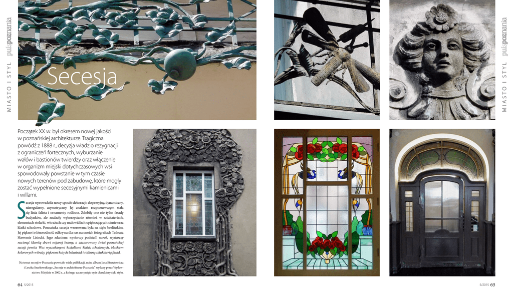 M iasto i styl M iasto i styl Secesja Początek XX w. był okresem nowej jakości w poznańskiej architekturze. Tragiczna powódź z 1888 r., decyzja władz o rezygnacji z ograniczeń fortecznych, wyburzanie wałów i bastionów twierdzy oraz włączenie w organizm miejski dotychczasowych wsi spowodowały powstanie w tym czasie nowych terenów pod zabudowę, które mogły zostać wypełnione secesyjnymi kamienicami i willami. S ecesja wprowadziła nowy sposób dekoracji: ekspresyjny, dynamiczny, nieregularny, asymetryczny. Jej znakiem rozpoznawczym stała się linia falista i ornamenty roślinne. Zdobiły one nie tylko fasady budynków, ale znalazły wykorzystanie również w sztukateriach, elementach stolarki, witrażach czy malowidłach upiększających sienie oraz klatki schodowe. Poznańska secesja wzorowana była na stylu berlińskim. Jej piękno i różnorodność odkrywa dla nas na swoich fotografiach Tadeusz Sławomir Lisiecki. Jego zdaniem: wystarczy podnieść wzrok, wystarczy nacisnąć klamkę drzwi mijanej bramy, a zaczarowany świat poznańskiej secesji powita Was wyszukanymi kształtami klatek schodowych, blaskiem kolorowych witraży, pięknem kutych balustrad i roślinną sztukaterią fasad. Na temat secesji w Poznaniu powstało wiele publikacji, m.in. album Jana Skuratowicza i Leszka Szurkowskiego „Secesja w architekturze Poznania” wydany przez Wydawnictwo Miejskie w 2002 r., z którego zaczerpnięto opis charakterystyki stylu. 64 5/2015 5/2015 65