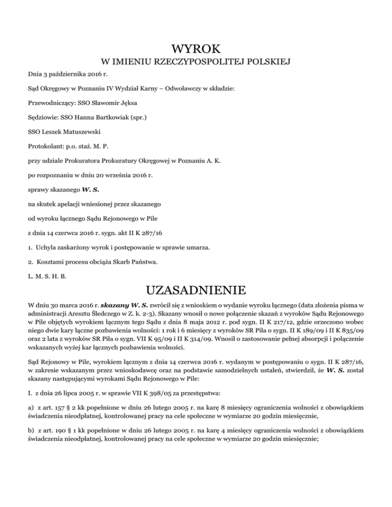 WYROK W IMIENIU RZECZYPOSPOLITEJ POLSKIEJ Dnia 3 października 2016 r. Sąd Okręgowy w Poznaniu IV Wydział Karny – Odwoławczy w składzie: Przewodniczący: SSO Sławomir Jęksa Sędziowie: SSO Hanna Bartkowiak (spr.) SSO Leszek Matuszewski Protokolant: p.o. staż. M. P. przy udziale Prokuratora Prokuratury Okręgowej w Poznaniu A. K. po rozpoznaniu w dniu 20 września 2016 r. sprawy skazanego W. S. na skutek apelacji wniesionej przez skazanego od wyroku łącznego Sądu Rejonowego w Pile z dnia 14 czerwca 2016 r. sygn. akt II K 287/16 1. Uchyla zaskarżony wyrok i postępowanie w sprawie umarza. 2. Kosztami procesu obciąża Skarb Państwa. L. M. S. H. B. UZASADNIENIE W dniu 30 marca 2016 r. skazany W. S. zwrócił się z wnioskiem o wydanie wyroku łącznego (data złożenia pisma w administracji Aresztu Śledczego w Z. k. 2-3). Skazany wnosił o nowe połączenie skazań z wyroków Sądu Rejonowego w Pile objętych wyrokiem łącznym tego Sądu z dnia 8 maja 2012 r. pod sygn. II K 217/12, gdzie orzeczono wobec niego dwie kary łączne pozbawienia wolności: 1 rok i 6 miesięcy z wyroków SR Piła o sygn. II K 189/09 i II K 835/09 oraz 2 lata z wyroków SR Piła o sygn. VII K 95/09 i II K 314/09. Wnosił o zastosowanie pełnej absorpcji i połączenie wskazanych wyżej kar łącznych pozbawienia wolności. Sąd Rejonowy w Pile, wyrokiem łącznym z dnia 14 czerwca 2016 r. wydanym w postępowaniu o sygn. II K 287/16, w zakresie wskazanym przez wnioskodawcę oraz na podstawie samodzielnych ustaleń, stwierdził, że W. S. został skazany następującymi wyrokami Sądu Rejonowego w Pile: I. z dnia 26 lipca 2005 r. w sprawie VII K 398/05 za przestępstwa: a) z art. 157 § 2 kk popełnione w dniu 26 lutego 2005 r. na karę 8 miesięcy ograniczenia wolności z obowiązkiem świadczenia nieodpłatnej, kontrolowanej pracy na cele społeczne w wymiarze 20 godzin miesięcznie, b) z art. 190 § 1 kk popełnione w dniu 26 lutego 2005 r. na karę 4 miesięcy ograniczenia wolności z obowiązkiem świadczenia nieodpłatnej, kontrolowanej pracy na cele społeczne w wymiarze 20 godzin miesięcznie; powyższe kary ograniczenia wolności połączono i orzeczono karę łączną 10 miesięcy ograniczenia wolności z obowiązkiem świadczenia nieodpłatnej, kontrolowanej pracy na cele społeczne w wymiarze 20 godzin miesięcznie; I. z dnia 15 kwietnia 2009 r. w sprawie VII K 95/09 za przestępstwa: a) z art. 158 § 1 kk i art. 157 § 2 kk w zw. z art. 11 § 2 kk popełnione w dniu 4 sierpnia 2007 r. na karę 6 miesięcy pozbawienia wolności, b) z art. 157 § 2 kk popełnione w dniu 9 kwietnia 2007 r. na karę 5 miesięcy pozbawienia wolności, c) z art. 190 § 1 kk popełnione w dniu 26 lipca 2007 r. na karę 5 miesięcy pozbawienia wolności, d) z art. 288 § 2 kk popełnione w dniu 4 sierpnia 2007 r. na karę 3 miesięcy pozbawienia wolności; powyższe kary pozbawienia wolności połączono i orzeczono karę łączną 1 roku pozbawienia wolności z warunkowym zawieszeniem jej wykonania na okres 3 lat tytułem próby, oddano skazanego pod dozór kuratora sądowego, zobowiązano do powstrzymania się od nadużywania alkoholu - prawomocnym postanowieniem Sądu Rejonowego w Pile z dnia 14 kwietnia 2010 r. zarządzono wykonanie kary pozbawienia wolności; III. z dnia 21 października 2009 r. w sprawie II K 189/09 za przestępstwa: a) z art. 191 § 2 kk popełnione w dniu 18 kwietnia 2009 r. na karę 1 roku pozbawienia wolności, b) z art. 244 kk popełnione w dniu 18 kwietnia 2009 r. na karę 5 miesięcy pozbawienia wolności; powyższe kary pozbawienia wolności połączono i orzeczono karę łączną 1 roku i 2 miesięcy pozbawienia wolności z warunkowym zawieszeniem jej wykonania na okres 5 lat tytułem próby, oddano skazanego pod dozór kuratora sądowego -prawomocnym postanowieniem Sądu Rejonowego w Pile z dnia 14 kwietnia 2010 r. zarządzono wykonanie kary pozbawienia wolności; IV. z dnia 17 listopada 2009 r. w sprawie II K 835/09 za przestępstwa: a) z art. 288 § 1 kk popełnione w okresie od 17 do 25 sierpnia 2009 r. na karę 4 miesięcy pozbawienia wolności, b) z art. 244 kk popełnione w okresie od 17 do 25 sierpnia 2009 r. na karę 3 miesięcy pozbawienia wolności; powyższe kary pozbawienia wolności połączono i orzeczono karę łączną 6 miesięcy pozbawienia wolności z warunkowym zawieszeniem jej wykonania na okres 2 lat tytułem próby, orzeczono wobec skazanego karę 50 stawek dziennych grzywny po 20 złotych - prawomocnym postanowieniem Sądu Rejonowego w Pile z dnia 14 września 2010 r. zarządzono wykonanie kary pozbawienia wolności; wyrokiem łącznym Sądu Rejonowego w Pile z dnia 8 maja 2012 r. w sprawie II K 217/12 połączono kary pozbawienia wolności orzeczone wyrokami Sądu Rejonowego w Pile w sprawach II K 189/09 oraz II K 835/09 i orzeczono karę łączną 1 roku i 6 miesięcy pozbawienia wolności; V. z dnia 29 stycznia 2010 r. w sprawie II K 314/09 za przestępstwa: a) z art. 158 § 1 kk popełnione w dniu 19 maja 2007 r. na karę 8 miesięcy pozbawienia wolności, b) z art. 158 § 1 kk popełnione w dniu 18 maja 2007 r. na karę 6 miesięcy pozbawienia wolności, c) z art. 160 § 1 kk popełnione w dniu 19 maja 2007 r. na karę 8 miesięcy pozbawienia wolności, d) z art. 157 § 3 kk popełnione w dniu 19 maja 2007 r. na karę 4 miesięcy pozbawienia wolności; powyższe kary pozbawienia wolności połączono i orzeczono karę łączną 1 roku i 6 miesięcy pozbawienia wolności; wyrokiem łącznym Sądu Rejonowego w Pile z dnia 8 maja 2012 r. w sprawie II K 217/12 połączono kary pozbawienia wolności orzeczone wyrokami Sądu Rejonowego w Pile w sprawach VII K 95/09 oraz II K 314/09 i orzeczono karę łączną 2 lat pozbawienia wolności; VI. z dnia 29 stycznia 2014 r. w sprawie II K 1222/13 za przestępstwo z art. 286 § 1 kk i art. 270 § 1 kk i art. 297 § 1 kk w zw. z art. 11 § 2 kk popełnione w dniu 17 lipca 2009 r. na karę 1 roku i 2 miesięcy pozba