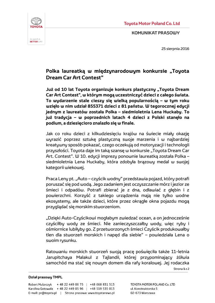 25 sierpnia 2016 Polka laureatką w międzynarodowym konkursie „Toyota Dream Car Art Contest” Już od 10 lat Toyota organizuje konkurs plastyczny „Toyota Dream Car Art Contest”, w którym mogą uczestniczyć dzieci z całego świata. To wydarzenie stale cieszy się wielką popularnością – w tym roku wzięło w nim udział 855371 dzieci z 81 państw. W tegorocznej edycji jednym z laureatów została Polka – siedmioletnia Lena Huckaby. To już tradycja – w poprzednich latach 4 dzieci z Polski stanęło na podium, a dziesięcioro znalazło się w finale. Jak co roku dzieci z kilkudziesięciu krajów na świecie miały okazję wyrazić poprzez sztukę plastyczną swoje marzenia i w najbardziej kreatywny sposób pokazać, czego oczekują od motoryzacji i technologii przyszłości. Toyota daje im taką szansę w konkursie „Toyota Dream Car Art. Contest”. W 10. edycji imprezy ponownie laureatką została Polka – siedmioletnia Lena Huckaby, która zdobyła brązowy medal w swojej kategorii wiekowej. Praca Leny pt. „Auto – czyścik wodny” przedstawia pojazd, który potrafi poruszać się pod wodą. Jego zadaniem jest oczyszczanie mórz i jezior ze śmieci i odpadów. Potrafi zbierać je z dna, odławiać z głębin i z powierzchni. Korzyść z takiego urządzenia mają nie tylko wodne ekosystemy, ale także dzieci, które przez okrągłe okna pojazdu mogą przyglądać się morskim stworzeniom. „Dzięki Auto-Czyścikowi mogłabym zwiedzać ocean, a on jednocześnie czyściłby wody ze śmieci. Nie zanieczyszczałby wody, więc ryby i ośmiornice lubiłyby go. Z przetworzonych śmieci Czyścik produkowałby tlen dla stworzeń morskich i napęd dla siebie” – powiedziała Lena o swoim rysunku. Ratowaniu morskich stworzeń swoją pracę poświęciła także 11-letnia Jarupitchaya Malakul z Tajlandii, której przypominający żółwia samochód ma stać się nowym domem dla rafy koralowej. Jej rodaczka Strona 1 z 2 Phakwaran Kaewkhao (7 lat) narysowała samochód-dinozaura gaszący pożary. Tajemniczy pojazd Brazylijki Gabriele Castro de Sousa poddaje rzeczywistość metamorfozie jak ze snu. Wszyscy troje otrzymali złote medale w swoich kategoriach wiekowych. Akio Toyoda, prezydent Toyota Motor Corporation, przyznał nagrodę specjalną sześcioletniej Elinkanika Phat z Kambodży za samochód przyjaźni, napędzany szczerością. Lena odebrała nagrodę wraz z 29 pozostałymi Laureatami podczas wczorajszej ceremonii w Tokio. Był to punkt kulminacyjny pięciodniowej podróży do Japonii, którą młoda artystka odbyła pod opieką rodziców. Dziewczynka jest piątym dzieckiem z Polski, które zajęło w konkursie Toyoty jedno z trzech pierwszych miejsc w swojej grupie wiekowej. To nie koniec sukcesów Polaków – w ciągu 6 ostatnich lat dziesięcioro dzieci zdobyło tytuł Finalisty międzynarodowego. W tym roku w polskiej edycji konkursu wzięło udział 4245 prac zgłoszonych przez osoby indywidualne oraz przez szkoły. W organizację przedsięwzięcia zaangażowały się 34 stacje dealerskie, Toyota Motor Poland oraz dwie fabryki Toyoty w Wałbrzychu i Jelczu-Laskowicach. Strona 2 z 2