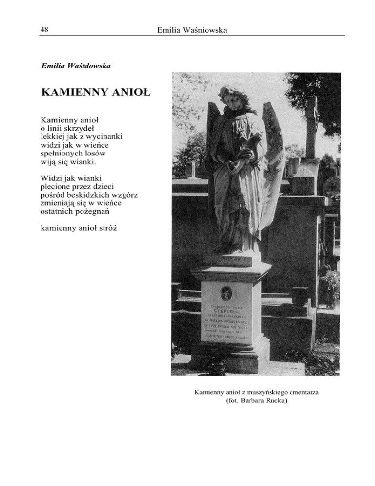 48 Emilia Waśniowska Emilia Waśtdowska KAMIENNY ANIOŁ Kamienny anioł o linii skrzydeł lekkiej jak z wycinanki widzi jak w wieńce spełnionych losów wiją się wianki. Widzi jak wianki plecione przez dzieci pośród beskidzkich wzgórz zmieniają się w wieńce ostatnich pożegnań kamienny anioł stróż Kamienny anioł z muszyńskiego cmentarza (fot. Barbara Rucka)