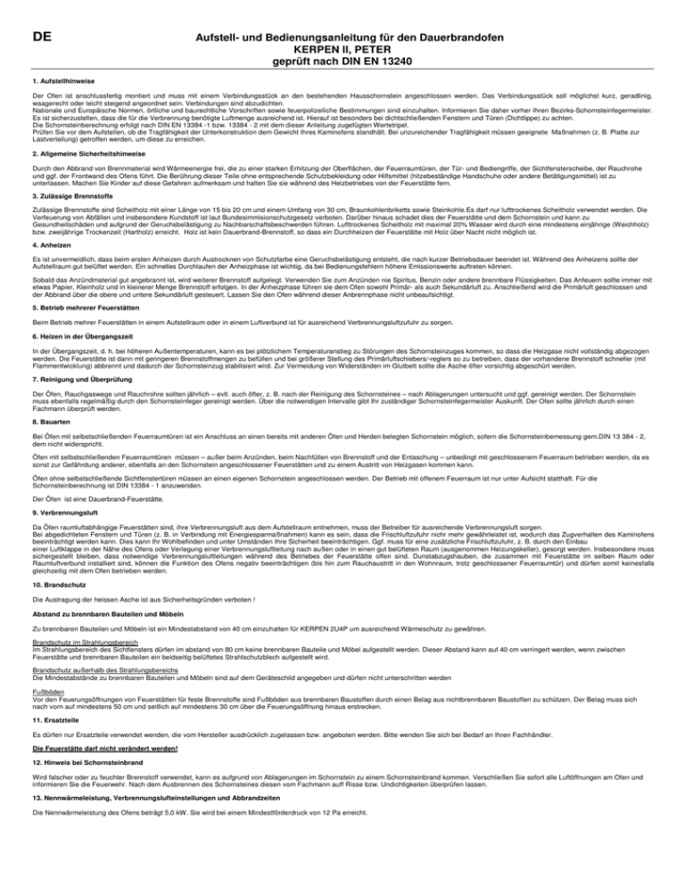 DE Aufstell- und Bedienungsanleitung für den Dauerbrandofen KERPEN II, PETER geprüft nach DIN EN 13240 1. Aufstellhinweise Der Ofen ist anschlussfertig montiert und muss mit einem Verbindungsstück an den bestehenden Hausschornstein angeschlossen werden. Das Verbindungsstück soll möglichst kurz, geradlinig, waagerecht oder leicht steigend angeordnet sein. Verbindungen sind abzudichten. Nationale und Europäische Normen, örtliche und baurechtliche Vorschriften sowie feuerpolizeiliche Bestimmungen sind einzuhalten. Informieren Sie daher vorher Ihren Bezirks-Schornsteinfegermeister. Es ist sicherzustellen, dass die für die Verbrennung benötigte Luftmenge ausreichend ist. Hierauf ist besonders bei dichtschließenden Fenstern und Türen (Dichtlippe) zu achten. Die Schornsteinberechnung erfolgt nach DIN EN 13384 -1 bzw. 13384 - 2 mit dem dieser Anleitung zugefügten Wertetripel. Prüfen Sie vor dem Aufstellen, ob die Tragfähigkeit der Unterkonstruktion dem Gewicht Ihres Kaminofens standhält. Bei unzureichender Tragfähigkeit müssen geeignete Maßnahmen (z. B. Platte zur Lastverteilung) getroffen werden, um diese zu erreichen. 2. Allgemeine Sicherheitshinweise Durch den Abbrand von Brennmaterial wird Wärmeenergie frei, die zu einer starken Erhitzung der Oberflächen, der Feuerraumtüren, der Tür- und Bediengriffe, der Sichtfensterscheibe, der Rauchrohe und ggf. der Frontwand des Ofens führt. Die Berührung dieser Teile ohne entsprechende Schutzbekleidung oder Hilfsmittel (hitzebeständige Handschuhe oder andere Betätigungsmittel) ist zu unterlassen. Machen Sie Kinder auf diese Gefahren aufmerksam und halten Sie sie während des Heizbetriebes von der Feuerstätte fern. 3. Zulässige Brennstoffe Zulässige Brennstoffe sind Scheitholz mit einer Länge von 15 bis 20 cm und einem Umfang von 30 cm, Braunkohlenbriketts sowie Steinkohle.Es darf nur lufttrockenes Scheitholz verwendet werden. Die Verfeuerung von Abfällen und insbesondere Kundstoff ist laut Bundesimmisionschutzgesetz verboten. Darüber hinaus schadet dies der Feuerstätte und dem Schornstein und kann zu Gesundheitschäden und aufgrund der Geruchsbelästigung zu Nachbarschaftsbeschwerden führen. Lufttrockenes Scheitholz mit maximal 20% Wasser wird durch eine mindestens einjährige (Weichholz) bzw. zweijährige Trockenzeit (Hartholz) erreicht. Holz ist kein Dauerbrand-Brennstoff, so dass ein Durchheizen der Feuerstätte mit Holz über Nacht nicht möglich ist. 4. Anheizen Es ist unvermeidlich, dass beim ersten Anheizen durch Austrocknen von Schutzfarbe eine Geruchsbelästigung entsteht, die nach kurzer Betriebsdauer beendet ist. Während des Anheizens sollte der Aufstellraum gut belüftet werden. Ein schnelles Durchlaufen der Anheizphase ist wichtig, da bei Bedienungsfehlern höhere Emissionswerte auftreten können. Sobald das Anzündmaterial gut angebrannt ist, wird weiterer Brennstoff aufgelegt. Verwenden Sie zum Anzünden nie Spiritus, Benzin oder andere brennbare Flüssigkeiten. Das Anfeuern sollte immer mit etwas Papier, Kleinholz und in kleinerer Menge Brennstoff erfolgen. In der Anheizphase führen sie dem Ofen sowohl Primär- als auch Sekundärluft zu. Anschließend wird die Primärluft geschlossen und der Abbrand über die obere und untere Sekundärluft gesteuert. Lassen Sie den Ofen während dieser Anbrennphase nicht unbeaufsichtigt. 5. Betrieb mehrerer Feuerstätten Beim Betrieb mehrer Feuerstätten in einem Aufstellraum oder in einem Luftverbund ist für ausreichend Verbrennungsluftzufuhr zu sorgen. 6. Heizen in der Übergangszeit In der Übergangszeit, d. h. bei höheren Außentemperaturen, kann es bei plötzlichem Temperaturanstieg zu Störungen des Schornsteinzuges kommen, so dass die Heizgase nicht vollständig abgezogen werden. Die Feuerstätte ist dann mit geringeren Brennstoffmengen zu befüllen und bei größerer Stellung des Primärluftschiebers/-reglers so zu betreiben, dass der vorhandene Brennstoff schneller (mit Flammentwicklung) abbrennt und dadurch der Schornsteinzug stabilisiert wird. Zur Vermeidung von Widerständen im Glutbett sollte die Asche öfter vorsichtig abgeschürt werden. 7. Reinigung und Überprüfung Der Öfen, Rauchgaswege und Rauchrohre sollten jährlich – evtl. auch öfter, z. B. nach der Reinigung des Schornsteines – nach Ablagerungen untersucht und ggf. gereinigt werden. Der Schornstein muss ebenfalls regelmäßig durch den Schornsteinfeger gereinigt werden. Über die notwendigen Intervalle gibt Ihr zuständiger Schornsteinfegermeister Auskunft. Der Ofen sollte jährlich durch einen Fachmann überprüft werden. 8. Bauarten Bei Öfen mit selbstschließenden Feuerraumtüren ist ein Anschluss an einen bereits mit anderen Öfen und Herden belegten Schornstein möglich, sofern die Schornsteinbemessung gem.DIN 13 384 - 2, dem nicht widerspricht. Öfen mit selbstschließenden Feuerraumtüren müssen – außer beim Anzünden, beim Nachfüllen von Brennstoff und der Entaschung – unbedingt mit geschlossenem Feuerraum betrieben werden, da es sonst zur Gefährdung anderer, ebenfalls an den Schornstein angeschlossener Feuerstätten und zu einem Austritt von Heizgasen kommen kann. Öfen ohne selbstschließende Sichtfenstertüren müssen an einen eigenen Schornstein angeschlossen werden. Der Betrieb mit offenem Feuerraum ist nur unter Aufsicht statthaft. Für die Schornsteinberechnung ist DIN 13384 - 1 anzuwenden. Der Öfen ist eine Dauerbrand-Feuerstätte. 9. Verbrennungsluft Da Öfen raumluftabhängige Feuerstätten sind, ihre Verbrennungsluft aus dem Aufstellraum entnehmen, muss der Betreiber für ausreichende Verbrennungsluft sorgen. Bei abgedichteten Fenstern und Türen (z. B. in Verbindung mit Energiesparmaßnahmen) kann es sein, dass die Frischluftzufuhr nichr mehr gewährleistet ist, wodurch das Zugverhalten des Kaminofens beeinträchtigt werden kann. Dies kann Ihr Wohlbefinden und unter Umständen Ihre Sicherheit beeinträchtigen. Ggf. muss für eine zusätzliche Frischluftzufuh