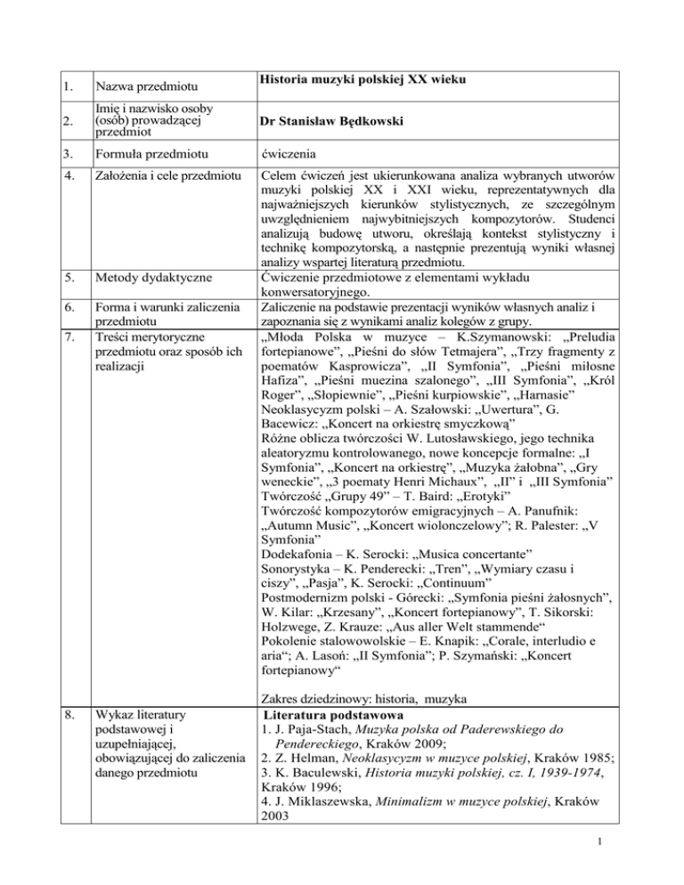 Historia muzyki polskiej XX wieku 1. Nazwa przedmiotu 2. Imię i nazwisko osoby (osób) prowadzącej przedmiot Dr Stanisław Będkowski 3. Formuła przedmiotu ćwiczenia 4. Założenia i cele przedmiotu 5. Metody dydaktyczne 6. Forma i warunki zaliczenia przedmiotu Treści merytoryczne przedmiotu oraz sposób ich realizacji Celem ćwiczeń jest ukierunkowana analiza wybranych utworów muzyki polskiej XX i XXI wieku, reprezentatywnych dla najważniejszych kierunków stylistycznych, ze szczególnym uwzględnieniem najwybitniejszych kompozytorów. Studenci analizują budowę utworu, określają kontekst stylistyczny i technikę kompozytorską, a następnie prezentują wyniki własnej analizy wspartej literaturą przedmiotu. Ćwiczenie przedmiotowe z elementami wykładu konwersatoryjnego. Zaliczenie na podstawie prezentacji wyników własnych analiz i zapoznania się z wynikami analiz kolegów z grupy. „Młoda Polska w muzyce – K.Szymanowski: „Preludia fortepianowe”, „Pieśni do słów Tetmajera”, „Trzy fragmenty z poematów Kasprowicza”, „II Symfonia”, „Pieśni miłosne Hafiza”, „Pieśni muezina szalonego”, „III Symfonia”, „Król Roger”, „Słopiewnie”, „Pieśni kurpiowskie”, „Harnasie” Neoklasycyzm polski – A. Szałowski: „Uwertura”, G. Bacewicz: „Koncert na orkiestrę smyczkową” Różne oblicza twórczości W. Lutosławskiego, jego technika aleatoryzmu kontrolowanego, nowe koncepcje formalne: „I Symfonia”, „Koncert na orkiestrę”, „Muzyka żałobna”, „Gry weneckie”, „3 poematy Henri Michaux”, „II” i „III Symfonia” Twórczość „Grupy 49” – T. Baird: „Erotyki” Twórczość kompozytorów emigracyjnych – A. Panufnik: „Autumn Music”, „Koncert wiolonczelowy”; R. Palester: „V Symfonia” Dodekafonia – K. Serocki: „Musica concertante” Sonorystyka – K. Penderecki: „Tren”, „Wymiary czasu i ciszy”, „Pasja”, K. Serocki: „Continuum” Postmodernizm polski - Górecki: „Symfonia pieśni żałosnych”, W. Kilar: „Krzesany”, „Koncert fortepianowy”, T. Sikorski: Holzwege, Z. Krauze: „Aus aller Welt stammende“ Pokolenie stalowowolskie – E. Knapik: „Corale, interludio e aria“; A. Lasoń: „II Symfonia”; P. Szymański: „Koncert fortepianowy“ 7. 8. Wykaz literatury podstawowej i uzupełniającej, obowiązującej do zaliczenia danego przedmiotu Zakres dziedzinowy: historia, muzyka Literatura podstawowa 1. J. Paja-Stach, Muzyka polska od Paderewskiego do Pendereckiego, Kraków 2009; 2. Z. Helman, Neoklasycyzm w muzyce polskiej, Kraków 1985; 3. K. Baculewski, Historia muzyki polskiej, cz. I, 1939-1974, Kraków 1996; 4. J. Miklaszewska, Minimalizm w muzyce polskiej, Kraków 2003 1 5. I. Lindstedt: Dodekafonia i serializm w twórczości kompozytorów polskich XX wieku, Lublin 2001 6. P. Strzelecki: „Nowy romantyzm” w twórczości kompozytorów polskich po roku 1975, Kraków 2006 Literatura uzupełniająca 1. T. A. Zieliński: Karol Szymanowski, Kraków 1997 2. Księga sesji naukowej poświęconej twórczości Karola Szymanowskiego, Warszawa 23-28 marca 1962, Warszawa 1964 3. Z. Helman (red.): Pieśń w twórczości Szymanowskiego i jemu współczesnych, Kraków 2001 4. M. Gąsiorowska: Bacewicz, Kraków 1999 5. Ch. B. Rae: Muzyka Lutosławskiego, Warszawa 1996 6. D. Gwizdalanka, K. Meyer: Lutosławski. Droga do dojrzałości, Kraków 2003 7. D. Gwizdalanka, K. Meyer: Lutosławski. Droga do mistrzostwa, Kraków 2004 8. A. Thomas: Górecki, Kraków 1998 9. M. Tomaszewski: Krzysztof Penderecki i jego muzyka, Kraków 1994 10. R. Chłopicka: Krzysztof Penderecki między sacrum a profanum. Studia nad twórczością wokalno-instrumentalną, Kraków 2000 11. T. A. Zieliński: Dramat instrumentalny Pendereckiego, Kraków 2003 12. M. Tomaszewski, E. Siemdaj (red.): Krzysztof Penderecki. Music in the Intertextual Era, Kraków 2005 (także w jęz. pol.) 13. Z. Helman: Roman Palester, Kraków 1999 14. T. Kaczyński: Andrzej Panufnik i jego muzyka, Warszawa 1994 15. B. Bolesławska: Panufnik, Kraków 2001 16. E. Siemdaj: Andrzej Panufnik. Twórczość symfoniczna, Kraków 2003 17. J. Paja-Stach (red.): Andrzej Panufnik’s Music and Its Reception, Kraków 2003 18. „Muzyka” 1984 nr 1-2 (nr specjalny poświęcony T. Bairdowi) 19. T. A. Zieliński: O twórczości Kazimierza Serockiego, Kraków 1985 20. S. Będkowski: Serie w twórczości K. Serockiego, „Muzyka” 1996 nr 1. 21. L. Polony: Kilar. Żywioł i modlitwa, Kraków 2005 22. T. A. Zieliński: Spotkania z muzyką współczesną, Kraków 1977 23. J. Cegiełła: Szkice do autoportretu polskiej muzyki współczesnej, Kraków 1976 2