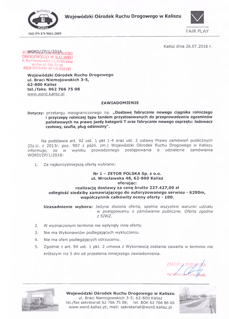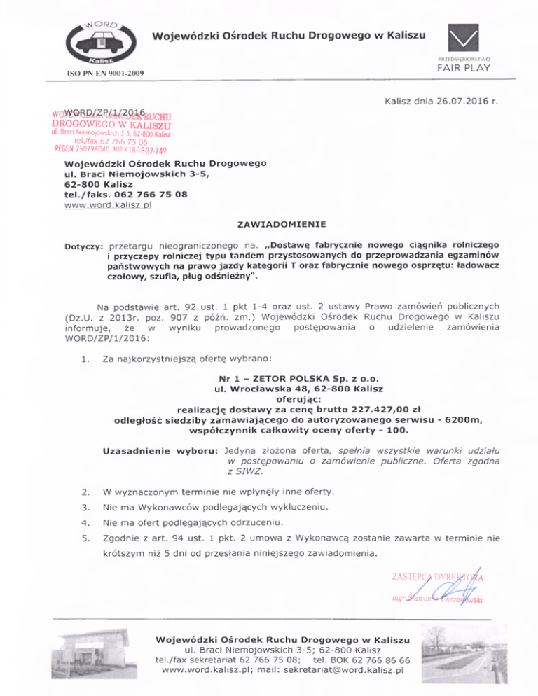 x k i Wojewódzki Ośrodek Ruchu Drogowego w Kaliszu V PRZEDSIĘBIORSTWO FAIR PLAY ISO PN EN 9001-2009 Kalisz dnia 26.07.2016 r. W0W® DROGOWEGO W KALISZU ul. Braci Niemojowskich 3-5,62-800 Kalisz tel./fax 62 766 75 08 REGON 25079^040 NIP ^18-18-37-749 Wojewódzki Ośrodek Ruchu Drogowego ul. Braci Niem ojowskich 3-5, 62-800 Kalisz tel./faks. 062 766 75 08 www.word.kalisz.pl ZAWIADOMIENIE Dotyczy: przetargu nieograniczonego na. „Dostawę fabrycznie nowego ciągnika rolniczego i przyczepy rolniczej typu tandem przystosowanych do przeprowadzania egzaminów państwowych na prawo jazdy kategorii T oraz fabrycznie nowego osprzętu: ładowacz czołowy, szufla, pług odśnieżny". Na podstawie art. 92 ust. 1 pkt 1-4 oraz ust. 2 ustawy Prawo zamówień publicznych (Dz.U. z 2013r. poz. 907 z późń. zm.) Wojewódzki Ośrodek Ruchu Drogowego w Kaliszu informuje, że w wyniku prowadzonego postępowania o udzielenie zamówienia WORD/ZP/1/2016: 1. Za najkorzystniejszą ofertę wybrano: Nr 1 - ZETOR POLSKA Sp. z 0 .0 . ul. Wrocławska 48, 62-800 Kalisz oferując: realizację dostawy za cenę brutto 227.427,00 zł odległość siedziby zamawiającego do autoryzowanego serwisu - 6200m, współczynnik całkowity oceny oferty - 100. Uzasadnienie wyboru: Jedyna złożona oferta, spełnia wszystkie warunki udziału w postępowaniu o zam ówienie publiczne. Oferta zgodna z SIWZ. 2. W wyznaczonym terminie nie wpłynęły inne oferty. 3. Nie ma Wykonawców podlegających wykluczeniu. 4. Nie ma ofert podlegających odrzuceniu. 5. Zgodnie z art. 94 ust. 1 pkt. 2 umowa z Wykonawcą zostanie zawarta w terminie nie krótszym niż 5 dni od przesłania niniejszego zawiadomienia. ZASTĘPCĄ DYREWORK mgr (Suitlionw^Ćnrza rnfwski _, n w u trr W ojewódzki Ośrodek Ruchu Drogowego w Kaliszu ul. Braci Niemojowskich 3-5; 62-800 Kalisz tel./fax sekretariat 62 766 75 08; tel. BOK 62 766 86 66 ww w .w ord.kalisz.pl; mail: [email protected] IB