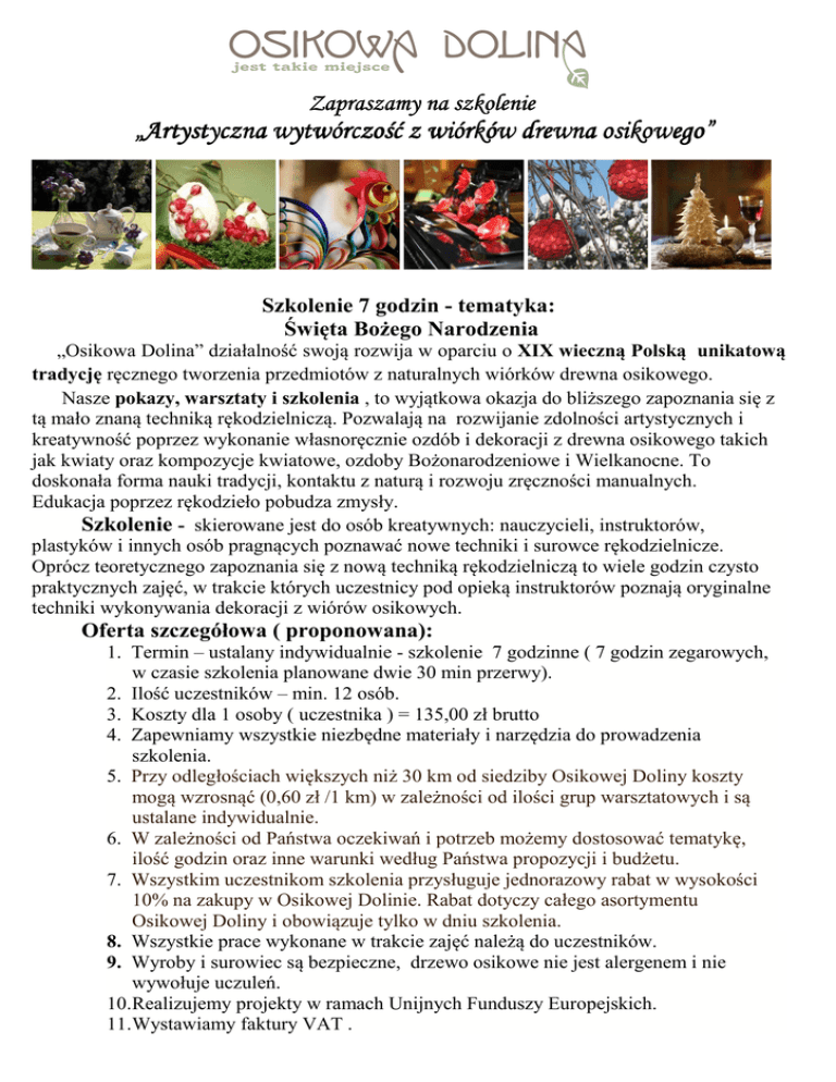 Zapraszamy na szkolenie „Artystyczna wytwórczość z wiórków wiórków drewna osikowego” osikowego” Szkolenie 7 godzin - tematyka: Święta Bożego Narodzenia „Osikowa Dolina” działalność swoją rozwija w oparciu o XIX wieczną Polską unikatową tradycję ręcznego tworzenia przedmiotów z naturalnych wiórków drewna osikowego. Nasze pokazy, warsztaty i szkolenia , to wyjątkowa okazja do bliższego zapoznania się z tą mało znaną techniką rękodzielniczą. Pozwalają na rozwijanie zdolności artystycznych i kreatywność poprzez wykonanie własnoręcznie ozdób i dekoracji z drewna osikowego takich jak kwiaty oraz kompozycje kwiatowe, ozdoby Bożonarodzeniowe i Wielkanocne. To doskonała forma nauki tradycji, kontaktu z naturą i rozwoju zręczności manualnych. Edukacja poprzez rękodzieło pobudza zmysły. Szkolenie - skierowane jest do osób kreatywnych: nauczycieli, instruktorów, plastyków i innych osób pragnących poznawać nowe techniki i surowce rękodzielnicze. Oprócz teoretycznego zapoznania się z nową techniką rękodzielniczą to wiele godzin czysto praktycznych zajęć, w trakcie których uczestnicy pod opieką instruktorów poznają oryginalne techniki wykonywania dekoracji z wiórów osikowych. Oferta szczegółowa ( proponowana): 1. Termin – ustalany indywidualnie - szkolenie 7 godzinne ( 7 godzin zegarowych, w czasie szkolenia planowane dwie 30 min przerwy). 2. Ilość uczestników – min. 12 osób. 3. Koszty dla 1 osoby ( uczestnika ) = 135,00 zł brutto 4. Zapewniamy wszystkie niezbędne materiały i narzędzia do prowadzenia szkolenia. 5. Przy odległościach większych niż 30 km od siedziby Osikowej Doliny koszty mogą wzrosnąć (0,60 zł /1 km) w zależności od ilości grup warsztatowych i są ustalane indywidualnie. 6. W zależności od Państwa oczekiwań i potrzeb możemy dostosować tematykę, ilość godzin oraz inne warunki według Państwa propozycji i budżetu. 7. Wszystkim uczestnikom szkolenia przysługuje jednorazowy rabat w wysokości 10% na zakupy w Osikowej Dolinie. Rabat dotyczy całego asortymentu Osikowej Doliny i obowiązuje tylko w dniu szkolenia. 8. Wszystkie prace wykonane w trakcie zajęć należą do uczestników. 9. Wyroby i surowiec są bezpieczne, drzewo osikowe nie jest alergenem i nie wywołuje uczuleń. 10.Realizujemy projekty w ramach Unijnych Funduszy Europejskich. 11.Wystawiamy faktury VAT . Szkolenie 7 godzin - tematyka: Święta Bożego Narodzenia Uczestnicy szkolenia wykonają następujące dekoracje: 1. Osikowe Aniołki 2. Dzwonki Delja 3. Bombka Obiata 4. Osikowa Choinka 5. Osikowe Gwiazdki 6. Osikowa Kartka Świąteczna Zapraszamy do współpracy. Roman Noszczyk 42-350 Koziegłowy, ul. Żarecka 52, Tel. +48 34 366-14-95, 601-933-445 www.osikowadolina.pl, [email protected]