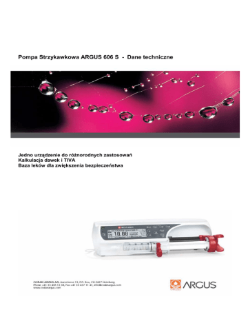 Pompa Strzykawkowa ARGUS 606 S - Dane techniczne Jedno urządzenie do róŜnorodnych zastosowań Kalkulacja dawek i TIVA Baza leków dla zwiększenia bezpieczeństwa Pompa Strzykawkowa A606 S DANE TECHNICZNE Główne parametry Zastosowanie Jednostki Zakres szybkości dozowania Zakres objętości infuzji (VTBI) Zakres wyboru czasu infuzji Funkcja dozowania dawki uderzeniowej (Bolus) Szybkość dozowania dawki uderzeniowej Objętość dozowania dawki uderzeniowej Standardowe, Intensywna terapia, anestezja g, mg, µg, ng 0.1 – 1’100 ml/h 0.1 – 999.9 ml 1 min – 99 h 59 min ręczna lub automatyczna 0.1 – 1’100 ml/h 0.1 – 50 ml Ustawianie szybkości napełniania 0.1 – 1’100 ml/h Dokładność Dawka podtrzymująca KVO Keep Vein Open rate Historia zdarzeń, Interfejs Historia zdarzeń Interfejs +/- 2% 0.1 – 5.0 ml/h w zaleŜności od typu strzykawki konfiguracja zaleŜna od zakresu szybkości przepływu, moŜliwe wyłączenie 1000 zdarzeń ilustrowanych graficznie złącze szeregowe RS-232 (opcja: odizolowane galawiczne); moŜliwa sieć Ethernet moŜliwość podłączenia do systemu alarmowego personelu moŜliwe zwiększenie w ramach oprogramowania Podłączenie do Systemu Zarządzania Danymi Pacjenta wyświetlacz LC, rozmiar 100 x 29 mm, 240x64 piksele intuicyjne menu oprogramowanie ARGUS podświetlany, korygowanie jasności Alarm dla pielęgniarek Działanie Ekran Menu Konfiguracja Menu Strzykawki Bezpieczeństwo ObniŜenie ciśnienia (KVO) Alarmy Blokowanie danych Graniczna wartość ciśnienia okluzji Minimalizacja błędu przy programowaniu dawki Zasilanie Bateria Czas pracy Czas ładowania baterii Zasilanie sieciowe Zasilanie zewnętrzne Pobór mocy Specyfikacja Wymiar Obudowa Temperatura robocza Wilgotność względna Waga z baterią Serwis Zgodność IP-Protection Klasa ochrony Część stosowana Klasyfikacja MDD Regulacja, bezpieczeństwo energetyczne Zgodność elektromagnetyczna Certyfikaty Akcesoria dodatkowe Stacja dokująca Mocowanie Standard IV Kody kreskowe Oprogramowanie UWAGI TIVA, kalkulacja dawek leków, baza danych leków na h, min, kg w skokach co 0.1 ml/h w skokach co 0.1 ml w skokach co 1 min ustawienia dostosowane do potrzeb uŜytkownika, ARGUSrails programowalna bez przerywani przepływu w zaleŜności od rozmiaru strzykawki; programowalna bez przerywania przepływu w zaleŜności od rozmiaru strzykawki 24 V / 0.2 A; statyczny lub dynamiczny ustawienia regionalne, przegląd danych infuzji moŜliwość wprowadzenia ustawień dostosowanych do potrzeb uŜytkownika wszystkie główne marki w rozmiarach od 10-50/60 ml automatyczne uwolnienie ciśnienia po okluzji akustyczne i wzrokowe ilustracja opisowa i graficzna, lista poniŜej blokowanie numerycznym kodem 200-1200 mbar (mmHg, Kpa, cmH2O, Psi) w 11 skokach programowanych bez przerywania przepływu baza leków, 256 leków ustawionych do wgrania do pompy zapisywanie dawki leku, zapisane ustawienia, ARGUSrails (soft and hard), ustawienie dawki uderzeniowej, ustawienia techniczne NiMH 9 godzin przy 5 ml/h 6 godzin w opcji ‘stand by’ 230 VAC +/- 10%, 50-60 Hz 18-20 VDC / 0.3 A @ 20 VDC max. 12 VA bez podłączonego interfejsu opcjonalnie 115 VAC =/-10%, 50-60 Hz 320x100x180 mm (szer. x wys. x gł.) ASA 5°-40°C 20-90% bez kondensacji 2.2 kg Serwis co 24 miesiące bez zacisku tworzywo sztuczne o wysokiej jakości IPX2 II Typ CF IIb EN 60601 (-1-1 / -1-4 / -1-6 / -2-24) EN 61000-3 ( -2/-3), 60601-1-2 CE 0120 ochrona przed przeciekiem, 15°nachylenia A100 (5 strzykawek) lub A60 (3 strzykawki) - moŜliwość zestawienia z pompami infuzyjnymi wielofunkcyjne zaciski dwu słupkowe systemy zapewniające dodatkową stabilność czytnik kodów kreskowych, oprogramowanie do etykiet ARGUSservice ARGUSmedb wersja M: interfejs kodów kreskowych, alarm personelu, transfer danych; wersja P: zasilanie w energię mocowania sufitowe i standardowe moŜliwość mocowania 1 stacji dokującej A100 i jednej A60 uŜywane ze stacjami dokującymi A100 lub A60 program do konfiguracji baza leków z zastosowaniem ARGIUS rails CODAN ARGUS AG: ISO 9001, ISO 13485, Dyrektywa 93/42/EEC Alarmy (akustyczne i wzrokowe): Okluzja / prawie pusta strzykawka - pusta strzykawka / pompa nieuŜywana / koniec infuzji / strzykawka (wielkość, zła pozycja) / niski poziom naładowania akumulatora / rozładowany akumulator / błędy / erwis / awaria techniczna Wyświetlanie danych: Szybkość dozowania / objętość podana we wlewie (w ml) / objętość przeznaczona do wlewu (VTBI) / całkowita zaprogramowana objętość (w ml) / dotychczasowy czas trwania infuzji / czas pozostały / data infuzji/ pojemność akumulatora / poziom okluzji / rodzaj strzykawki / nazwa leku – jednostki / wykres ciśnienia / bateria / TIVA Producent: CODAN ARGUS AG Aarestrasse 13, CH-3627 Heimberg Szwajcaria Wyłączny Przedstawiciel w Polsce: Przedsiębiorstwo Techniki Medycznej „Anes-Med” Sp. z o.o. 01-381 Warszawa, ul. Powstańców Śląskich 44 Tel. Fax. E-mail URL: CENTRUM OBSŁUGI KLIENTA ANES-MED +48 022 213 83 97 [email protected] E-mail URL: http://www.anesmed.pl +41 33 438 13 38 +41 33 437 11 41 [email protected] http://www.codanargus.com PowyŜsze dane mogą ulegać zmianom bez powiadomienia. © CODAN ARGUS AG 15.330. February 2008