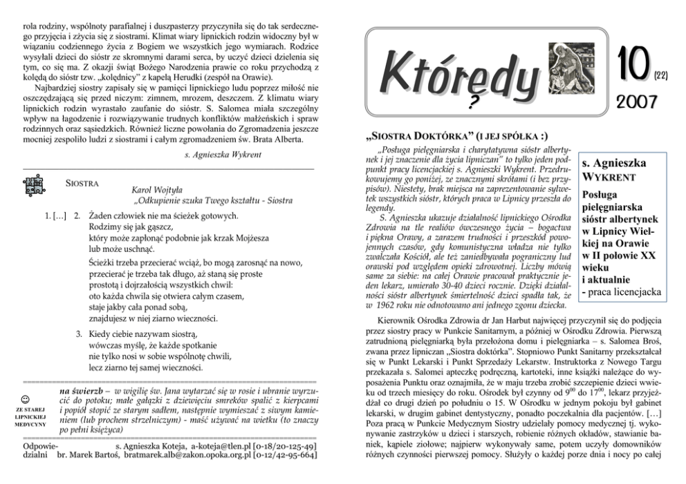 rola rodziny, wspólnoty parafialnej i duszpasterzy przyczyniła się do tak serdecznego przyjęcia i zżycia się z siostrami. Klimat wiary lipnickich rodzin widoczny był w wiązaniu codziennego życia z Bogiem we wszystkich jego wymiarach. Rodzice wysyłali dzieci do sióstr ze skromnymi darami serca, by uczyć dzieci dzielenia się tym, co się ma. Z okazji świąt Bożego Narodzenia prawie co roku przychodzą z kolędą do sióstr tzw. „kolędnicy” z kapelą Herudki (zespół na Orawie). Najbardziej siostry zapisały się w pamięci lipnickiego ludu poprzez miłość nie oszczędzającą się przed niczym: zimnem, mrozem, deszczem. Z klimatu wiary lipnickich rodzin wyrastało zaufanie do sióstr. S. Salomea miała szczególny wpływ na łagodzenie i rozwiązywanie trudnych konfliktów małżeńskich i spraw rodzinnych oraz sąsiedzkich. Również liczne powołania do Zgromadzenia jeszcze mocniej zespoliło ludzi z siostrami i całym zgromadzeniem św. Brata Alberta. s. Agnieszka Wykrent _________________________________________________________________ SIOSTRA Karol Wojtyła „Odkupienie szuka Twego kształtu - Siostra 1. […] 2. Żaden człowiek nie ma ścieżek gotowych. Rodzimy się jak gąszcz, który może zapłonąć podobnie jak krzak Mojżesza lub może uschnąć. Ścieżki trzeba przecierać wciąż, bo mogą zarosnąć na nowo, przecierać je trzeba tak długo, aż staną się proste prostotą i dojrzałością wszystkich chwil: oto każda chwila się otwiera całym czasem, staje jakby cała ponad sobą, znajdujesz w niej ziarno wieczności. 3. Kiedy ciebie nazywam siostrą, wówczas myślę, że każde spotkanie nie tylko nosi w sobie wspólnotę chwili, lecz ziarno tej samej wieczności. ======================================================================= ZE STAREJ LIPNICKIEJ MEDYCYNY na świerzb – w wigilię św. Jana wytarzać się w rosie i ubranie wyrzucić do potoku; małe gałązki z dziewięciu smreków spalić z kierpcami i popiół stopić ze starym sadłem, następnie wymieszać z siwym kamieniem (lub prochem strzelniczym) - maść używać na wietku (to znaczy po pełni księżyca) ======================================================================= Odpowies. Agnieszka Koteja, [email protected] [0-18/20-125-49] dzialni br. Marek Bartoś, [email protected] [0-12/42-95-664] Któredy ? 10 (22) 2007 „SIOSTRA DOKTÓRKA” (I JEJ SPÓŁKA :) „Posługa pielęgniarska i charytatywna sióstr albertynek i jej znaczenie dla życia lipniczan” to tylko jeden podpunkt pracy licencjackiej s. Agnieszki Wykrent. Przedrukowujemy go poniżej, ze znacznymi skrótami (i bez przypisów). Niestety, brak miejsca na zaprezentowanie sylwetek wszystkich sióstr, których praca w Lipnicy przeszła do legendy. S. Agnieszka ukazuje działalność lipnickiego Ośrodka Zdrowia na tle realiów ówczesnego życia – bogactwa i piękna Orawy, a zarazem trudności i przeszkód powojennych czasów, gdy komunistyczna władza nie tylko zwalczała Kościół, ale też zaniedbywała pograniczny lud orawski pod względem opieki zdrowotnej. Liczby mówią same za siebie: na całej Orawie pracował praktycznie jeden lekarz, umierało 30-40 dzieci rocznie. Dzięki działalności sióstr albertynek śmiertelność dzieci spadła tak, że w 1962 roku nie odnotowano ani jednego zgonu dziecka. s. Agnieszka WYKRENT Posługa pielęgniarska sióstr albertynek w Lipnicy Wielkiej na Orawie w II połowie XX wieku i aktualnie - praca licencjacka Kierownik Ośrodka Zdrowia dr Jan Harbut najwięcej przyczynił się do podjęcia przez siostry pracy w Punkcie Sanitarnym, a później w Ośrodku Zdrowia. Pierwszą zatrudnioną pielęgniarką była przełożona domu i pielęgniarka – s. Salomea Broś, zwana przez lipniczan „Siostra doktórka”. Stopniowo Punkt Sanitarny przekształcał się w Punkt Lekarski i Punkt Sprzedaży Lekarstw. Instruktorka z Nowego Targu przekazała s. Salomei apteczkę podręczną, kartoteki, inne książki należące do wyposażenia Punktu oraz oznajmiła, że w maju trzeba zrobić szczepienie dzieci wwieku od trzech miesięcy do roku. Ośrodek był czynny od 900 do 1700, lekarz przyjeżdżał co drugi dzień po południu o 15. W Ośrodku w jednym pokoju był gabinet lekarski, w drugim gabinet dentystyczny, ponadto poczekalnia dla pacjentów. […] Poza pracą w Punkcie Medycznym Siostry udzielały pomocy medycznej tj. wykonywanie zastrzyków u dzieci i starszych, robienie różnych okładów, stawianie baniek, kąpiele ziołowe; najpierw wykonywały same, potem uczyły domowników różnych czynności pierwszej pomocy. Służyły o każdej porze dnia i nocy po całej wiosce; jeśli zaszła taka potrzeba, szły do ciężko chorych. Ludzie przyjeżdżali furmankami po siostry, a jeżeli było blisko szły pieszo, zimą po wielkich śniegach. Pracy było dużo, chorych i potrzebujących coraz więcej. To zadecydowało o budowie nowego Ośrodka Zdrowia. Siostrze Salomei pomagała druga pielęgniarka zakonna. Z braku pielęgniarki w Jabłonce prawie cała Orawa korzystała z pracy sióstr albertynek. Siostra Salomea jako przełożona pielęgniarek pracowała w Ośrodku Zdrowia od 1956 do 1980 roku. W roku 1958 siostry udzieliły pomocy w Ośrodku 1223 osobom, nie licząc porad i pomocy w domu sióstr. […] Siostra Salomea swoją mądrością, fachowością i dobrocią zdobyła nie tylko serca lipnickiego i orawskiego ludu, ale zyskała podziw i uznanie u władz cywilnych. […]. W marcu 1960 roku do pracy w Ośrodku Zdrowia przyszła s. Lidia Gurgul. Wspaniale się uzupełniały z s. Salomeą. Były bardzo otwarte na Boga i ludzi. Ludzie mówili „nase lipnickie słonecka i anioły”. Siostry jeździły do wszystkich szkół szczepić dzieci i to prawie że na całej Orawie, pod drzwiami gabinetu bez przerwy były kolejki. Kiedy siostry wracały do swego zakonnego domu na „Górce”, do którego przeszły od Rozalii Pilarczyk w roku 1959, coraz więcej ludzi odwiedzał