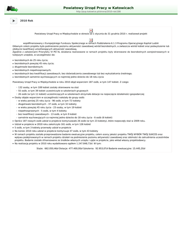 Powiatowy Urząd Pracy w Katowicach http://pup.katowice.pl/strona/2010-rok/186 2010 Rok Powiatowy Urząd Pracy w Międzychodzie w okresie od 1 stycznia do 31 grudnia 2010 r. realizował projekt współfinansowany z Europejskiego Funduszu Społecznego w ramach Poddziałania 6.1.3 Programu Operacyjnego Kapitał Ludzki Głównym celem projektu było podniesienie poziomu aktywności zawodowej wśród bezrobotnych, a zwłaszcza wśród kobiet oraz podwyższenie lub zdobycie kwalifikacji umożliwiających aktywność zawodową. Zgodnie z założeniami Priorytetu VI PO KL działania realizowane w ramach projektu były skierowane do bezrobotnych zarejestrowanych w tutejszym urzędzie, w szczególności do: ● bezrobotnych do 25 roku życia; ● bezrobotnych powyżej 45 roku życia; ● długotrwale bezrobotnych; ● bezrobotnych niepełnosprawnych; ● bezrobotnych bez kwalifikacji zawodowych, bez doświadczenia zawodowego lub bez wykształcenia średniego; ● bezrobotnych samotnie wychowujących co najmniej jedno dziecko do 18 roku życia Powiatowy Urząd Pracy w Międzychodzie w roku 2010 objął wsparciem 187 osób, w tym 147 kobiet. Z czego: ● ❍ 132 osoby, w tym 108 kobiet zostały skierowane na staż ❍ 55 osób, w tym 39 kobiet uczestniczyło w szkoleniach grupowych ❍ 26 osób (w tym 11 kobiet) uczestniczących w szkoleniach otrzymało dotacje na rozpoczęcie działalności gospodarczej Osoby objęte wsparciem w szczególności należały do grupy osób: ❍ w wieku poniżej 25 roku życia - 96 osób, w tym 72 kobiety ❍ długotrwale bezrobotnych - 37 osób, w tym 32 kobiety ❍ w wieku powyżej 45 roku życia - 23 osoby, w tym 19 kobiet ❍ niepełnosprawnych - 5 osób, w tym 4 kobiety ❍ bez kwalifikacji zawodowych - 13 osób, w tym 9 kobiet ❍ samotnie wychowujących co najmniej jedno dziecko do 18 roku życia - 6 osób (6 kobiet) ● Oprócz 187 nowych osób udział w projekcie kontynuowało 26 osób (w tym 23 kobiety), które rozpoczęły staż w 2009 roku. ● Udział w projekcie w 2010 roku zakończyło 161 osób, w tym 126 kobiet ● 5 osób, w tym 3 kobiety przerwały udział w projekcie ● Na koniec 2010 roku udział w projekcie kontynuuje 47 osób, w tym 43 kobiety ● ● W ramach projektu zostało przeprowadzone badanie ewaluacyjne projektu, celem oceny jakości projektu TWÓJ WYBÓR TWÓJ SUKCES oraz wpływu podejmowanych w ramach projektu działań na podniesienie poziomu aktywności zawodowej oraz zdolności do zatrudnienia uczestników projektu. Badanie zostało sfinansowane ze środków własnych urzędu i ujęte w projekcie, jako wkład własny projektodawcy. Na realizację projektu w 2010 roku wydatkowano ogółem 1.247.848,73zł. W tym: Staże: 662.050,46zł Dotacje: 477.400,00zł Szkolenia: 92.953,07zł Badanie ewaluacyjne: 15.445,20zł