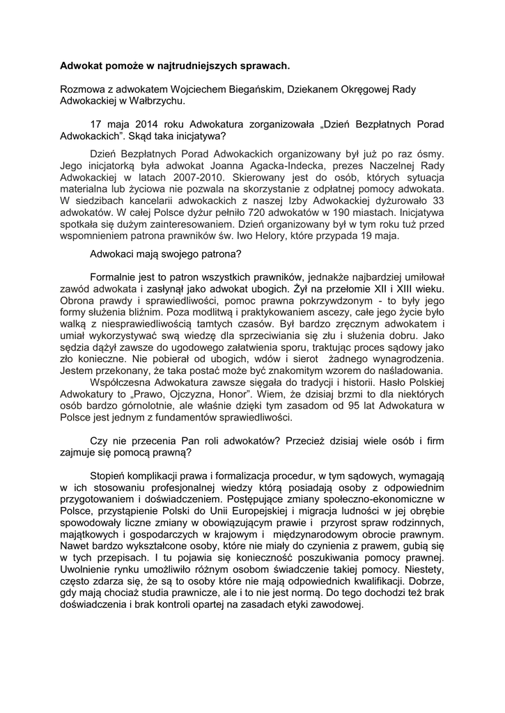 Adwokat pomoże w najtrudniejszych sprawach. Rozmowa z adwokatem Wojciechem Biegańskim, Dziekanem Okręgowej Rady Adwokackiej w Wałbrzychu. 17 maja 2014 roku Adwokatura zorganizowała „Dzień Bezpłatnych Porad Adwokackich”. Skąd taka inicjatywa? Dzień Bezpłatnych Porad Adwokackich organizowany był już po raz ósmy. Jego inicjatorką była adwokat Joanna Agacka-Indecka, prezes Naczelnej Rady Adwokackiej w latach 2007-2010. Skierowany jest do osób, których sytuacja materialna lub życiowa nie pozwala na skorzystanie z odpłatnej pomocy adwokata. W siedzibach kancelarii adwokackich z naszej Izby Adwokackiej dyżurowało 33 adwokatów. W całej Polsce dyżur pełniło 720 adwokatów w 190 miastach. Inicjatywa spotkała się dużym zainteresowaniem. Dzień organizowany był w tym roku tuż przed wspomnieniem patrona prawników św. Iwo Helory, które przypada 19 maja. Adwokaci mają swojego patrona? Formalnie jest to patron wszystkich prawników, jednakże najbardziej umiłował zawód adwokata i zasłynął jako adwokat ubogich. Żył na przełomie XII i XIII wieku. Obrona prawdy i sprawiedliwości, pomoc prawna pokrzywdzonym - to były jego formy służenia bliźnim. Poza modlitwą i praktykowaniem ascezy, całe jego życie było walką z niesprawiedliwością tamtych czasów. Był bardzo zręcznym adwokatem i umiał wykorzystywać swą wiedzę dla sprzeciwiania się złu i służenia dobru. Jako sędzia dążył zawsze do ugodowego załatwienia sporu, traktując proces sądowy jako zło konieczne. Nie pobierał od ubogich, wdów i sierot żadnego wynagrodzenia. Jestem przekonany, że taka postać może być znakomitym wzorem do naśladowania. Współczesna Adwokatura zawsze sięgała do tradycji i historii. Hasło Polskiej Adwokatury to „Prawo, Ojczyzna, Honor”. Wiem, że dzisiaj brzmi to dla niektórych osób bardzo górnolotnie, ale właśnie dzięki tym zasadom od 95 lat Adwokatura w Polsce jest jednym z fundamentów sprawiedliwości. Czy nie przecenia Pan roli adwokatów? Przecież dzisiaj wiele osób i firm zajmuje się pomocą prawną? Stopień komplikacji prawa i formalizacja procedur, w tym sądowych, wymagają w ich stosowaniu profesjonalnej wiedzy którą posiadają osoby z odpowiednim przygotowaniem i doświadczeniem. Postępujące zmiany społeczno-ekonomiczne w Polsce, przystąpienie Polski do Unii Europejskiej i migracja ludności w jej obrębie spowodowały liczne zmiany w obowiązującym prawie i przyrost spraw rodzinnych, majątkowych i gospodarczych w krajowym i międzynarodowym obrocie prawnym. Nawet bardzo wykształcone osoby, które nie miały do czynienia z prawem, gubią się w tych przepisach. I tu pojawia się konieczność poszukiwania pomocy prawnej. Uwolnienie rynku umożliwiło różnym osobom świadczenie takiej pomocy. Niestety, często zdarza się, że są to osoby które nie mają odpowiednich kwalifikacji. Dobrze, gdy mają chociaż studia prawnicze, ale i to nie jest normą. Do tego dochodzi też brak doświadczenia i brak kontroli opartej na zasadach etyki zawodowej. W codziennych wiadomościach słyszymy o problemach zwykłych obywateli lub przedsiębiorców w dochodzeniu lub obronie swych praw. Skarżą się na krzywdę jaka ich spotkała w majestacie prawa. Skąd się to pana zdaniem bierze? Osoby takie w przytłaczającej większości przypadków padły ofiarą nieznajomości prawa, która jeszcze od starożytnych rzymskich czasów szkodzi. Inne osoby są ofiarami mechanicznego przenoszenia internetowego doradztwa prawnego w innych sprawach do ich konkretnego problemu . A każda sprawa jest przecież inna i dlatego szukanie rozwiązań prawnych w internecie kończy się właśnie poczuciem krzywdy. Wielu spraw można by było w ogóle uniknąć lub chociaż zaoszczędzić na ich prowadzeniu, gdyby zainteresowani częściej korzystali z porad prawnych. Zasięgnięcie porady czy opinii prawnej przed podjęciem czynności prawnych pozwoli na przyszłość uniknąć negatywnych konsekwencji prawnych oraz długotrwałych i kosztownych sporów sądowych. Gwarancję udzielenia profesjonalnej pomocy prawnej daje wykształcony i wyszkolony adwokat za którym stoi Adwokatura Polska. Taki adwokat pomoże w najtrudniejszych sprawach. Ale przecież są też inne zawody prawnicze. Radcowie prawni, doradcy podatkowi. Czym odróżnia się zawód adwokata? Adwokaci posiadają wszechstronne przygotowanie prawnicze do udzielania kompetentnej, profesjonalnej pomocy. Gwarancją jest między innymi egzaminacyjna procedura naboru absolwentów uczelni prawniczych na aplikację adwokacką i jej trzyletni kurs odbywany pod opieką patrona, dzięki któremu przyszły adwokat nabiera doświadczenia zawodowego. Aplikacja kończy się państwowym egzaminem adwokackim. Nawet gdy do Adwokatury przychodzą osoby z innych zawodów prawniczych (sędziowie, prokuratorzy, radcowie prawni), to są to już osoby z odpowiednim doświadczeniem. Ponadto adwokaci mają obowiązek stałego dokształcania się. Gwarantem rzetelności świadczonych usług są obowiązujące adwokatów zasady etyki zawodowej i odpowiedzialność dyscyplinarna za ich naruszenie. Powierzenie adwokatowi często poufnych i intymnych spraw jest bezpieczne. Od zawsze fundamentem zawodu adwokata jest, gwarantowana ustawą prawo o adwokaturze, tajemnica zawodowa. Osoby korzystające z pomocy adwokata, mają pewność, że powierzone mu tajemnice nigdy nie zastaną ujawnione. Adwokaci co do zasady wykonują wolny zawód i w przeciwieństwie do radców prawnych, nie mogą pozostawać w stosunku pracy, który zawsze tworzy pewien stopień zależności służbowej. Doradcy podatkowi mają wąski zakres działalności, który jest również elementem działalności adwokatów. A co ze specjalizacjami? Przecież nie można być specjalistą od wszystkiego. Adwokaci, jako grupa zawodowa, świadczą pomoc prawną w najszerszym zakresie wszelkim podmiotom tj. osobom fizycznym i osobom prawnym – przedsiębiorst