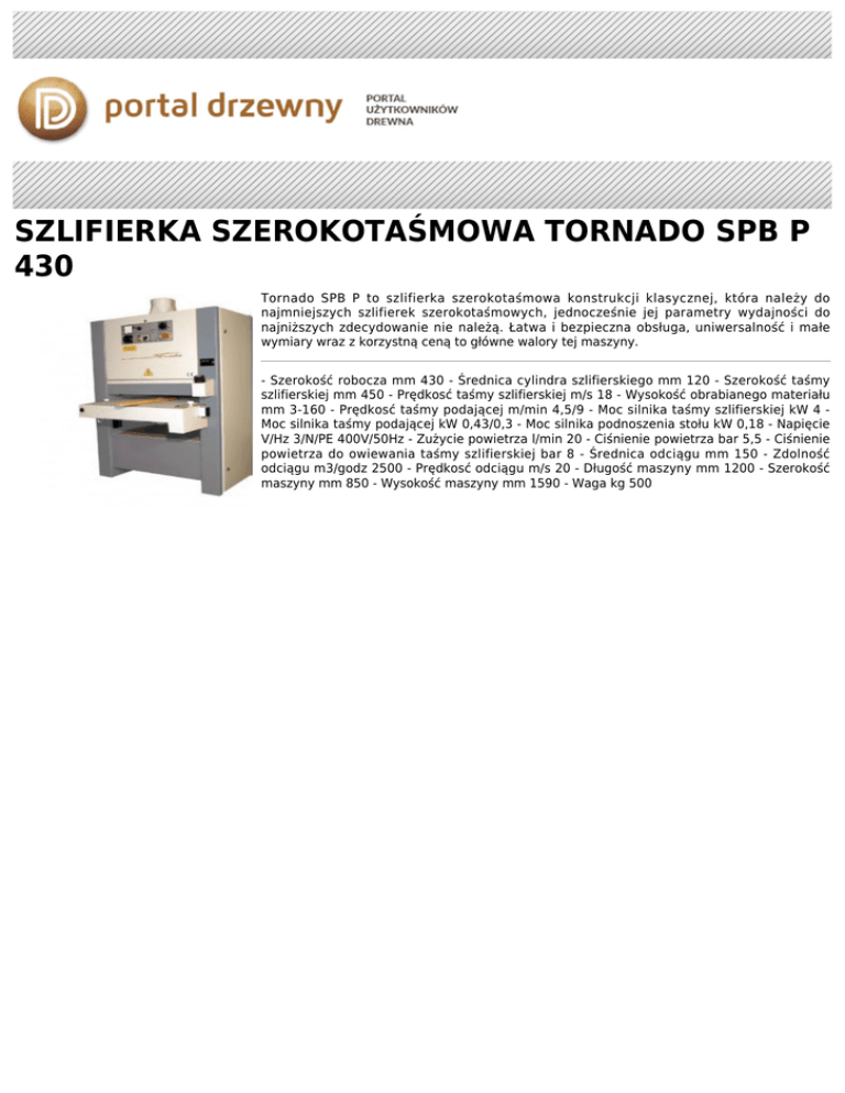 SZLIFIERKA SZEROKOTAŚMOWA TORNADO SPB P 430 Tornado SPB P to szlifierka szerokotaśmowa konstrukcji klasycznej, która należy do najmniejszych szlifierek szerokotaśmowych, jednocześnie jej parametry wydajności do najniższych zdecydowanie nie należą. Łatwa i bezpieczna obsługa, uniwersalność i małe wymiary wraz z korzystną ceną to główne walory tej maszyny. - Szerokość robocza mm 430 - Średnica cylindra szlifierskiego mm 120 - Szerokość taśmy szlifierskiej mm 450 - Prędkosć taśmy szlifierskiej m/s 18 - Wysokość obrabianego materiału mm 3-160 - Prędkosć taśmy podającej m/min 4,5/9 - Moc silnika taśmy szlifierskiej kW 4 Moc silnika taśmy podającej kW 0,43/0,3 - Moc silnika podnoszenia stołu kW 0,18 - Napięcie V/Hz 3/N/PE 400V/50Hz - Zużycie powietrza l/min 20 - Ciśnienie powietrza bar 5,5 - Ciśnienie powietrza do owiewania taśmy szlifierskiej bar 8 - Średnica odciągu mm 150 - Zdolność odciągu m3/godz 2500 - Prędkosć odciągu m/s 20 - Długość maszyny mm 1200 - Szerokość maszyny mm 850 - Wysokość maszyny mm 1590 - Waga kg 500