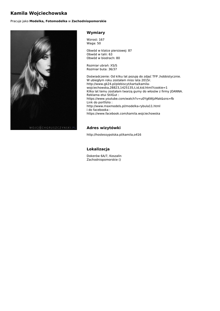 Kamila Wojciechowska Pracuje jako Modelka, Fotomodelka w Zachodniopomorskie Wymiary Wzrost: 167 Waga: 50 Obwód w klatce piersiowej: 87 Obwód w talii: 63 Obwód w biodrach: 80 Rozmiar ubrań: XS/S Rozmiar buta: 36/37 Doświadczenie: Od kilku lat pozuję do zdjęć TFP ,hobbistycznie. W ubiegłym roku zostałam miss lata 2015r. http://www.gk24.pl/plebiscyt/karta/kamilawojciechowska,28823,1425135,t,id,kid.html?cookie=1 Kilka lat temu zostałam twarzą gumy do włosów z firmy JOANNA. Reklama etui StilGut : https://www.youtube.com/watch?v=u0Yg6WjzMak&sns=fb Link do portfolio : http://www.maxmodels.pl/modelka-rybula11.html i do facebooka : https://www.facebook.com/kamila.wojciechowska Adres wizytówki http://hostessypolska.pl/kamila,o416 Lokalizacja Dokerów 6A/7, Koszalin Zachodniopomorskie () Powered by TCPDF (www.tcpdf.org)