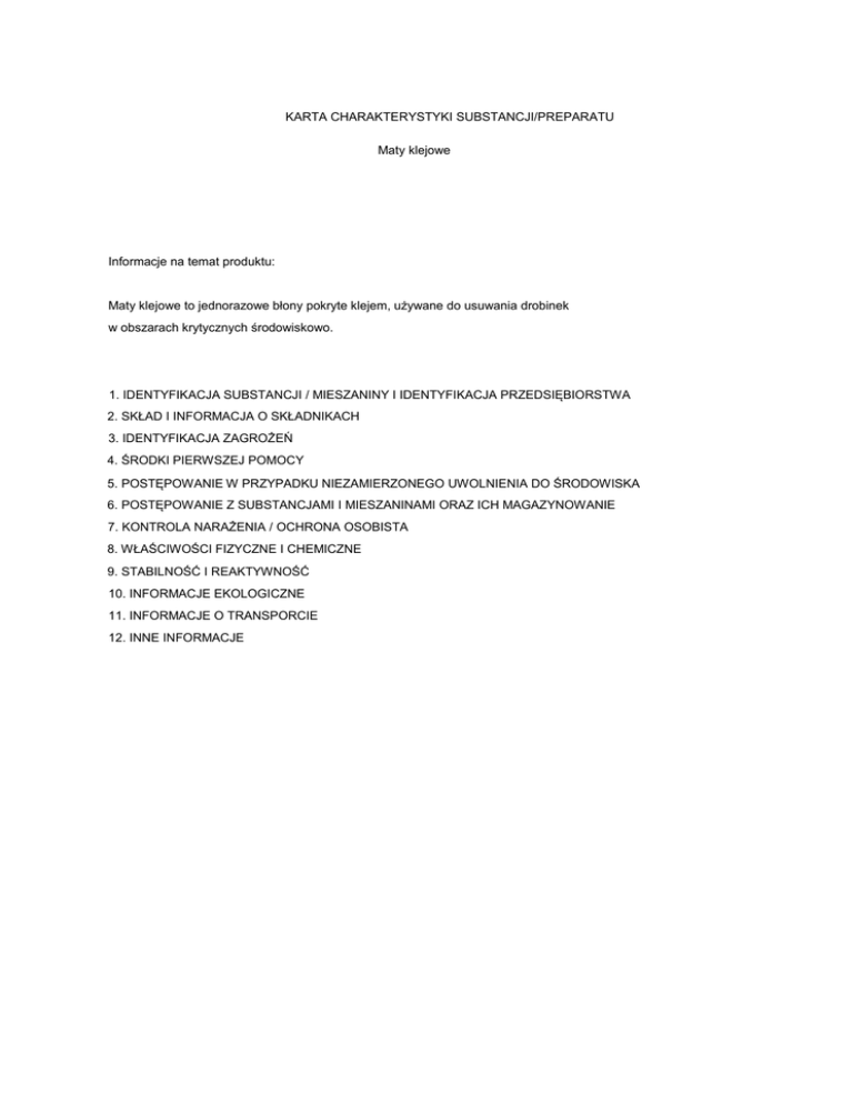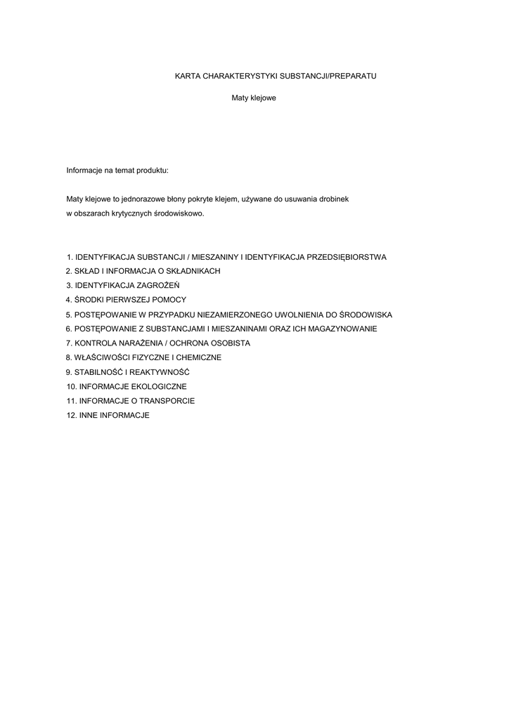 KARTA CHARAKTERYSTYKI SUBSTANCJI/PREPARATU Maty klejowe Informacje na temat produktu: Maty klejowe to jednorazowe błony pokryte klejem, używane do usuwania drobinek w obszarach krytycznych środowiskowo. 1. IDENTYFIKACJA SUBSTANCJI / MIESZANINY I IDENTYFIKACJA PRZEDSIĘBIORSTWA 2. SKŁAD I INFORMACJA O SKŁADNIKACH 3. IDENTYFIKACJA ZAGROŻEŃ 4. ŚRODKI PIERWSZEJ POMOCY 5. POSTĘPOWANIE W PRZYPADKU NIEZAMIERZONEGO UWOLNIENIA DO ŚRODOWISKA 6. POSTĘPOWANIE Z SUBSTANCJAMI I MIESZANINAMI ORAZ ICH MAGAZYNOWANIE 7. KONTROLA NARAŻENIA / OCHRONA OSOBISTA 8. WŁAŚCIWOŚCI FIZYCZNE I CHEMICZNE 9. STABILNOŚĆ I REAKTYWNOŚĆ 10. INFORMACJE EKOLOGICZNE 11. INFORMACJE O TRANSPORCIE 12. INNE INFORMACJE 1. IDENTYFIKACJA SUBSTANCJI / MIESZANINY I IDENTYFIKACJA PRZEDSIĘBIORSTWA Identyfikacja przedsiębiorstwa: SANIMAT, Ltd. 2. SKŁAD I INFORMACJA O SKŁADNIKACH Składniki Błona Polietylen (nr CAS 9002-88-4) 100% Klej (1) akrylan 2-etyloheksylu (nr CAS 103-11-7) 31% (2) akrylan butylu (nr CAS 141-32-2) 16% (3) akrylan winylu (nr CAS 108-05-4) 2% (4) środek powierzchniowo czynny (nr CAS --------) 1% (5) woda (nr CAS 7732-18-5) 50% 3. IDENTYFIKACJA ZAGROŻEŃ Potencjalny wpływ na zdrowie Mata klejowa jest produkowana i stosowana jako produkt przemysłowy i konsumencki bez żadnego szkodliwego wpływu na zdrowie. Mata klejowa została zaklasyfikowana jako produkt nietoksyczny. Kontakt z oczami spowoduje podrażnienie mechaniczne. Kontakt ze skórą nie wywołuje podrażnienia skóry, obrzmienia ani uczulenia. 4. ŚRODKI PIERWSZEJ POMOCY Pierwsza pomoc w przypadku kontaktu z okiem Podrażnienie mechaniczne — usunąć cząstkę. W przypadku utrzymywania się podrażnienia zasięgnąć porady lekarskiej. 5. POSTĘPOWANIE W PRZYPADKU NIEZAMIERZONEGO UWOLNIENIA DO ŚRODOWISKA Zabezpieczenia (personel): Nie dotyczy 6. POSTĘPOWANIE Z SUBSTANCJAMI I MIESZANINAMI ORAZ ICH MAGAZYNOWANIE Postępowanie z produktem (personel) – Unikać kontaktu z oczami. Postępowanie z produktem (aspekty fizyczne) – Przechowywać z dala od źródeł ciepła, iskier i płomienia. Sposób przechowywania – przechowywać płasko. Nie zginać i nie umieszczać na nierównej podłodze. Przechowywać z dala od źródeł ciepła, płomieni, związków chemicznych, rozpuszczalników. 7. KONTROLA NARAŻENIA I OCHRONA OSOBISTA Środki ochrony osobistej - Ochrona oczu / twarzy: Normalnie niewymagane - Maska oddechowa: Normalnie niewymagane - Rękawice ochronne: Normalnie niewymagane 8. WŁAŚCIWOŚCI FIZYCZNE I CHEMICZNE Dane fizyczne - Polietylen (1) Postać: arkusze (2) Kolor: niebieski, biały, zielony, szary (3) Ciężar właściwy: 0,92 - Klej (1) Typ: Klej akrylowy (2) Rozpuszczalność: Rozpuszczalny w acetonie, akrylanie etylu 9. STABILNOŚĆ I REAKTYWNOŚĆ Stabilność - Polietylen: Kwas siarkowy, kwas solny, kwas azotowy zmiękczają błonę polietylenową. - Klej: Aceton, akrylan etylu, toluen, benzen rozpuszczają klej. 10. INFORMACJE EKOLOGICZNE Toksyczność w środowisku wodnym: Nietoksyczny — nierozpuszczalny 11. INFORMACJE O TRANSPORCIE Klasa zagrożenia: Materiał nieobjęty przepisami Ilość podlegająca zgłoszeniu: Materiał nieobjęty przepisami 12. INNE INFORMACJE Informacje zawarte w niniejszej Karcie charakterystyki substancji/preparatu (Material Safety Data Sheet) dotyczą tylko określonego, opisanego tu materiału i nie mają zastosowania w połączeniu z jakimkolwiek innym materiałem ani w żadnym procesie. Odpowiedzialność w zakresie Karty charakterystyki substancji/preparatu: SANIMAT, Ltd.