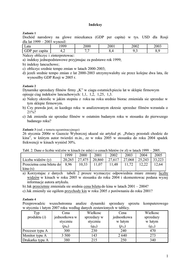 Indeksy Zadanie 1 Dochód narodowy na glowe mieszkanca (GDP per capita) w tys. USD dla Rosji dla lat 1999 – 2003 wynosil: Lata 1999 2000 2001 2002 2003 GDP per capita 4,2 7,7 8,4 9,3 8,9 Nalezy obliczyc i zinterpretowac: a) indeksy jednopodstawowe przyjmujac za podstawe rok 1999; b) indeksy lancuchowe; c) obliczyc srednie tempo zmian w latach 2000-2003; d) jezeli srednie tempo zmian z lat 2000-2003 utrzymywaloby sie przez kolejne dwa lata, ile wynosilby GDP Rosji w 2005 r. Zadanie 2 Dynamike sprzedazy filmów firmy „K” w ciagu ostatnich pieciu lat w sklepie firmowym opisuje ciag indeksów lancuchowych: 1,1, 1,2, 1,25, 1,3. a) Nalezy okreslic w jakim stopniu z roku na roku srednio biorac zmieniala sie sprzedaz w tym sklepie firmowym. b) Czy prawda jest, ze kazdego roku w analizowanym okresie sprzedaz filmów wzrastala o 21%? c) Jak zmienila sie sprzedaz filmów w ostatnim badanym roku w stosunku do pierwszego badanego roku? Zadanie 3 (zad. z tematu egzaminacyjnego) 26 stycznia 2006r w Gazecie Wyborczej ukazal sie artykul pt. „Polacy przestali chodzic do kina”, w którym autor twierdzi m.in., ze w roku 2005 w stosunku do roku 2004 spadek frekwencji w kinach wyniósl 30%. Tabl. 2. Dane o liczbie wid zów w kinach (w mln) i o cenach biletów (w zl) w latach 1999 – 2005. 1999 2000 2001 2002 2003 2004 2005 Liczba widzów (y) 20,265 27,475 20,860 27,617 27,068 25,243 33,223 Przecietna cena biletu do 8,96 10,33 11,07 11,48 11,72 12,22 12,64 kina (x) a) Korzystajac z danych tabeli 2 prosze wyznaczyc odpowiednia miare zmiany liczby widzów w kinach w roku 2005 w stosunku do roku 2004 i skomentowac podana wyzej informacje autora artykulu. b) Jak przecietnie zmieniala sie srednia cena biletu do kina w latach 2001 – 2004? c) Jak zmienily sie ogólem przychody kin w roku 2005 z porównaniu do roku 2001? Zadanie 4 Przeprowadzic wszechstronna analize dynamiki sprzedazy sprzetu w styczniu i lutym 2007 roku wedlug danych zestawionych w tablicy. Typ Cena Wielkosc Cena produktu (i) jednostkowa w sprzedazy w jednostkowa styczniu styczniu w lutym (p0i) (q0i) (p1i) Procesor typu A 300 230 240 Monitor typu A 3 500 143 2 640 Drukarka typu A 380 215 250 komputerowego Wielkosc sprzedazy w lutym (q1i) 470 273 340 1 Zadanie 5 Wartosc sprzedazy oraz dynamika cen jednostkowych kuchenek mikrofalowych oraz ekspresów do kawy ksztaltowaly sie nastepujaco: Produkt Indeksy cen Wartosc sprzedazy w 2000 r 2002/2000 w tys. zl Kuchenki mikrofalowe 1,1 1000 Ekspresy do kawy 1,2 3000 Wartosc sprzedazy obu grup produktów lacznie wyniosla w 2002 r. 4500 tys. zl. Nalezy okreslic wplyw zmian cen jednostkowych oraz rozmiarów fizycznych na dynamike wartosci sprzedazy w analizowanym okresie. Zadanie 6 Laczne przychody ze sprzedazy warzyw i owoców w pewnym sklepie warzywno-owocowym wynosily w 2000 roku 20 tysiecy zlotych, a w roku 2001 wzrosly o 5%. Wiadomo tez, ze ze sprzedazy warzyw uzyskano w 2000 roku 60% wartosci przychodów ogólem, oraz ze ilosc sprzedawanych warzyw w 2001 roku w porównaniu z rokiem 2000 zmalala o 10%, podczas gdy ilosc sprzedawanych owoców nie zmienila sie. Ocenic za pomoca indeksów agregatowych zmiany cen jednostkowych i rozmiarów fizycznych sprzedazy w badanym okresie. Zadanie 7 (zad. z tematu egzaminacyjnego) Na podstawie miesiecznych danych (od sierpnia do grudnia 2006 roku) dla dwóch najlepiej sie sprzedajacych gatunków ciastek (Delicji szampanskich i Prince Polo) w jednym z punktów sprzedazy uzyskano: Delicje szampanskie Prince Polo sierpien grudzien sierpien grudzien Cena za 3,0 3,2 1,00 1,02 opakowanie(w zl) Wolumen sprzedazy 200 300 450 500 (w szt) a) Wyznaczyc srednie miesieczne tempo zmia n cen Delicji w analizowanym okresie b) Jakie byly laczne zmiany wartosci uzyskanej ze sprzedazy obydwu rodzajów ciastek w grudniu w porównaniu do sierpniu 2006? c) Jak zmienilaby sie laczna wartosc ze sprzedazy tych ciastek, gdyby ceny nie ulegly zmianie i pozostaly na poziomie sierpnia? d) Wyrównane za pomoca srednich ruchomych ilosci sprzedanych Delicji dla miesiaca grudnia lat 2001-2005 wynosily: y t : 180 202 230 243 267 . Wyznacz surowy wskaznik wahan okresowych dla tego podokresu (o’ 12 ) jesli rzeczywiste ilosci grudniowej sprzedazy Delicji w latach 2001-2006 w tym sklepie wynosily y t : 220, 240, 270, 300, 320, 300. Dodatkowe zadania do rozwiazania w domu: Zbiór zadan:Indeksy proste:7.2.1; 7.2.2; 7.2.3; 7.2.5; 7.2.10; 7.2.11; Indeksy agregatowe: 7.3.2; 7.3.4; 7.3.6; 7.3.7; 7.3.8; 7.3.11; 7.3.12; 7.3.13; 7.3.16; 7.3.17. Zestaw dr Wieczorek: 1-13. 2 Indeksy - odpowiedzi Zadanie 1: c) r(2000;2003)= 4,9%; d) y2005 =9,79. Zadanie 2: a) r(0,4)=21%; b) nie; c) i4/0 =1,3*1,25*1,2*1,1=2,145 Zadanie 3: a) 1,316; b) +3,3%; c) 1,818 L L P P Zadanie 4: Iw=1,41; I p =0,747; I q =1,8822; I p =0,749; I q =1,888. Zadanie 5Zadanie 5: I Lp =1,175; I Pq =0,957. Zadanie 6: I Lq =0,98; I Pp =1,071. Zadanie 7: a) ig=1,0163; b) I w=1,4; c) LIq=1,333; d) O’12 =1,203. 3
