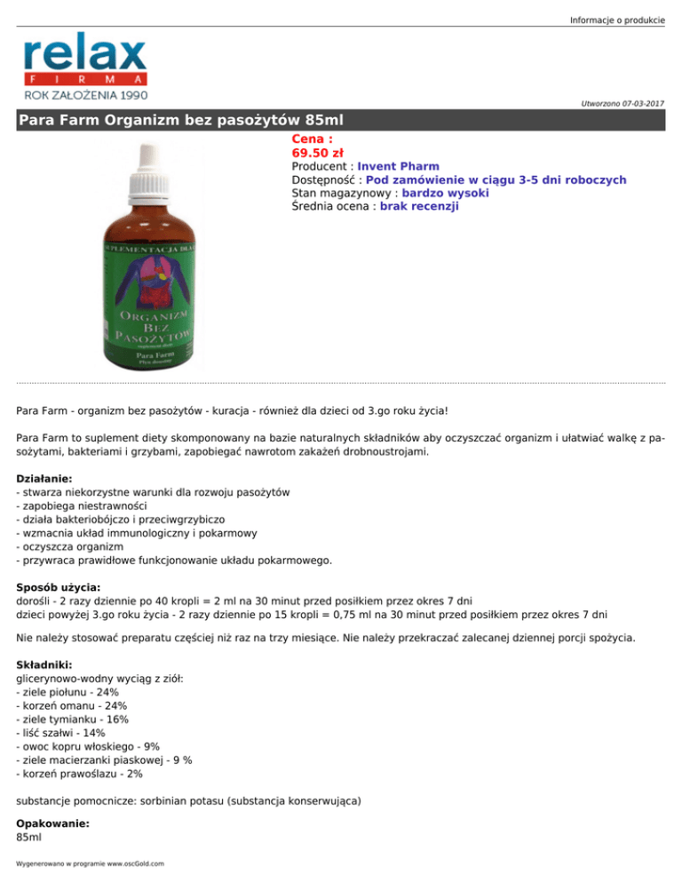 Informacje o produkcie Utworzono 07-03-2017 Para Farm Organizm bez pasożytów 85ml Cena : 69.50 zł Producent : Invent Pharm Dostępność : Pod zamówienie w ciągu 3-5 dni roboczych Stan magazynowy : bardzo wysoki Średnia ocena : brak recenzji Para Farm - organizm bez pasożytów - kuracja - również dla dzieci od 3.go roku życia! Para Farm to suplement diety skomponowany na bazie naturalnych składników aby oczyszczać organizm i ułatwiać walkę z pasożytami, bakteriami i grzybami, zapobiegać nawrotom zakażeń drobnoustrojami. Działanie: - stwarza niekorzystne warunki dla rozwoju pasożytów - zapobiega niestrawności - działa bakteriobójczo i przeciwgrzybiczo - wzmacnia układ immunologiczny i pokarmowy - oczyszcza organizm - przywraca prawidłowe funkcjonowanie układu pokarmowego. Sposób użycia: dorośli - 2 razy dziennie po 40 kropli = 2 ml na 30 minut przed posiłkiem przez okres 7 dni dzieci powyżej 3.go roku życia - 2 razy dziennie po 15 kropli = 0,75 ml na 30 minut przed posiłkiem przez okres 7 dni Nie należy stosować preparatu częściej niż raz na trzy miesiące. Nie należy przekraczać zalecanej dziennej porcji spożycia. Składniki: glicerynowo-wodny wyciąg z ziół: - ziele piołunu - 24% - korzeń omanu - 24% - ziele tymianku - 16% - liść szałwi - 14% - owoc kopru włoskiego - 9% - ziele macierzanki piaskowej - 9 % - korzeń prawoślazu - 2% substancje pomocnicze: sorbinian potasu (substancja konserwująca) Opakowanie: 85ml Wygenerowano w programie www.oscGold.com