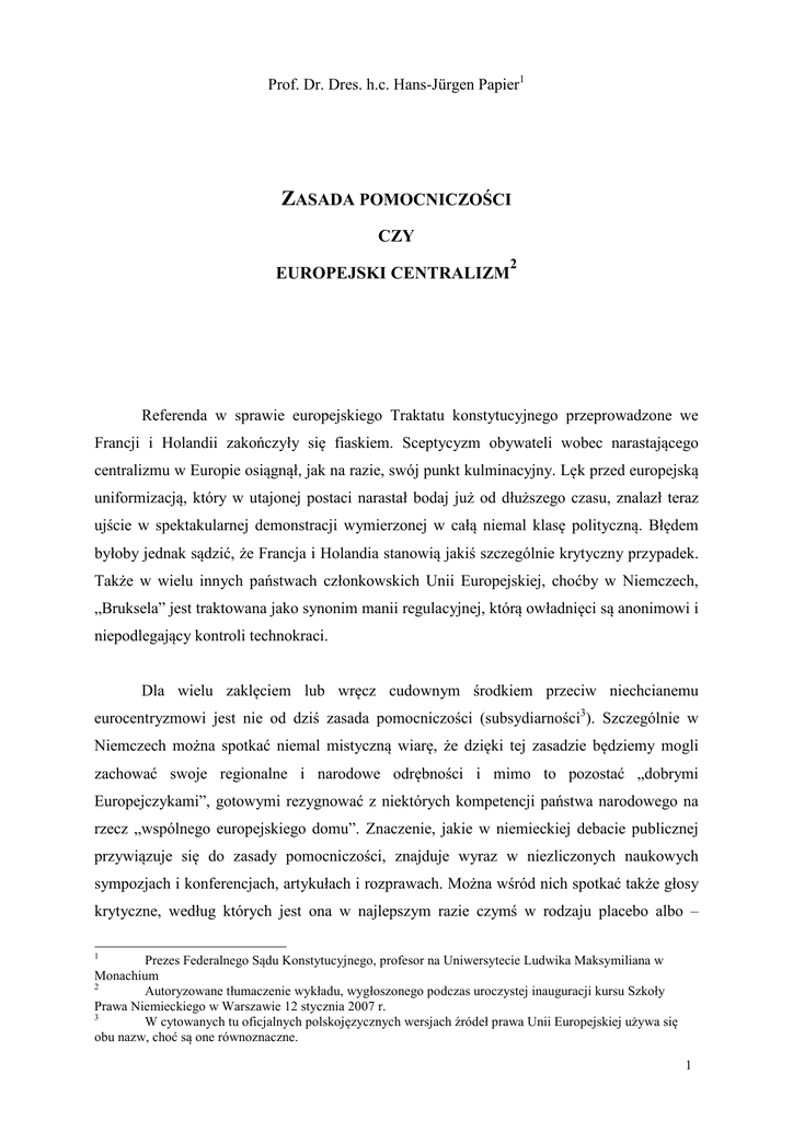 Prof. Dr. Dres. h.c. Hans-Jürgen Papier1 ZASADA POMOCNICZOŚCI CZY EUROPEJSKI CENTRALIZM 2 Referenda w sprawie europejskiego Traktatu konstytucyjnego przeprowadzone we Francji i Holandii zakończyły się fiaskiem. Sceptycyzm obywateli wobec narastającego centralizmu w Europie osiągnął, jak na razie, swój punkt kulminacyjny. Lęk przed europejską uniformizacją, który w utajonej postaci narastał bodaj już od dłuższego czasu, znalazł teraz ujście w spektakularnej demonstracji wymierzonej w całą niemal klasę polityczną. Błędem byłoby jednak sądzić, że Francja i Holandia stanowią jakiś szczególnie krytyczny przypadek. Także w wielu innych państwach członkowskich Unii Europejskiej, choćby w Niemczech, „Bruksela” jest traktowana jako synonim manii regulacyjnej, którą owładnięci są anonimowi i niepodlegający kontroli technokraci. Dla wielu zaklęciem lub wręcz cudownym środkiem przeciw niechcianemu eurocentryzmowi jest nie od dziś zasada pomocniczości (subsydiarności3). Szczególnie w Niemczech można spotkać niemal mistyczną wiarę, że dzięki tej zasadzie będziemy mogli zachować swoje regionalne i narodowe odrębności i mimo to pozostać „dobrymi Europejczykami”, gotowymi rezygnować z niektórych kompetencji państwa narodowego na rzecz „wspólnego europejskiego domu”. Znaczenie, jakie w niemieckiej debacie publicznej przywiązuje się do zasady pomocniczości, znajduje wyraz w niezliczonych naukowych sympozjach i konferencjach, artykułach i rozprawach. Można wśród nich spotkać także głosy krytyczne, według których jest ona w najlepszym razie czymś w rodzaju placebo albo – 1 Prezes Federalnego Sądu Konstytucyjnego, profesor na Uniwersytecie Ludwika Maksymiliana w Monachium 2 Autoryzowane tłumaczenie wykładu, wygłoszonego podczas uroczystej inauguracji kursu Szkoły Prawa Niemieckiego w Warszawie 12 stycznia 2007 r. 3 W cytowanych tu oficjalnych polskojęzycznych wersjach źródeł prawa Unii Europejskiej używa się obu nazw, choć są one równoznaczne. 1 mówiąc dosadniej – piaskiem, którym sypie się w oczy zmęczonym Europą obywatelom, aby przesłonić im rzeczywisty sens europejskiej integracji i zagłuszyć ich niepokój. Jeszcze więksi eurosceptycy skłonni są widzieć w zasadzie pomocniczości konia trojańskiego, twierdząc, że pod jej atrakcyjnym opakowaniem kryją się dalsze przesunięcia kompetencji na rzecz Unii. Czym więc jest zasada pomocniczości naprawdę? Czy może ona spełnić pokładane w niej nadzieje? Czy jest czymś więcej niż propagandowym sloganem? A może próba nadania jej praktycznego znaczenia prawnego na szczeblu europejskim przypomina raczej zawracanie kijem biegu rzeki? Chciałbym spróbować odpowiedzieć na te pytania. Najpierw wyjaśnimy samo pojęcie pomocniczości (subsydiarności). Drugim krokiem będzie rozważenie znaczenia zasady pomocniczości w kontekście integracji europejskiej. Na koniec zostaną przedstawione planowane nowości zawarte w – na razie zablokowanym – Traktacie ustanawiającym Konstytucję dla Europy. POJĘCIE Etymologiczne wyjaśnienie terminu „subsydiarność” jest proste: pochodzi on od łacińskiego subsidere, czyli od „siedzenia pod”, oraz od spokrewnionego z tym słowem pojęcia subsidium, które znaczy tyle co „wsparcie”, „udzielenie pomocy”. Chodzi tutaj o pomoc idącą „z góry”. „Klasyczna“ definicja zasady pomocniczości wywodzi się z nauczania społecznego Kościoła katolickiego, a dokładnie – z encykliki papieża Piusa XI Quadragesimo anno (1931 r.). W encyklice tej Pius XI postulował model społeczeństwa, w którym zadania należą każdorazowo do najmniejszej z jednostek społecznych zdolnych do ich realizacji. Dopiero gdy jakieś zadanie przekracza siły danej jednostki społecznej, może je podjąć społeczność bezpośrednio wyższego stopnia. Stojąca za tą koncepcją idea budowania kompetencji niejako od dołu nie była zresztą nowa. Już w pismach Arystotelesa i Tomasza z Akwinu można znaleźć model ładu społecznego, w którym kompetencje sytuowane są możliwe najniżej, a interwencje z góry dopuszczalne są jedynie jako pomocnicze wsparcie. Model ten leży zresztą także u podstaw idei liberalizmu. 2 Mimo tego zakorzenienia w historii myśli, idea pomocniczości w ujęciu papieskiej encykliki oraz jej nazwa prowadziły początkowo do pewnej polaryzacji. Antykatolickie uprzedzenia i konfesyjne partykularyzmy powodowały, że w schyłkowej fazie Republiki Weimarskiej, a także w pierwszych latach Republiki Federalnej zasada pomocniczości stanowiła jako pojęcie przedmiot kontrowersji. Dały one o sobie znać między innymi w powojennym sporze o zadania i granice polityki socjalnej państwa, któremu kres położył dopiero Federalny Sąd Konstytucyjny (FSK) w 1967 r. swoim orzeczeniem w sprawie federalnej ustawy o pomocy społecznej i opiece nad młodzieżą4. Wyrok ten potwierdził wprawdzie, co do zasady, kompetencję państwa w sprawach socjalnych, zarazem jednak wskazał, że aktywność państwa w tej dziedzinie ma charakter komplementarny wobec działań podmiotów prywatnych, a tym samym nie może tych działań wypierać. Nie jest chyba przypadkiem, że FSK w uzasadnieniu tamtego wyroku nie użył terminu „zasada pomocniczości”. Dziś konfesyjne skojarzenia należą już do przeszłości. Zasada pomocniczości, wolna od religijnych konotacji, charakteryzuje ład państwowy i społeczny oparty na wolności i różnorodności, który jest budowany od dołu i w którym każde działanie struktury wyższego rzędu jest pojmowane jako ingerencja wymagająca odpowiedniego uzasadnienia. W ten sposób chronione są istniejące odrębności jednostek społecznych niższego rzędu, co wiąże się także z ochroną mniejszości jako zasadą ustrojową, a zarazem władza usytuowana na wyższych szczeblach organizacji państwowej uzyskuje demokratyczną legitymację. W ustroju 