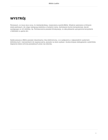 Biblio Lublin WYSTRÓJ Pierwszym, co rzuca się w oczy, to niestandardowy, nowoczesny wystrój Biblio. Wnętrze wykonano w klimacie skate-parkowym, do czego nawiązują siedziska w kształcie ramp, stylizowane biurka komputerowe, beczki występujące w roli stolików, itp. Pomieszczenie posiada klimatyzację, co zdecydowanie uprzyjemnia korzystanie z biblioteki w upalne dni. Każda pozycja w Biblio posiada indywidualny chip elektroniczny, co w połączeniu z odpowiednim systemem bibliotecznym i stanowiskami do wypożyczania, pozwala na dużo szybsze i skuteczniejsze obsługiwanie czytelników. Zapewnia także ochronę posiadanych przez nas zbiorów. 1