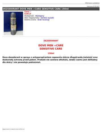 Informacje o produkcie Utworzono 07-03-2017 DEZODORANT DOVE MEN +CARE SENSITIVE CARE 150ml Cena : 9,99 zł Dostępność : Dostępny Stan magazynowy : bardzo wysoki Średnia ocena : brak recenzji DEZODORANT DOVE MEN +CARE SENSITIVE CARE 150ml Dove dezodorant w sprayu z antyperspirantem zapewnia skórze długotrwałą świeżość oraz doskonałą ochronę przed potem. Produkt nie zawiera alkoholu, dzięki czemu jest delikatny dla skóry i nie powoduje podrażnień. Wygenerowano w programie www.oscGold.com