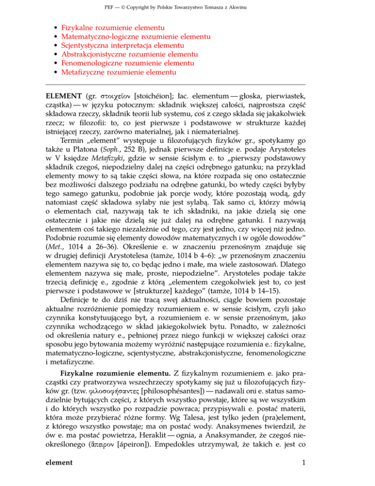 PEF — © Copyright by Polskie Towarzystwo Tomasza z Akwinu • • • • • • Fizykalne rozumienie elementu Matematyczno-logiczne rozumienie elementu Scjentystyczna interpretacja elementu Abstrakcjonistyczne rozumienie elementu Fenomenologiczne rozumienie elementu Metafizyczne rozumienie elementu ELEMENT (gr. stoiqeon [stoichéion]; łac. elementum — głoska, pierwiastek, cząstka) — w języku potocznym: składnik większej całości, najprostsza część składowa rzeczy, składnik teorii lub systemu, coś z czego składa się jakakolwiek rzecz; w filozofii: to, co jest pierwsze i podstawowe w strukturze każdej istniejącej rzeczy, zarówno materialnej, jak i niematerialnej. Termin „element” występuje u filozofujących fizyków gr., spotykamy go także u Platona (Soph., 252 B), jednak pierwsze definicje e. podaje Arystoteles w V księdze Metafizyki, gdzie w sensie ścisłym e. to „pierwszy podstawowy składnik czegoś, niepodzielny dalej na części odrębnego gatunku; na przykład elementy mowy to są takie części słowa, na które rozpada się ono ostatecznie bez możliwości dalszego podziału na odrębne gatunki, bo wtedy części byłyby tego samego gatunku, podobnie jak porcje wody, które pozostają wodą, gdy natomiast część składowa sylaby nie jest sylabą. Tak samo ci, którzy mówią o elementach ciał, nazywają tak te ich składniki, na jakie dzielą się one ostatecznie i jakie nie dzielą się już dalej na odrębne gatunki. I nazywają elementem coś takiego niezależnie od tego, czy jest jedno, czy więcej niż jedno. Podobnie rozumie się elementy dowodów matematycznych i w ogóle dowodów” (Met., 1014 a 26–36). Określenie e. w znaczeniu przenośnym znajduje się w drugiej definicji Arystotelesa (tamże, 1014 b 4–6): „w przenośnym znaczeniu elementem nazywa się to, co będąc jedno i małe, ma wiele zastosowań. Dlatego elementem nazywa się małe, proste, niepodzielne”. Arystoteles podaje także trzecią definicję e., zgodnie z którą „elementem czegokolwiek jest to, co jest pierwsze i podstawowe w [strukturze] każdego” (tamże, 1014 b 14–15). Definicje te do dziś nie tracą swej aktualności, ciągle bowiem pozostaje aktualne rozróżnienie pomiędzy rozumieniem e. w sensie ścisłym, czyli jako czynnika konstytuującego byt, a rozumieniem e. w sensie przenośnym, jako czynnika wchodzącego w skład jakiegokolwiek bytu. Ponadto, w zależności od określenia natury e., pełnionej przez niego funkcji w większej całości oraz sposobu jego bytowania możemy wyróżnić następujące rozumienia e.: fizykalne, matematyczno-logiczne, scjentystyczne, abstrakcjonistyczne, fenomenologiczne i metafizyczne. Fizykalne rozumienie elementu. Z fizykalnym rozumieniem e. jako pracząstki czy pratworzywa wszechrzeczy spotykamy się już u filozofujących fizyków gr. (tzw. filosofsantec [philosophésantes]) — nadawali oni e. status samodzielnie bytujących części, z których wszystko powstaje, które są we wszystkim i do których wszystko po rozpadzie powraca; przypisywali e. postać materii, która może przybierać różne formy. Wg Talesa, jest tylko jeden (pra)element, z którego wszystko powstaje; ma on postać wody. Anaksymenes twierdził, że ów e. ma postać powietrza, Heraklit — ognia, a Anaksymander, że czegoś nieokreślonego ( peiron [ápeiron]). Empedokles utrzymywał, że takich e. jest co element 1 PEF — © Copyright by Polskie Towarzystwo Tomasza z Akwinu najmniej cztery (woda, powietrze, ogień i ziemia), a Anaksagoras, że nieskończona ilość, z różnymi kształtami i barwami, zaś Leukippos i Demokryt, że e. wszechrzeczy są niepodzielne atomy (Diels-Kranz A 9). U podstaw takiego rozumienia e. stoi przekonanie, ze rzeczy są agregatami e., całość natomiast jest sumą e. Współczesne fizykalne rozumienie e. zdeterminowane jest przyjmowaną koncepcją fizyki (klasycznej, nowożytnej, współczesnej) oraz przyjmowaną w niej koncepcją materii (np. korpuskularna, falowa, kwantowa, kwarkowa), a także chemiczno-biologicznym rozumieniem e. jako pierwiastka, korpuskuły czy drobiny, które pojawiło się w XVIII w. wraz z rozwojem chemii i biologii (A. Lavoisier, J. Dalton, D. Mendelejew i in.). Cechą charakterystyczną fizykalnego rozumienia e., także współcześnie, jest pogląd, że e. istnieją jako samodzielnie bytujące całości, które można ilościowo i jakościowo opisać i zdefiniować. Matematyczno-logiczne rozumienie elementu. W matematyce upowszechniło się, za sprawą Elementów Euklidesa, rozumienie e. jako zasady, aksjomatu i podstawowego twierdzenia danej nauki. Obok tego występuje rozumienie e. jako składnika liczb. W logice e. to: przedmiot, który należy do danego zbioru; cecha, która przysługuje przedmiotowi; składnik zdania, twierdzenia czy dowodu. W każdym z tych przypadków e. to tyle, co podstawowy składnik wydzielony z całości, lub składnik dowodu, twierdzenia czy sytemu. Scjentystyczna interpretacja elementu. Zgodnie z tą interpretacją wszystko, co istnieje, ma taką samą naturę i może być ujęte w ramach tego samego typu poznana. Zarówno e., jak i złożona z nich całość, są tej samej natury. Poznać rzecz, to poznać jej e. składowe. E., części czy składniki traktowane są jako przedmioty mające swe substraty, które możemy wskazać i empirycznie zweryfikować. Jeśli nie możemy wskazać na substrat naszych ujęć poznawczych, to pojęcia takie musimy odrzucić jako nienaukowe. Abstrakcjonistyczne rozumienie elementu. E. pojmowany jest w tej koncepcji jako twór pojęciowy (myślny), służący do opisywania właściwości rzeczy lub samych rzeczy. Abstrakcjonizm zakłada, że poznanie zarówno rzeczy, jak i jej e., dokonuje się w ramach utworzonego wpierw pojęcia (abstraktu). Zarówno e., jak i całość, mają tę samą naturę. Wynika stąd, że w ramach abstrakcjonizmu rozróżnienie na e. i całość jest zabiegiem czysto językowym.