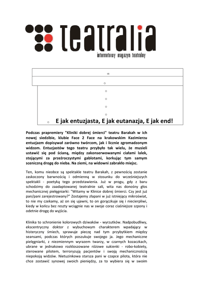 • o o o o o o E jak entuzjasta, E jak eutanazja, E jak end! Podczas prapremiery "Kliniki dobrej śmierci" teatru Barakah w ich nowej siedzibie, klubie Face 2 Face na krakowskim Kazimierzu entuzjazm dopisywał zarówno twórcom, jak i licznie zgromadzonym widzom. Entuzjastów tego teatru przybyło tak wielu, że musieli ustawić się pod ścianą, między zakonserwowanymi ciałami lalek, stojącymi za przeźroczystymi gablotami, korkując tym samym sceniczną drogę do nieba. Na ziemi, na widowni zabrakło miejsc. Ten, komu nieobce są spektakle teatru Barakah, z pewnością zostanie zaskoczony barwnością i odmienną w stosunku do wcześniejszych spektakli - poetyką tego przedstawienia. Już w progu, gdy z baru schodzimy do zaadaptowanej teatralnie sali, wita nas donośny głos mechanicznej pielęgniarki: "Witamy w Klinice dobrej śmierci. Czy jest już pan/pani zarejestrowany?" Zostajemy złapani w już istniejący mikroświat, to nie my czekamy, aż on się ujawni, to on gorączkuje się i niecierpliwi, kiedy w końcu bez reszty wciągnie nas w swoje coraz ciaśniejsze szpony i odetnie drogę do wyjścia. Klinika to schronienie kolorowych dziwaków - wyrzutków. Nadpobudliwy, ekscentryczny doktor z wybuchowym charakterem wpadający w histeryczny śmiech, sprawuje pieczę nad tym przybytkiem między seansami, podczas których poszukuje swojego ja. Jego mechaniczne pielęgniarki, z niezmiennym wyrazem twarzy, w czarnych kozaczkach, ubrane w jednakowo rozkloszowane różowe sukienki - robo-kobiety, sterowane pilotem, terroryzują pacjentów i swoją mechanicznością niepokoją widzów. Nietuzinkowa starsza pani w czapce pilota, która nie chce zostawić synowej swoich pieniędzy, za to wybiera się w swoim mniemaniu na utopijną wyspę szczęśliwości, czeka na swoją kolej. Do tego jeszcze apatyczna i nieco eteryczna młoda wdowa, której odmawia się zabiegu. W całe to towarzystwo wkracza prawdziwy entuzjasta eutanazji przyszły numer 6002; młody dziennikarz zadaje pierwsze pytanie i wprawia w ruch fabułę. I tak rwącym nurtem, w szybkim rytmie rozwija się historia, ocierająca się o absurd, której głównym bohaterem jest eutanazja. Modny produkt na sprzedaż w różnych opcjach kupuje coraz więcej osób. Do kliniki nie przychodzi się parami, tutaj można wykupić tylko pojedynczą śmierć, a ludzie umierają dobrowolnie, po dokładnym przestudiowaniu ich historii "choroby". Pomyśleć tylko całe tony akt o samotności. Cóż za wspaniały wolny wybór - skandują entuzjaści. A po człowieku zostaje tylko numer 6000. "Klinika dobrej śmierci" swoim tempem, barwą i czarnym humorem, pozwalającym widowni tylko na krótkie przerwy między wybuchami śmiechu, zwabia widza w pułapkę. Łatwo zapomnieć, czego tak naprawdę dotyczy spektakl i co oznacza słowo eutanazja, zalegalizowana m. in. w Holandii, Belgii, Luksemburgu czy Japonii, a nie jest to bynajmniej wadą tego spektaklu. Można pomyśleć, że przedstawienie gubi się w swojej zabawności, lecz to widz plącze się gdzieś między tym, co jest wesołe i przyjemne, a tym, co kryje się za śmiechem. Ulega spektaklowi, tak jak ulega się reklamie, manipulacji. Wbrew pozorom nowa premiera teatru Barakah nie jest komedią, nie jest też sztuką o śmierci. Poprzez problem eutanazji opowiada o samotności, sztuce manipulacji i odczłowieczeniu. Przede wszystkim traktuje o tym, iż życie nie kończy się w momencie zatrzymania funkcji życiowych, lecz wtedy, gdy człowiek przestaje chcieć żyć. Kiedy sam nieodwołalnie stwierdzi, albo gdy pozwoli sobie wmówić: the end. Teatr BARAKAH w innej siedzibie, w innej stylistyce i inny sposób - ponownie dotyka istotnego. To pozostaje niezmienne. Kamila Bubrowiecka Teatralia Kraków 14 października 2008