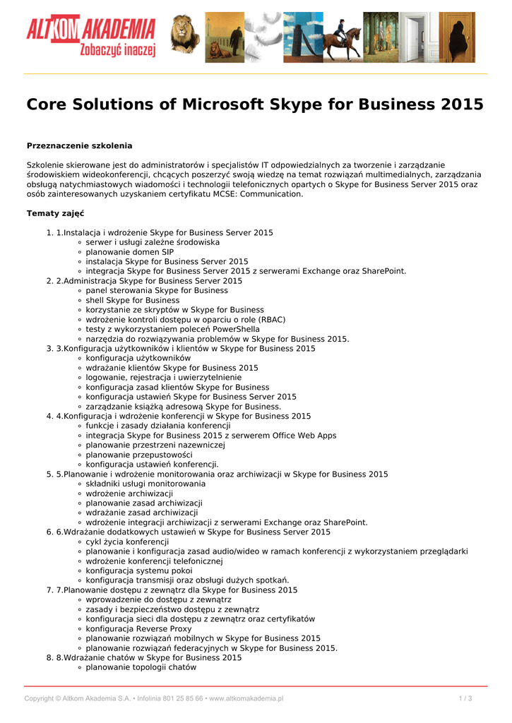 Core Solutions of Microsoft Skype for Business 2015 Przeznaczenie szkolenia Szkolenie skierowane jest do administratorów i specjalistów IT odpowiedzialnych za tworzenie i zarządzanie środowiskiem wideokonferencji, chcących poszerzyć swoją wiedzę na temat rozwiązań multimedialnych, zarządzania obsługą natychmiastowych wiadomości i technologii telefonicznych opartych o Skype for Business Server 2015 oraz osób zainteresowanych uzyskaniem certyfikatu MCSE: Communication. Tematy zajęć 1. 1.Instalacja i wdrożenie Skype for Business Server 2015 serwer i usługi zależne środowiska planowanie domen SIP instalacja Skype for Business Server 2015 integracja Skype for Business Server 2015 z serwerami Exchange oraz SharePoint. 2. 2.Administracja Skype for Business Server 2015 panel sterowania Skype for Business shell Skype for Business korzystanie ze skryptów w Skype for Business wdrożenie kontroli dostępu w oparciu o role (RBAC) testy z wykorzystaniem poleceń PowerShella narzędzia do rozwiązywania problemów w Skype for Business 2015. 3. 3.Konfiguracja użytkowników i klientów w Skype for Business 2015 konfiguracja użytkowników wdrażanie klientów Skype for Business 2015 logowanie, rejestracja i uwierzytelnienie konfiguracja zasad klientów Skype for Business konfiguracja ustawień Skype for Business Server 2015 zarządzanie książką adresową Skype for Business. 4. 4.Konfiguracja i wdrożenie konferencji w Skype for Business 2015 funkcje i zasady działania konferencji integracja Skype for Business 2015 z serwerem Office Web Apps planowanie przestrzeni nazewniczej planowanie przepustowości konfiguracja ustawień konferencji. 5. 5.Planowanie i wdrożenie monitorowania oraz archiwizacji w Skype for Business 2015 składniki usługi monitorowania wdrożenie archiwizacji planowanie zasad archiwizacji wdrażanie zasad archiwizacji wdrożenie integracji archiwizacji z serwerami Exchange oraz SharePoint. 6. 6.Wdrażanie dodatkowych ustawień w Skype for Business Server 2015 cykl życia konferencji planowanie i konfiguracja zasad audio/wideo w ramach konferencji z wykorzystaniem przeglądarki wdrożenie konferencji telefonicznej konfiguracja systemu pokoi konfiguracja transmisji oraz obsługi dużych spotkań. 7. 7.Planowanie dostępu z zewnątrz dla Skype for Business 2015 wprowadzenie do dostępu z zewnątrz zasady i bezpieczeństwo dostępu z zewnątrz konfiguracja sieci dla dostępu z zewnątrz oraz certyfikatów konfiguracja Reverse Proxy planowanie rozwiązań mobilnych w Skype for Business 2015 planowanie rozwiązań federacyjnych w Skype for Business 2015. 8. 8.Wdrażanie chatów w Skype for Business 2015 planowanie topologii chatów Copyright © Altkom Akademia S.A. • Infolinia 801 25 85 66 • www.altkomakademia.pl 1/3 9. 10. 11. 12. 13. wdrażanie chatów konfiguracja i zarządzanie chatami. 9.Planowanie odzyskiwania w przypadku awarii Skype for Business 2015 odzyskiwanie danych w Skype for Business wdrożenie Front End Pool Pairing inne podejścia do odzyskiwania danych w Skype for Business 2015. 10.Integracja z Skype for Business 2015 Online projektowanie rozwiązania hybrydowego Skype for Business wdrażanie rozwiązania hybrydowego Skype for Business. 11.Wdrożenie wysokiej dostępności w Skype for Business 2015 architektura Front End Pool wysoka dostępność serwera Back End wysoka dostępność dla innych składników serwerów. 12.Planowanie i wykonywanie aktualizacji do Skype for Business 2015 przegląd aktualizacji i ścieżek migracji wykonywanie aktualizacji „w miejscu” 13.Projektowanie topologi Skype for Business 2015 przegląd Skype for Business 2015 narzędzia administracyjne Skype for Business Skype for Business Online. Korzyści wynikające z ukończenia szkolenia Wiedza i umiejętności z konfiguracji i zarządzania Skype for Business 2015 w lokalnym środowisku firmowym, w chmurze oraz w środowisku hybrydowym, projektowanie rozwiązań głosowych w przedsiębiorstwie bazujących na Skype for Business 2015. Szkolenie przygotowuje do egzaminu ze ścieżki certyfikacyjnej MCSE: Communication: 70-334: Core Solutions of Skype for Business 2015. Środowisko edukacyjne tego szkolenia wyróżniają: Multimedialne i interaktywne materiały szkoleniowe Microsoft w postaci wirtualnych laboratoriów, nagrań wideo wszystkich lekcji, demonstracji, scenariuszy laboratoriów powiązanych ze szkoleniem oraz instrukcji wykonania laboratoriów. Quizy sprawdzające cząstkowe oraz quiz końcowy. Dodatkowe materiały i zadania praktyczne, które pomogą Ci przyswoić i utrwalić wiedzę. Tę część szkolenia poprowadzi Twój trener moderator. Oczekiwane przygotowanie słuchaczy Minimum 2 letnie doświadczenie z technologiami Windows Server 2008/2012, usługami Active Directory, doświadczenie sieciowe w szczególności związane z usługami DNS, znajomość PowerShell i usług PKI, rozumienie sieci danych oraz standardów i składników telekomunikacyjnych. Copyright © Altkom Akademia S.A. • Infolinia 801 25 85 66 • www.altkomakademia.pl 2/3 Umiejętność korzystania z anglojęzycznych materiałów. Metoda szkolenia Wykład Warsztaty Laboratoria Quiz Trener moderator Kod szkolenia MS 20334 Czas trwania 5 dni / 35 h Poziom szkolenia Średniozaawansowany Autoryzacja Jako uzupełnienie rekomendujemy MS 20410 Installing and Configuring Windows Server 2012 MS 20411 Administering Windows Server 2012 MS 20412 Configuring Advanced Windows Server 2012 Services Copyright © Altkom Akademia S.A. • Infolinia 801 25 85 66 • www.altkomakademia.pl 3/3