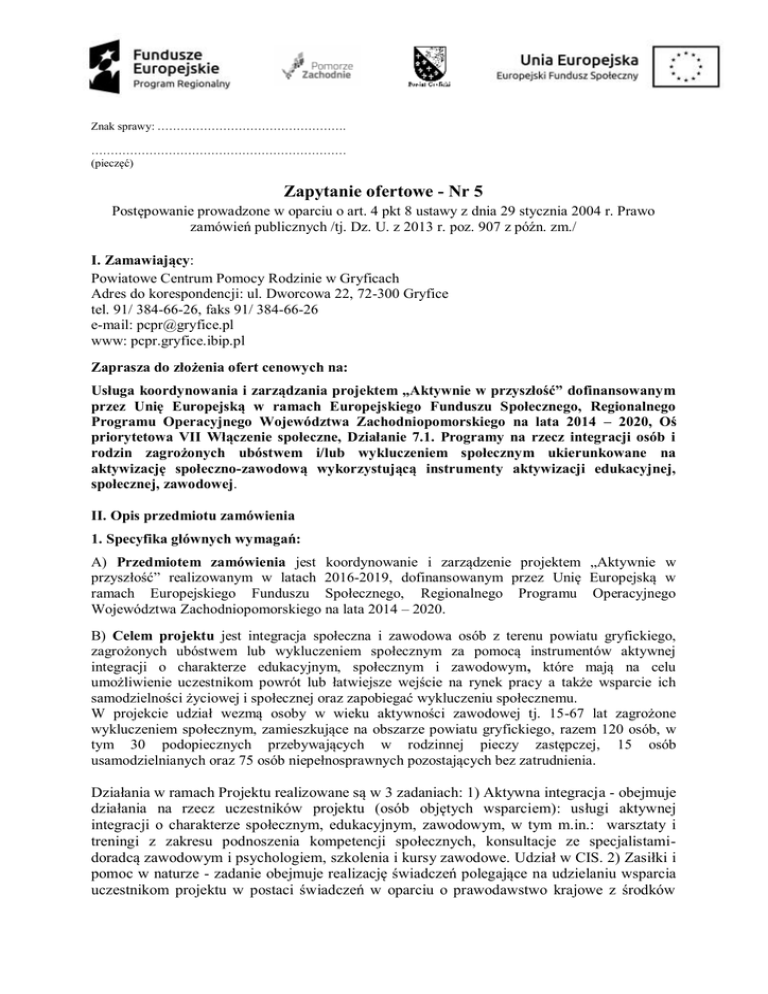 Znak sprawy: …………………………………………. ………………………………………………………… (pieczęć) Zapytanie ofertowe - Nr 5 Postępowanie prowadzone w oparciu o art. 4 pkt 8 ustawy z dnia 29 stycznia 2004 r. Prawo zamówień publicznych /tj. Dz. U. z 2013 r. poz. 907 z późn. zm./ I. Zamawiający: Powiatowe Centrum Pomocy Rodzinie w Gryficach Adres do korespondencji: ul. Dworcowa 22, 72-300 Gryfice tel. 91/ 384-66-26, faks 91/ 384-66-26 e-mail: [email protected] www: pcpr.gryfice.ibip.pl Zaprasza do złożenia ofert cenowych na: Usługa koordynowania i zarządzania projektem „Aktywnie w przyszłość” dofinansowanym przez Unię Europejską w ramach Europejskiego Funduszu Społecznego, Regionalnego Programu Operacyjnego Województwa Zachodniopomorskiego na lata 2014 – 2020, Oś priorytetowa VII Włączenie społeczne, Działanie 7.1. Programy na rzecz integracji osób i rodzin zagrożonych ubóstwem i/lub wykluczeniem społecznym ukierunkowane na aktywizację społeczno-zawodową wykorzystującą instrumenty aktywizacji edukacyjnej, społecznej, zawodowej. II. Opis przedmiotu zamówienia 1. Specyfika głównych wymagań: A) Przedmiotem zamówienia jest koordynowanie i zarządzenie projektem „Aktywnie w przyszłość” realizowanym w latach 2016-2019, dofinansowanym przez Unię Europejską w ramach Europejskiego Funduszu Społecznego, Regionalnego Programu Operacyjnego Województwa Zachodniopomorskiego na lata 2014 – 2020. B) Celem projektu jest integracja społeczna i zawodowa osób z terenu powiatu gryfickiego, zagrożonych ubóstwem lub wykluczeniem społecznym za pomocą instrumentów aktywnej integracji o charakterze edukacyjnym, społecznym i zawodowym, które mają na celu umożliwienie uczestnikom powrót lub łatwiejsze wejście na rynek pracy a także wsparcie ich samodzielności życiowej i społecznej oraz zapobiegać wykluczeniu społecznemu. W projekcie udział wezmą osoby w wieku aktywności zawodowej tj. 15-67 lat zagrożone wykluczeniem społecznym, zamieszkujące na obszarze powiatu gryfickiego, razem 120 osób, w tym 30 podopiecznych przebywających w rodzinnej pieczy zastępczej, 15 osób usamodzielnianych oraz 75 osób niepełnosprawnych pozostających bez zatrudnienia. Działania w ramach Projektu realizowane są w 3 zadaniach: 1) Aktywna integracja - obejmuje działania na rzecz uczestników projektu (osób objętych wsparciem): usługi aktywnej integracji o charakterze społecznym, edukacyjnym, zawodowym, w tym m.in.: warsztaty i treningi z zakresu podnoszenia kompetencji społecznych, konsultacje ze specjalistamidoradcą zawodowym i psychologiem, szkolenia i kursy zawodowe. Udział w CIS. 2) Zasiłki i pomoc w naturze - zadanie obejmuje realizację świadczeń polegające na udzielaniu wsparcia uczestnikom projektu w postaci świadczeń w oparciu o prawodawstwo krajowe z środków własnych. 3) działanie o charakterze środowiskowym obejmujące organizację 3 imprez o charakterze integracyjnym skierowanych do uczestników projektu i ich otoczenia oraz mieszkańców powiatu gryfickiego. C) Cel i zakres usługi: Koordynowanie i zarządzanie projektem pn. „Aktywnie w przyszłość” realizowanego w latach 2016-2019 w ramach RPO WZ i odpowiedzialność za realizację projektu zgodnie z jego założeniami. Wykonawca zobowiązany jest do realizacji zadań zapewniających wykonanie usługi koordynowania i zarządzania projektem w wymiarze 80 godzin miesięcznie, w tym: a) Planowanie, organizowanie i realizacja wszystkich działań w projekcie zgodnie z zapisami umowy o dofinansowanie, wniosku o dofinansowanie, w tym harmonogramem realizacji projektu oraz płatności, dokumentami programowymi, przepisami prawa oraz umową ramową projektu, b) Opracowanie planów wydatków i nadzór nad ich realizacją, uzgadnianie wszelkich decyzji finansowych z zamawiającym, c) Przygotowanie procedur realizacji projektu i wzorów dokumentów, formularzy i nadzorowanie kompletowania dokumentów uczestników projektu, d) Bieżące monitorowanie procesu rekrutacji uczestników projektu, e) Bieżące monitorowanie i nadzorowanie realizacji projektu oraz jego postępu rzeczowego i finansowego, f) Podejmowanie niezbędnych działań mających na celu osiągnięcie wskaźników rezultatu projektu, g) Inicjowanie zmian i przeprowadzenie procedury dokonywania zgłoszenia zmian w projekcie, po ich uzgodnieniu z zamawiającym, h) Ocena i odpowiedzialność za osiągnięcie rezultatów i celów projektu, i) Ścisła współpraca z Działem finansowym oraz personelem projektu i koordynacja pracy zespołu, j) Inicjowanie, organizacja i prowadzenie spotkań zespołu projektowego, k) Kontakt z instytucją pośredniczącą oraz Powiatowym Urzędem Pracy, utrzymywanie stałych kontaktów z opiekunem projektu w IP, l) Bieżąca kontrola kwalifikowalności i wydatków, m) sporządzanie części merytorycznej wniosku o płatność, nadzór nad prawidłowym i terminowym składaniem wniosków o płatność w systemie SL 2014, n) nadzorowanie terminowego sporządzania wniosków o płatność wraz z zebraniem wszystkich załączników, o) prawidłowe wydatkowanie funduszy, przygotowywanie dokumentacji i przeprowadzanie postępowań w zakresie zakupów i wyboru usług zgodnie z prawem zamówień publicznych, zasadami kwalifikowalności wydatków i wprowadzanie danych do systemu SL2014 zgodnie z wytycznymi oraz przygotowywanie projektów umów z wykonawcami, p) kontakt z wykonawcami zadań i usług, nadzór nad prawidłowością realizacji umów, q) prowadzenie działań promocyjno – informacyjnych zgodnie z aktualnie obowiązującymi wytycznymi oraz umową o dofinansowanie i wnioskiem, r) kontrola jakości realizowanych zadań pod kątem osiągania założonych wskaźników, s) kontrola wydatkowania środków, przygotowywanie i uzgadnianie z zamawiającym zmian w budżecie projektu, t) koordynacja korespondencji związanej z projektem i weryfikowanie 