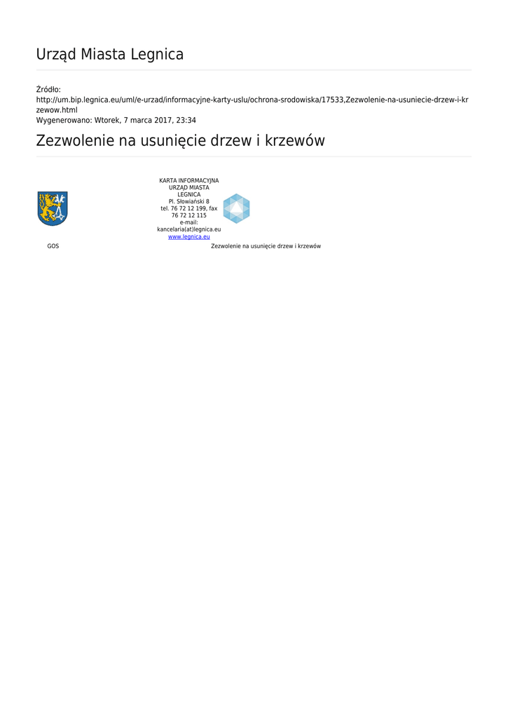 Urząd Miasta Legnica Źródło: http://um.bip.legnica.eu/uml/e-urzad/informacyjne-karty-uslu/ochrona-srodowiska/17533,Zezwolenie-na-usuniecie-drzew-i-kr zewow.html Wygenerowano: Wtorek, 7 marca 2017, 23:34 Zezwolenie na usunięcie drzew i krzewów KARTA INFORMACYJNA URZĄD MIASTA LEGNICA Pl. Słowiański 8 tel. 76 72 12 199, fax 76 72 12 115 e-mail: kancelaria(at)legnica.eu www.legnica.eu GOS Zezwolenie na usunięcie drzew i krzewów Kto może wystąpić z wnioskiem o usunięcie drzew lub krzewów: 1. Usunięcie drzewa lub krzewu z terenu nieruchomości może nastąpić po uzyskaniu zezwolenia wydanego na wniosek: 1) posiadacza nieruchomości – za zgodą właściciela tej nieruchomości; 2) właściciela urządzeń, o których mowa w art. 49 § 1 ustawy z dnia 23 kwietnia 1964 r. – Kodeks cywilny (t. j. Dz. U. z 2016 r. poz. 380, z późn. zm.), zwanej dalej „Kodeksem cywilnym” – jeżeli drzewo lub krzew zagrażają funkcjonowaniu tych urządzeń. 2. Zgoda właściciela nieruchomości, o której mowa w ust. 1 pkt 1, nie jest wymagana w przypadku wniosku złożonego przez: 1) spółdzielnię mieszkaniową; 2) wspólnotę mieszkaniową, w której właściciele lokali powierzyli zarząd nieruchomością wspólną zarządowi, zgodnie z ustawą z dnia 24 czerwca 1994 r. o własności lokali (t. j. Dz. U. z 2015 r., poz. 1892); 3) zarządcę nieruchomości będącej własnością Skarbu Państwa. 3. Zgoda właściciela nieruchomości, o której mowa w ust. 1 pkt 1, nie jest wymagana także w przypadku wniosku złożonego przez użytkownika wieczystego lub posiadacza nieruchomości o nieuregulowanym stanie prawnym, niebędących podmiotem, o którym mowa w ust. 2. 4. Spółdzielnia mieszkaniowa informuje, w sposób zwyczajowo przyjęty, członków spółdzielni, właścicieli budynków lub lokali niebędących członkami spółdzielni oraz osoby niebędące członkami spółdzielni, którym przysługują spółdzielcze własnościowe prawa do lokali, a zarząd wspólnoty mieszkaniowej – członków wspólnoty, o zamiarze złożenia wniosku o wydanie zezwolenia na usunięcie drzewa lub krzewu, wyznaczając co najmniej 30-dniowy termin na zgłaszanie uwag. Wniosek może być złożony nie później niż w terminie 12 miesięcy od upływu terminu na zgłaszanie uwag.”; Dla jakich drzew i krzewów nie jest wymagane zezwolenie: Przepisów art. 83 ust. 1 ustawy z dnia 16 kwietnia 2004 r. o ochronie przyrody (tekst jednolity Dz. U. z 2016 r. poz. 2134, z późn. zm.) nie stosuje się m.in. do: - drzew lub krzewów, które rosną na nieruchomościach (z wyłączniem terenów wpisanych do rejestru zabytków) stanowiących własność osób fizycznych i są usuwane na cele niezwiązane z prowadzeniem działalności gospodarczej; - krzewu albo krzewów rosnących w skupisku, o powierzchni do 25 m2; - krzewów na terenach pokrytych roślinnością pełniącą funkcje ozdobne, urządzoną pod względem rozmieszczenia i doboru gatunków posadzonych roślin, z wyłączeniem krzewów w pasie drogowym drogi publicznej, na terenie nieruchomości wpisanej do rejestru zabytków oraz na terenach zieleni; - drzew, których obwód pnia na wysokości 130 cm nie przekracza: a) 100 cm – w przypadku topoli, wierzb, kasztanowca zwyczajnego, klonu jesionolistnego, klonu srebrzystego, robinii akacjowej oraz platanu klonolistnego, b) 50 cm – w przypadku pozostałych gatunków drzew; - drzew lub krzewów usuwanych w celu przywrócenia gruntów nieużytkowanych do użytkowania rolniczego; - drzew lub krzewów owocowych, z wyłączeniem rosnących na terenie nieruchomości wpisanej do rejestru zabytków lub na terenach zieleni; - prowadzenia akcji ratowniczej przez jednostki ochrony przeciwpożarowej lub inne właściwe służby ustawowo powołane do niesienia pomocy osobom w stanie nagłego zagrożenia życia lub zdrowia; - drzew lub krzewów stanowiących złomy lub wywroty usuwanych przez: a) jednostki ochrony przeciwpożarowej, jednostki Sił Zbrojnych Rzeczypospolitej Polskiej, właścicieli urządzeń, o których mowa w art. 49 § 1 Kodeksu cywilnego, zarządców dróg, zarządców infrastruktury kolejowej, gminne lub powiatowe jednostki oczyszczania lub inne podmioty działające w tym zakresie na zlecenie gminy lub powiatu, b) inne podmioty lub osoby, po przeprowadzeniu oględzin przez organ właściwy do wydania zezwolenia na usunięcie drzewa lub krzewu, potwierdzających, że drzewa lub krzewy stanowią złom lub wywrot; - drzew lub krzewów należących do gatunków obcych, określonych w przepisach wydanych na podstawie art. 120 ust. 2f. UWAGA: Zgodnie z art. 85 ust. 2 ustawy o ochronie przyrody: Jeżeli drzewo na wysokości 130 cm: 1) posiada kilka pni - za obwód pnia drzewa przyjmuje się sumę obwodu pnia o największym obwodzie oraz połowy obwodów pozostałych pni; 2) nie posiada pnia - za obwód pnia drzewa przyjmuje się obwód pnia mierzony bezpośrednio poniżej korony drzewa. Wymagane dokumenty: Wniosek o wydanie zezwolenia na usunięcie drzewa lub krzewu, który zawiera: 1) imię, nazwisko i adres albo nazwę i siedzibę posiadacza i właściciela nieruchomości albo właściciela urządzeń, o których mowa w art. 49 § 1 Kodeksu cywilnego; 2) oświadczenie o posiadanym tytule prawnym władania nieruchomością albo oświadczenie o posiadanym prawie własności urządzeń, o których mowa w art. 49 § 1 Kodeksu cywilnego; 3) zgodę właściciela nieruchomości, jeżeli jest wymagana, lub oświadczenie o udostępnieniu informacji, o której mowa w art. 83 ust. 4; 4) nazwę gatunku drzewa lub krzewu; 5) obwód pnia drzewa mierzony na wysokości 130 cm, a w przypadku gdy na tej wysokości drzewo: a) posiada kilka pni – obwód każdego z tych pni, b) nie posiada pnia – obwód pnia bezpośrednio poniżej korony drzewa; 6) wielkość powierzchni, z której zostanie usunięty krzew; 7) miejsce, przyczynę, termin zamierzonego usunięcia drzewa lub krzewu, oraz wskazanie czy usunięcie w
