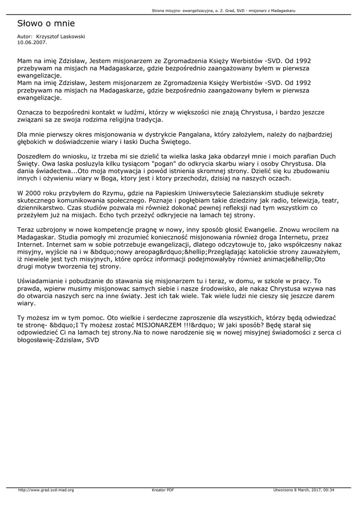 Strona misyjno- ewangelizacyjna, o. Z. Grad, SVD - misjonarz z Madagaskaru Słowo o mnie Autor: Krzysztof Laskowski 10.06.2007. Mam na imię Zdzisław, Jestem misjonarzem ze Zgromadzenia Księży Werbistów -SVD. Od 1992 przebywam na misjach na Madagaskarze, gdzie bezpośrednio zaangażowany byłem w pierwsza ewangelizacje. Mam na imię Zdzisław, Jestem misjonarzem ze Zgromadzenia Księży Werbistów -SVD. Od 1992 przebywam na misjach na Madagaskarze, gdzie bezpośrednio zaangażowany byłem w pierwsza ewangelizacje. Oznacza to bezpośredni kontakt w ludźmi, którzy w większości nie znają Chrystusa, i bardzo jeszcze związani sa ze swoja rodzima religijna tradycja. Dla mnie pierwszy okres misjonowania w dystrykcie Pangalana, który założyłem, należy do najbardziej głębokich w doświadczenie wiary i łaski Ducha Świętego. Doszedłem do wniosku, iz trzeba mi sie dzielić ta wielka laska jaka obdarzył mnie i moich parafian Duch Święty. Owa laska posluzyla kilku tysiącom "pogan" do odkrycia skarbu wiary i osoby Chrystusa. Dla dania świadectwa...Oto moja motywacja i powód istnienia skromnej strony. Dzielić się ku zbudowaniu innych i ożywieniu wiary w Boga, ktory jest i ktory przechodzi, dzisiaj na naszych oczach. W 2000 roku przybyłem do Rzymu, gdzie na Papieskim Uniwersytecie Salezianskim studiuje sekrety skutecznego komunikowania społecznego. Poznaje i pogłębiam takie dziedziny jak radio, telewizja, teatr, dziennikarstwo. Czas studiów pozwala mi również dokonać pewnej refleksji nad tym wszystkim co przeżyłem już na misjach. Echo tych przeżyć odkryjecie na lamach tej strony. Teraz uzbrojony w nowe kompetencje pragnę w nowy, inny sposób głosić Ewangelie. Znowu wrocilem na Madagaskar. Studia pomogły mi zrozumieć konieczność misjonowania również droga Internetu, przez Internet. Internet sam w sobie potrzebuje ewangelizacji, dlatego odczytowuje to, jako współczesny nakaz misyjny, wyjście na i w „nowy areopag”…Przeglądając katolickie strony zauważyłem, iż niewiele jest tych misyjnych, które oprócz informacji podejmowałyby również animacje…Oto drugi motyw tworzenia tej strony. Uświadamianie i pobudzanie do stawania się misjonarzem tu i teraz, w domu, w szkole w pracy. To prawda, wpierw musimy misjonowac samych siebie i nasze środowisko, ale nakaz Chrystusa wzywa nas do otwarcia naszych serc na inne światy. Jest ich tak wiele. Tak wiele ludzi nie cieszy się jeszcze darem wiary. Ty możesz im w tym pomoc. Oto wielkie i serdeczne zaproszenie dla wszystkich, którzy będą odwiedzać te stronę- „I Ty możesz zostać MISJONARZEM !!!” W jaki sposób? Będę starał się odpowiedzieć Ci na lamach tej strony.Na to nowe narodzenie się w nowej misyjnej świadomości z serca ci błogosławię-Zdzislaw, SVD http://www.grad.svd-mad.org Kreator PDF Utworzono 8 March, 2017, 00:34