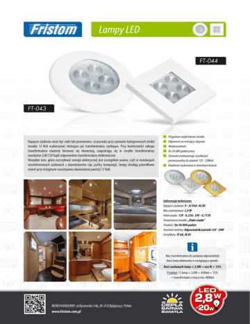 Lampy LED FT-044 FT-043 Napięcie zasilania może być stałe lub przemienne, co pozwala przy zamianie halogenowych źródeł światła 12 Volt wykorzystać istniejące już transformatory zasilające. Przy konieczności zakupu transformatora możemy kierować się ekonomią, zaopatrując się w zwykłe transformatory toroidalne 230/12V bądź odpowiednie transformatory elektroniczne. Wszędzie tam, gdzie oszczędność energii elektrycznej jest szczególnie ważna, czyli w instalacjach oświetleniowych zasilanych z akumulatorów (np. jachty, kampingi), lampy działają prawidłowo nawet przy wstępnym wyczerpaniu akumulatora poniżej 12 Volt. Przyjemna ciepła barwa światła Odporność na wstrząsy i drgania Wodoszczelność Do 50.000 godzin pracy Strumień emitowanego światła jest porównywalny do żarówki 12V - 20Watt Możliwość wykonania w dowolnym kolorze Informacje techniczne: Napięcie zasilania: 9 - 36 Volt AC/DC Moc znamionowa: 2,8 W Pobór prądu: 12V - 0,23A; 24V - 0,115A Temperatura światła: „Biała ciepła” Trwałość: Do 50.000 godzin Strumień świetlny: Odpowiednik żarówki 12V - 20W Certyfikaty: IP 68, IK 03 Moc transformatora do zasilania odpowiedniej ilości lamp dobieramy w następujący sposób: Ilość zasilanych lamp × 2,8W = xxx W + 15% Przykład: 15 lamp × 2,8W = 42Watt + 15% = transformator o mocy min. 48Watt BIURO HANDLOWE: ul.Byszewska 54a, 85-416 Bydgoszcz, Polska www.fristom.com.pl FT-043 Ø92 Ø55 FT-043 B lampa oświetlenia wnętrza 4-LED okrągła biała FT-043 S lampa oświetlenia wnętrza 4-LED okrągła srebrna FT-043 ZL lampa oświetlenia wnętrza 4-LED okrągła złota możliwość wykonania w dowolnym kolorze 76 FT-044 76 18.3 26 przykładowa płyta GK FT-044 B lampa oświetlenia wnętrza 4-LED kwadratowa biała FT-044 S lampa oświetlenia wnętrza 4-LED kwadratowa srebrna FT-044 ZL lampa oświetlenia wnętrza 4-LED kwadratowa złota możliwość wykonania w dowolnym kolorze Ø60 4 Ø60 13 Ø92 26 17.5 przykładowa płyta GK