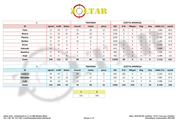 1 TRAFIENIA ZUŻYTA AMUNICJA ID zginał trafił bilans brzuch ramię plecy UZI D-D Mhgun Shg Snp efekt.(%) wynik Foka 12 49 37 33 39 15 3030 32 0 0 0 1.600 49.0 Wisnia 9 33 24 19 16 6 2700 0 0 0 0 1.222 33.0 Plastus 20 18 -2 8 10 3 2250 3 0 0 0 0.799 18.0 Beliber 8 17 9 15 6 3 1320 7 0 0 0 1.281 17.0 Kicius 14 10 -4 7 3 2 1320 0 0 0 0 0.758 10.0 Kidrauhl 12 7 -5 4 3 2 870 5 0 0 0 0.800 7.0 Bambino 17 4 -13 2 2 0 390 0 0 0 0 1.026 4.0 Klajf 12 3 -9 2 1 0 750 1 0 0 0 0.399 3.0 Suma 104 141 37 90 80 31 12630 48 0 0 0 1.112 141 2 TRAFIENIA ZUŻYTA AMUNICJA ID zginał trafił bilans brzuch ramię plecy UZI D-D Mhgun Shg Snp efekt.(%) wynik Szwqrcu 56 54 -2 39 32 11 930 100 0 0 0 5.243 54.0 BinLaden 49 37 -12 27 27 7 420 43 0 0 0 7.991 37.0 Lufa 36 13 -23 10 0 3 0 0 510 3 10 2.486 13.0 Suma 141 104 -37 76 59 21 1350 143 510 3 10 5.159 104 Zoltar B-B - ul.Sukiennicza 3, 43-300 Bielsko-Biała Tel.:+48 791 121 530, e-mail:[email protected] 1 2 141 104 Strona 1 z 6 Data: 2016-09-29; Godzina: 14:47; Czas gry: 23minut Prowadzący: Gamemaster ZOLTAR 1 TRAFIENIA ZUŻYTA AMUNICJA ID zginał trafił bilans brzuch ramię plecy UZI D-D Mhgun efekt.(%) wynik Foka 40 74 35 52 57 15 4170 7 0 1.772 74.0 Plastus 36 69 33 43 56 21 0 162 0 42.593 69.0 Bambino 23 22 -1 10 15 2 1110 0 0 1.982 22.0 Kicius 27 20 -7 11 8 6 2310 12 0 0.861 20.0 Klajf 18 6 -12 3 5 3 480 3 0 1.242 6.0 Beliber 40 3 -37 1 1 1 0 0 450 0.667 3.0 Suma 184 194 11 120 142 48 8070 184 450 2.229 194 2 TRAFIENIA ZUŻYTA AMUNICJA ID zginał trafił bilans brzuch ramię plecy UZI D-D Mhgun efekt.(%) wynik Wisnia 55 62 7 48 52 20 300 141 0 14.059 62.0 BinLaden 40 43 3 31 28 9 180 99 0 15.412 43.0 Szwqrcu 38 41 3 28 23 8 3600 8 0 1.136 41.0 Kidrauhl 36 28 -8 20 9 2 2340 0 0 1.197 28.0 Lufa 25 9 -16 5 4 1 2850 1 0 0.316 9.0 Suma 194 183 -11 132 116 40 9270 249 0 1.922 183 Zoltar B-B - ul.Sukiennicza 3, 43-300 Bielsko-Biała Tel.:+48 791 121 530, e-mail:[email protected] 1 2 194 183 Strona 2 z 6 Data: 2016-09-29; Godzina: 15:19; Czas gry: 23minut Prowadzący: Gamemaster ZOLTAR Drużyny Miejsce Nazwa Zoltar B-B - ul.Sukiennicza 3, 43-300 Bielsko-Biała Tel.:+48 791 121 530, e-mail:[email protected] Rozgrywki 1 2 Suma 1 141 194 335 2 104 183 287 Strona 3 z 6 Data: 2016-09-29 Prowadzący: Gamemaster ZOLTAR Zestawienie wg wyniku Miejsce TRAFIENIA ZUŻYTA AMUNICJA ID zginał trafił bilans brzuch ramię plecy UZI D-D Mhgun Shg Snp efekt.(%) wynik Foka 67.83 160.43 92.61 110.87 125.22 39.13 9391.30 50.87 0.00 0.00 0.00 1.699 160.43 Szwqrcu 122.61 123.91 1.30 87.39 71.74 24.78 5908.70 140.87 0.00 0.00 0.00 2.048 Wisnia 83.48 123.91 40.43 87.39 88.70 33.91 3913.04 183.91 0.00 0.00 0.00 3.025 Plastus 73.04 113.48 40.43 66.52 86.09 31.30 2934.78 215.22 0.00 0.00 0.00 3.602 113.48 4 BinLaden 116.09 104.35 -11.74 75.65 71.74 20.87 782.61 185.22 0.00 0.00 0.00 10.782 104.35 5 Kidrauhl 62.61 45.65 -16.96 31.30 15.65 5.22 4186.96 6.52 0.00 0.00 0.00 1.089 45.65 6 Kicius 53.48 39.13 -14.35 23.48 14.35 10.43 4734.78 15.65 0.00 0.00 0.00 0.824 39.13 7 Bambino 52.17 33.91 -18.26 15.65 22.17 2.61 1956.52 0.00 0.00 0.00 0.00 1.733 33.91 8 Lufa 79.57 28.70 -50.87 19.57 5.22 5.22 3717.39 1.30 665.22 3.91 13.04 0.652 28.70 9 Beliber 62.61 26.09 -36.52 20.87 9.13 5.22 1721.74 9.13 586.96 0.00 0.00 1.125 26.09 10 Klajf 39.13 11.74 -27.39 6.52 7.83 3.91 1604.35 5.22 0.00 0.00 0.00 0.729 11.74 Zoltar B-B - ul.Sukiennicza 3, 43-300 Bielsko-Biała Tel.:+48 791 121 530, e-mail:[email protected] Strona 4 z 6 123.91 Data: 2016-09-29 Prowadzący: Gamemaster ZOLTAR Zestawienie wg bilansu Miejsce TRAFIENIA ZUŻYTA AMUNICJA ID zginał trafił bilans brzuch ramię plecy UZI D-D Mhgun Shg Snp efekt.(%) wynik Foka 67.83 160.43 92.61 110.87 125.22 39.13 9391.30 50.87 0.00 0.00 0.00 1.699 160.43 Plastus 73.04 113.48 66.52 86.09 31.30 2934.78 215.22 0.00 0.00 0.00 3.602 113.48 Wisnia 83.48 123.91 87.39 88.70 33.91 3913.04 183.91 0.00 0.00 0.00 3.025 123.91 Szwqrcu 122.61 123.91 1.30 87.39 71.74 24.78 5908.70 140.87 0.00 0.00 0.00 2.048 123.91 4 BinLaden 116.09 104.35 -11.74 75.65 71.74 20.87 782.61 185.22 0.00 0.00 0.00 10.782 104.35 5 Kicius 53.48 39.13 -14.35 23.48 14.35 10.43 4734.78 15.65 0.00 0.00 0.00 0.824 39.13 6 Kidrauhl 62.61 45.65 -16.96 31.30 15.65 5.22 4186.96 6.52 0.00 0.00 0.00 1.089 45.65 7 Bambino 52.17 33.91 -18.26 15.65 22.17 2.61 1956.52 0.00 0.00 0.00 0.00 1.733 33.91 8 Klajf 39.13 11.74 -27.39 6.52 7.83 3.91 1604.35 5.22 0.00 0.00 0.00 0.729 11.74 9 Beliber 62.61 26.09 -36.52 20.87 9.13 5.22 1721.74 9.13 586.96 0.00 0.00 1.125 26.09 10 Lufa 79.57 28.70 -50.87 19.57 5.22 5.22 3717.39 1.30 665.22 3.91 13.04 0.652 28.70 Zoltar B-B - ul.Sukiennicza 3, 43-300 Bielsko-Biała Tel.:+48 791 121 530, e-mail:[email protected] 40.43 Strona 5 z 6 Data: 2016-09-29 Prowadzący: Gamemaster ZOLTAR Zestawienie wg efektywności Miejsce TRAFIENIA ZUŻYTA AMUNICJA ID zginał trafił bilans brzuch ramię plecy UZI D-D Mhgun Shg Snp efekt.(%) wynik BinLaden 116.09 104.35 -11.74 75.65 71.74 20.87 782.61 185.22 0.00 0.00 0.00 10.782 104.35 Plastus 73.04 113.48 40.43 66.52 86.09 31.30 2934.78 215.22 0.00 0.00 0.00 3.602 113.48 Wisnia 83.48 123.91 40.43 87.39 88.70 33.91 3913.04 183.91 0.00 0.00 0.00 3.025 123.91 4 Szwqrcu 122.61 123.91 1.30 87.39 71.74 24.78 5908.70 140.87 0.00 0.00 0.00 2.048 123.91 5 Bambino 52.17 33.91 -18.26 15.65 22.17 2.61 1956.52 0.00 0.00 0.00 0.00 1.733 33.91 6 Foka 67.83 160.43 92.61 110.87 125.22 39.13 9391.30 50.87 0.00 0.00 0.00 1.699 160.43 7 Beliber 62.61 26.09 -36.52 20.87 9.13 5.22 1721.74 9.13 586.96 0.00 0.00 1.125 26.09 8 Kidrauhl 62.61 45.65 -16.96 31.30 15.65 5.22 4186.96 6.52 0.00 0.00 0.00 1.089 45.65 9 Kicius 53.48 39.13 -14.35 23.48 14.35 10.43 4734.78 15.65 0.00 0.00 0.00 0.824 39.13 10 Klajf 39.13 11.74 -27.39 6.52 7.83 3.91 1604.35 5.22 0.00 0.00 0.00 0.729 11.74 11 Lufa 79.57 28.70 -50.87 19.57 5.22 5.22 3717.39 1.30 665.22 3.91 13.04 0.652 28.70 Zoltar B-B - ul.Sukiennicza 3, 43-300 Bielsko-Biała Tel.:+48 791 121 530, e-mail:[email protected] Strona 