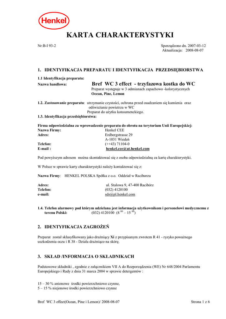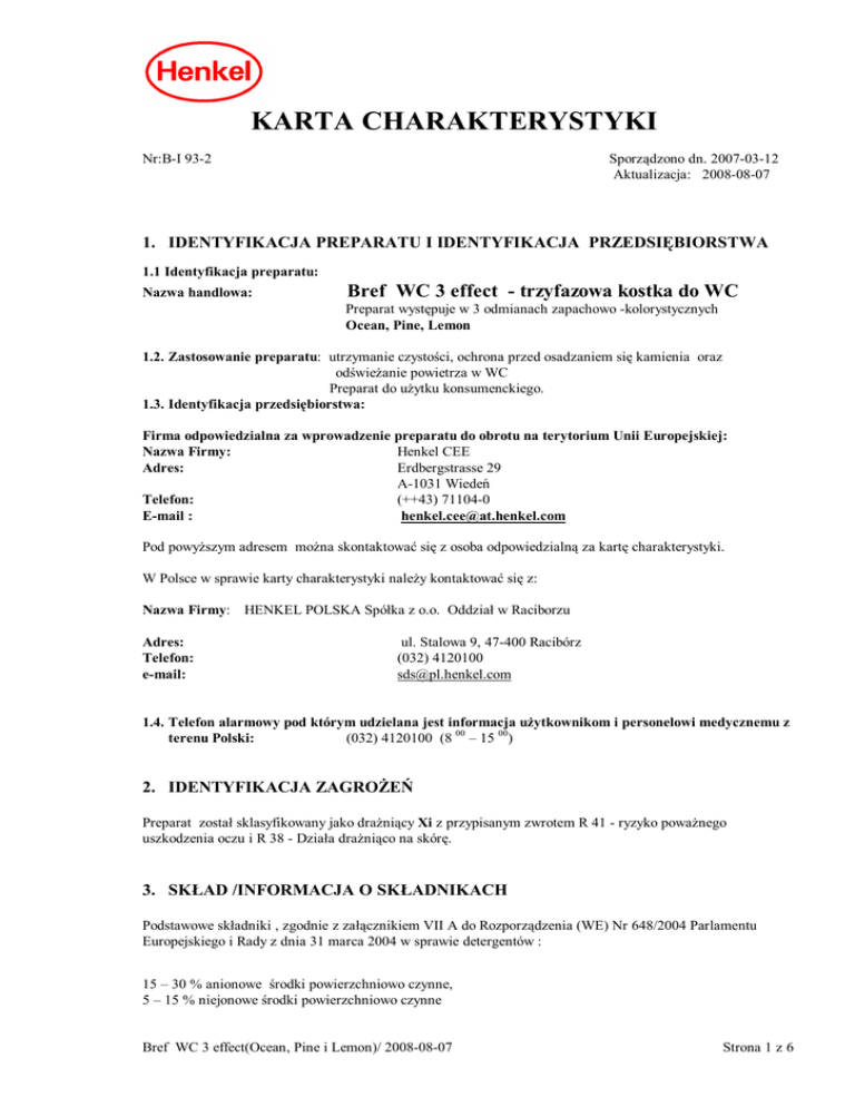KARTA CHARAKTERYSTYKI Nr:B-I 93-2 Sporz dzono dn. 2007-03-12 Aktualizacja: 2008-08-07 1. IDENTYFIKACJA PREPARATU I IDENTYFIKACJA PRZEDSI BIORSTWA 1.1 Identyfikacja preparatu: Nazwa handlowa: Bref WC 3 effect - trzyfazowa kostka do WC Preparat wyst puje w 3 odmianach zapachowo -kolorystycznych Ocean, Pine, Lemon 1.2. Zastosowanie preparatu: utrzymanie czysto ci, ochrona przed osadzaniem si kamienia oraz od wie anie powietrza w WC Preparat do u ytku konsumenckiego. 1.3. Identyfikacja przedsi biorstwa: Firma odpowiedzialna za wprowadzenie preparatu do obrotu na terytorium Unii Europejskiej: Nazwa Firmy: Henkel CEE Adres: Erdbergstrasse 29 A-1031 Wiede Telefon: (++43) 71104-0 E-mail : [email protected] Pod powy szym adresem mo na skontaktowa si z osoba odpowiedzialn za kart charakterystyki. W Polsce w sprawie karty charakterystyki nale y kontaktowa si z: Nazwa Firmy: HENKEL POLSKA Spó ka z o.o. Oddzia w Raciborzu Adres: Telefon: e-mail: ul. Stalowa 9, 47-400 Racibórz (032) 4120100 [email protected] 1.4. Telefon alarmowy pod którym udzielana jest informacja u ytkownikom i personelowi medycznemu z terenu Polski: (032) 4120100 (8 00 – 15 00) 2. IDENTYFIKACJA ZAGRO Preparat zosta sklasyfikowany jako dra ni cy Xi z przypisanym zwrotem R 41 - ryzyko powa nego uszkodzenia oczu i R 38 - Dzia a dra ni co na skór . 3. SK AD /INFORMACJA O SK ADNIKACH Podstawowe sk adniki , zgodnie z za cznikiem VII A do Rozporz dzenia (WE) Nr 648/2004 Parlamentu Europejskiego i Rady z dnia 31 marca 2004 w sprawie detergentów : 15 – 30 % anionowe rodki powierzchniowo czynne, 5 – 15 % niejonowe rodki powierzchniowo czynne Bref WC 3 effect(Ocean, Pine i Lemon)/ 2008-08-07 Strona 1 z 6 Zawiera kompozycj zapachow a w niej nast puj ce alergeny: - w odmianie Ocean : Amyl Cinnamal /*, Citral /*, Alpha-Isomethyl Ionone /*, Hexyl Cinnamal /*, - w odmianie Pine : Linallol /*,Hexyl Cinnamal /*, Citronellol/*,Limonene /*, Buthylphenyl Methylpropional/* w odmianie Lemon : Limonene/*,Citral/*, Linalool/*. Substancje niebezpieczne wchodz ce w sk ad preparatu : Sole sodowe siarczanowanych alkoholi t uszczowych Zawarto : 15 – 30 % CAS: 68955-19-1 WE:273-257-1 Klasyfikacja: Xi Zwroty R:37/38, 41 /** glan disodu Zawarto : 1 - 5 % CAS:497-19-8 WE: 207-838-8 Klasyfikacja: Xi Zwroty R: 36/* 2- aminoetanol ( monoetamoloamina) Zawarto : 1 - 5 % CAS:141-43-5 WE: 205-483-3 Klasyfikacja: Xi Zwroty R: 20/21/22, 34/** /* - nazwa INCI /** - pe ne brzmienie zwrotów R – patrz p. 16 4. PIERWSZA POMOC Ogólna informacja: Przy wyst pieniu dolegliwo ci skonsultowa si z lekarzem. Po zanieczyszczeniu oczu: Wyp uka oczy pod bie wod ( du ilo ci ) i zasi gn Po kontakcie ze skór : Zanieczyszczone powierzchnie skóry sp uka pod bie konieczne zasi gn porady lekarza. porady okulisty. wod . Zdj zanieczyszczon odzie . Je li to Po wdychaniu: Zagro enie nie wyst puje. Po po kni ciu : Wyp uka usta i gard o, wypi 1 – 2 szklanki wody. Zasi gn porady lekarza. 5. POST POWANIE W PRZYPADKU PO ARU Odpowiednie rodki ga nicze: powszechnie stosowane rodki ga nicze. Przy gaszeniu po aru nale y wzi pod uwag dodatkowo zalecenia dotycz ce rodków ga niczych odpowiednich do materia ów sk adowanych w pobli u. rodki ga nicze nieodpowiednie ze wzgl dów bezpiecze stwa: nie znane Specjalny sprz t ochronny dla stra aków: nie znane Bref WC 3 effect(Ocean, Pine i Lemon)/ 2008-08-07 Strona 2 z 6 6. POST POWANIE W PRZYPADKU NIEZAMIERZONEGO UWOLNIENIA DO RODOWISKA Indywidualne rodki ostro no ci: unika kontaktu z oczami i skór . Zapewni odpowiedni wentylacj rodki ostro no ci w odniesieniu do rodowiska: Uniemo liwi przedostanie si do wód powierzchniowych i gruntowych. Metody oczyszczania: Zebra mechanicznie. Pozosta sp uka du ilo ci wody. 7. POST POWANIE Z PREPARATEM I JEGO MAGAZYNOWANIE 7.1 Post powanie z preparatem: rodki ostro no ci gwarantuj ce bezpieczne obchodzenie si z preparatem: przy prawid owym obchodzeniu si z preparatem adne szczególne rodki nie s wymagane rodki zapobiegaj ce po arom oraz eksplozjom: przy prawid owym obchodzeniu si z preparatem adne szczególne rodki nie s wymagane 7.2 Magazynowanie: Warunki przechowywania : przechowywa w suchym miejscu w temperaturze od 5 ° C do 40 ° C 8.KONTROLA NARA ENIA I RODKI OCHRONY INDYWIDUALNEJ 8.1Warto ci graniczne nara enia (drog oddechow dla 2-aminoetanol-u NDS: 2,5 mg/m3 , NDSCh: 7,5 mg/m3 8.2 Kontrola nara enia: 8.2.1 Kontrola nara enia w miejscu pracy: rodki ochrony osobistej: a) Ochrona dróg oddechowych: nie wymagana b) Ochrona r k: u ywa r kawic odpornych na chemikalia ( r kawice nitrylowe o grubo ci 0,1 mm) Uwzgl dnia zalecenia producenta r kawic. c) Ochrona oczu: u ywa dok adnie dopasowanych okularów ochronnych (gogli) d) Ochrona cia a: nosi odzie ochronn odporn na chemikalia. Uwzgl dnia zalecenia producenta odzie y. rodki bezpiecze stwa: unika kontaktu z oczami i skór . Zanieczyszczon lub zamoczon odzie natychmiast zdj . Zanieczyszczon skór zmy wod . Na krem ochronny. Pozosta e informacje: rodki ochrony oraz kontrolowanie st granicznych s wymagane w przypadku operowania preparatem w warunkach przemys owych lub jego du ymi ilo ciami. Nie jest to konieczne przy ywaniu preparatu w gospodarstwach domowych. 9. W CIWO CI FIZYCZNE I CHEMICZNE 9.1 Informacje ogólne: Posta : klej ca, twarda kostka o barwie: Odmiana ocean: bia a /niebieska Bref WC 3 effect(Ocean, Pine i Lemon)/ 2008-08-07 Strona 3 z 6 Odmiana pine: bia a /zielona Odmiana lemon: bia a / ta Zapach: przyjemny, charakterystyczny do u ytej kompozycji 9.2 Wa ne informacje dotycz ce zdrowia, bezpiecze stwa i rodowiska: pH (20° C, 1 %-wy r-r wodny): 9,5 – 11,0 Temp. zap onu: brak danych 10. STABILNO I REAKTYWNO Stabilno : Warunki, których nale y unika : brak danych Produkty rozk adu termicznego : brak danych Informacje dot. rozk adu: je li w ciwie u ywany nie ulega rozk adowi Reaktywno : Niebezpieczne reakcje powstaj ce w kontakcie z innymi materia ami: adne, je li w ciwie u ywany 11. INFORMACJE TOKSYKOLOGICZNE Ogólna informacja: Dla preparatu ni