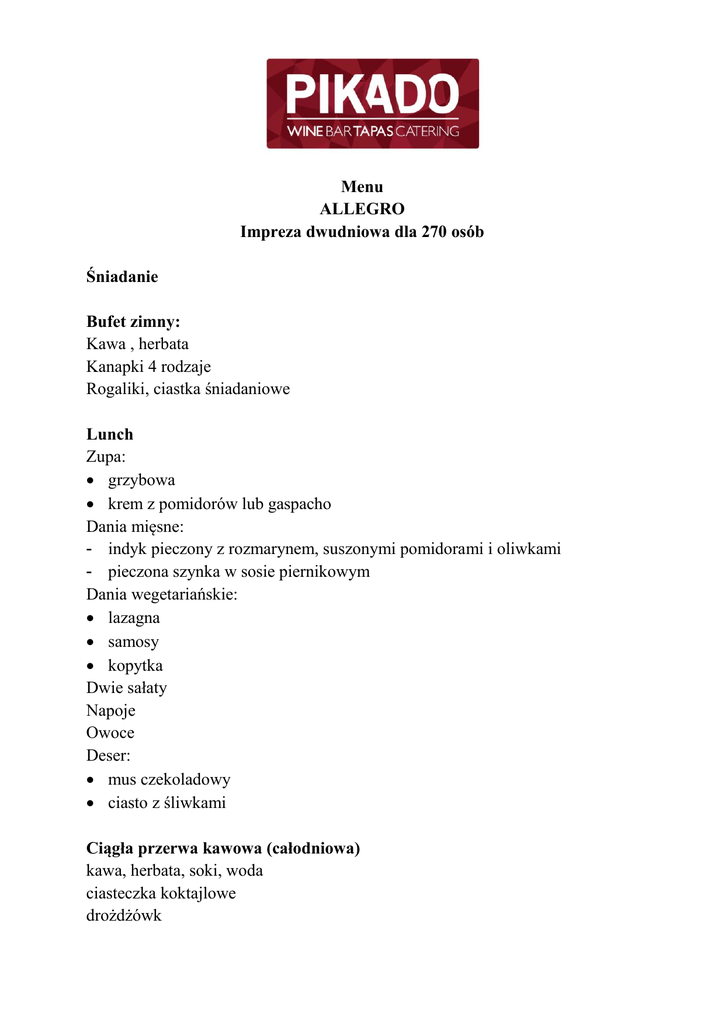 Menu ALLEGRO Impreza dwudniowa dla 270 osób Śniadanie Bufet zimny: Kawa , herbata Kanapki 4 rodzaje Rogaliki, ciastka śniadaniowe Lunch Zupa: grzybowa krem z pomidorów lub gaspacho Dania mięsne: - indyk pieczony z rozmarynem, suszonymi pomidorami i oliwkami - pieczona szynka w sosie piernikowym Dania wegetariańskie: lazagna samosy kopytka Dwie sałaty Napoje Owoce Deser: mus czekoladowy ciasto z śliwkami Ciągła przerwa kawowa (całodniowa) kawa, herbata, soki, woda ciasteczka koktajlowe drożdżówk Lunch Zupa krem z kalafiora minestrone Dania mięsne: polędwiczki wiepszowe podane na jesiennych warzywach korzeniowych w sosie pieprzowym kurczak po sycylijsku z oliwkami, kaparami i cytryną Dania wegetariańskie: tarta szpinakowa pęczotto z dynią, ziemniakami pieczonymi i rozmarynem Dwie sałaty Napoje Owoce Deser: krem pistacjowy jabłecznik Ciągła przerwa kawowa (całodniowa) kawa, herbata, soki, woda ciasteczka koktajlowe drożdżówka
