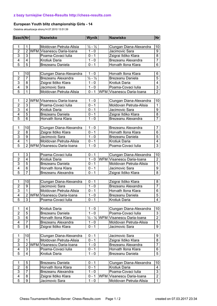 z bazy turniejów Chess-Results http://chess-results.com European Youth blitz championship Girls - 14 Ostatnia aktualizacja strony14.07.2010 13:51:39 Szach Nr Nazwisko Wynik Nazwisko Nr 1 2 3 4 5 1 Moldovan Petruta-Alisia 2 WFM Visanescu Daria-Ioana 3 Poama-Covaci Iulia 4 Krotiuk Daria 5 Brezeanu Daniela ½-½ 1-0 0-1 1-0 0-1 Ciungan Diana-Alexandra Jacimovic Sara Zsigrai Ildiko Klara Brezeanu Alexandra Horvath Ilona Klara 10 9 8 7 6 1 2 3 4 5 10 7 8 9 1 1-0 ½-½ 1-0 1-0 0 - 1 WFM Horvath Ilona Klara Brezeanu Daniela Krotiuk Daria Poama-Covaci Iulia Visanescu Daria-Ioana 6 5 4 3 2 1 2 3 4 5 2 WFM Visanescu Daria-Ioana 3 Poama-Covaci Iulia 4 Krotiuk Daria 5 Brezeanu Daniela 6 Horvath Ilona Klara 1-0 0-1 0-1 0-1 1-0 Ciungan Diana-Alexandra Moldovan Petruta-Alisia Jacimovic Sara Zsigrai Ildiko Klara Brezeanu Alexandra 10 1 9 8 7 1 2 3 4 5 10 8 9 1 2 WFM Ciungan Diana-Alexandra Zsigrai Ildiko Klara Jacimovic Sara Moldovan Petruta-Alisia Visanescu Daria-Ioana 1-0 0-1 1-0 0-1 1-0 Brezeanu Alexandra Horvath Ilona Klara Brezeanu Daniela Krotiuk Daria Poama-Covaci Iulia 7 6 5 4 3 1 2 3 4 5 3 4 5 6 7 Poama-Covaci Iulia Krotiuk Daria Brezeanu Daniela Horvath Ilona Klara Brezeanu Alexandra 0-1 Ciungan Diana-Alexandra 1 - 0 WFM Visanescu Daria-Ioana 0-1 Moldovan Petruta-Alisia 0-1 Jacimovic Sara 0-1 Zsigrai Ildiko Klara 10 2 1 9 8 1 2 3 4 5 10 Ciungan Diana-Alexandra 9 Jacimovic Sara 1 Moldovan Petruta-Alisia 2 WFM Visanescu Daria-Ioana 3 Poama-Covaci Iulia 0-1 1-0 0-1 1-0 0-1 8 7 6 5 4 1 2 3 4 5 4 5 6 7 8 1-0 Ciungan Diana-Alexandra 1-0 Poama-Covaci Iulia ½ - ½ WFM Visanescu Daria-Ioana 1-0 Moldovan Petruta-Alisia 0-1 Jacimovic Sara 10 3 2 1 9 1 2 3 4 5 10 Ciungan Diana-Alexandra 1 Moldovan Petruta-Alisia 2 WFM Visanescu Daria-Ioana 3 Poama-Covaci Iulia 4 Krotiuk Daria 0-1 0-1 1-0 0-1 1-0 9 8 7 6 5 1 2 3 4 5 5 6 7 8 9 0-1 Ciungan Diana-Alexandra 0-1 Krotiuk Daria 1-0 Poama-Covaci Iulia 0 - 1 WFM Visanescu Daria-Ioana 1-0 Moldovan Petruta-Alisia Ciungan Diana-Alexandra Brezeanu Alexandra Zsigrai Ildiko Klara Jacimovic Sara Moldovan Petruta-Alisia Krotiuk Daria Brezeanu Daniela Horvath Ilona Klara Brezeanu Alexandra Zsigrai Ildiko Klara Brezeanu Daniela Horvath Ilona Klara Brezeanu Alexandra Zsigrai Ildiko Klara Jacimovic Sara Chess-Tournament-Results-Server: Chess-Results.com Zsigrai Ildiko Klara Brezeanu Alexandra Horvath Ilona Klara Brezeanu Daniela Krotiuk Daria Jacimovic Sara Zsigrai Ildiko Klara Brezeanu Alexandra Horvath Ilona Klara Brezeanu Daniela Page 1 / 2 10 4 3 2 1 created on 07.03.2017 23:34 You find all details to this tournament under http://chess-results.com/tnr36118.aspx?lan=3 Chess-Tournament-Results-Server: Chess-Results Chess-Tournament-Results-Server: Chess-Results.com Page 2 / 2 created on 07.03.2017 23:34