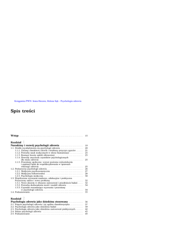 Księgarnia PWN: Irena Heszen, Helena Sęk - Psychologia zdrowia Spis treści Wste˛p. . . . . . . . . . . . . . . . . . . . . . . . . . . . . . . . . . . . . . . . . . . . . . . . . . Rozdział 1 Narodziny i rozwój psychologii zdrowia . . . . . . . . . . . . . . . . . . 1.1. Źródła wyodre˛bnienia sie˛ psychologii zdrowia. . . . . . . . . . . . . . 1.1.1. Zmiany charakteru chorób i struktury przyczyn zgonów . 1.1.2. Potrzeby nauk medycznych w sferze humanizacji . . . . . . 1.1.3. Rosna˛ce koszty opieki zdrowotnej . . . . . . . . . . . . . . . . . . 1.1.4. Dowody znaczenia czynników psychologicznych dla stanu zdrowia . . . . . . . . . . . . . . . . . . . . . . . . . . . . . . 1.1.5. Przemiany społeczne: wzrost poziomu wykształcenia i aspiracji ludzi do współdecydowania w sprawach własnego zdrowia . . . . . . . . . . . . . . . . . . . . . . . . . . . . . . 1.2. Prekursorzy psychologii zdrowia . . . . . . . . . . . . . . . . . . . . . . . . 1.2.1. Medycyna psychosomatyczna . . . . . . . . . . . . . . . . . . . . . 1.2.2. Medycyna behawioralna . . . . . . . . . . . . . . . . . . . . . . . . . 1.2.3. Psychologia medyczna. . . . . . . . . . . . . . . . . . . . . . . . . . . 1.3. Współczesne wyzwania naukowe, edukacyjne i praktyczne. Poszerzony zakres i nowe problemy . . . . . . . . . . . . . . . . . . . . . 1.3.1. Nowe akcenty w obszarze zastosowań i przedmiocie badań 1.3.2. Potrzeba doskonalenia teorii i modeli zdrowia . . . . . . . . 1.3.3. Czynniki warunkuja˛ce wyzwania i przemiany w psychologii zdrowia . . . . . . . . . . . . . . . . . . . . . . . . . . . 1.4. Podsumowanie . . . . . . . . . . . . . . . . . . . . . . . . . . . . . . . . . . . . . Rozdział 2 Psychologia zdrowia jako dziedzina stosowana 2.1. 2.2. 2.3. 2.4. 2.5. ...... Poje˛cie psychologii zdrowia i jej ogólna charakterystyka . . . . . Psychologia zdrowia jako dziedzina badań . . . . . . . . . . . . . . . Psychologia zdrowia jako dziedzina zastosowań praktycznych . Status psychologii zdrowia . . . . . . . . . . . . . . . . . . . . . . . . . . Podsumowanie . . . . . . . . . . . . . . . . . . . . . . . . . . . . . . . . . . . . . . . . . . 15 . . . . 19 20 21 23 23 .... 25 . . . . . . . . . . 25 26 27 28 30 .... .... .... 32 32 34 .... .... 34 35 . . . . . . 36 37 39 42 43 45 . . . . . . . . . . . . . . . . . . . . . . . . . . . . . . . . . . . . . . . . 6 Spis treści Rozdział 3 Koncepcje i poje˛cie zdrowia w psychologii i naukach pokrewnych . . . . . . . . . . . . . . . . . . . . . . . . . . . . . . . . . . . . . . . . . . . . 3.1. Co to jest zdrowie . . . . . . . . . . . . . . . . . . . . . . . . . . . . . . . . . 3.1.1. Zdrowie jako brak objawów choroby i cierpienia . . . . . . 3.1.2. Zdrowie jako dobrostan biopsychospołeczny . . . . . . . . . 3.1.3. Zdrowie jako potencjał i właściwości człowieka oraz jego kontekst życia . . . . . . . . . . . . . . . . . . . . . . . . . . . 3.1.4. Zdrowie jako proces . . . . . . . . . . . . . . . . . . . . . . . . . . . 3.1.5. Zdrowie jako wartość . . . . . . . . . . . . . . . . . . . . . . . . . . 3.1.6. Profesjonalne uje˛cia zdrowia a potoczne myślenie o nim 3.2. Ogólne tendencje w ujmowaniu zdrowia . . . . . . . . . . . . . . . . . 3.3. Poje˛cie zdrowia a poje˛cia bliskoznaczne . . . . . . . . . . . . . . . . . 3.3.1. Zdrowie a szcze ˛ście i dobrostan . . . . . . . . . . . . . . . . . . 3.3.2. Zdrowie a jakość życia . . . . . . . . . . . . . . . . . . . . . . . . . 3.4. Podsumowanie . . . . . . . . . . . . . . . . . . . . . . . . . . . . . . . . . . . . ..... ..... ..... 46 47 47 47 . . . . . . . . . 48 48 50 52 53 55 55 56 59 . . . . . . . . . . . . . . . . . . . . . . . . . . . . . . . . . . . . Rozdział 4 Modele i podejścia stosowane w psychologii zdrowia . . . . . . 4.1. 4.2. 4.3. 4.4. Model biomedyczny . . . . . . . . . . . . . . . . . . . . . . Model holistyczno-funkcjonalny . . . . . . . . . . . . . Model socjoekologiczny . . . . . . . . . . . . . . . . . . . Rozwój człowieka w cyklu życia a zdrowie . . . . . 4.4.1. Zdrowie biologiczne (zdrowie organizmu) . 4.4.2. Zdrowie psychiczne . . . . . . . . . . . . . . . . . 4.4.3. Zdrowie społeczne . . . . . . . . . . . . . . . . . . 4.4.4. Zdrowie duchowe . . . . . . . . . . . . . . . . . . . 4.5. Podsumowanie . . . . . . . . . . . . . . . . . . . . . . . . . . . . . . . . . . . . . . . . . . . . . . . . . . . . . . . . . . . . . . . . . . . . . . . . . . . . . . . . . . . . . . . . . . . . . . . . . . . . . . . . . . . . . . . . . . . . . . . . . . . . . . . . . . . . . . . . . . . . . . . . . . . . . . . . . . . . . . . . . Rozdział 5 Model salutogenetyczny i jego znaczenie dla psychologii zdrowia . . . . . . . . . . . . . . . . . . . . . . . . . . . . . . . . . . . . . . . . . . . . . . . . 5.1. Podstawowe założenia modelu . . . . . . . . . . . . . . . . . . . . . . . . . 5.1.1. Uogólnione zasoby odpornościowe . . . . . . . . . . . . . . . . . 5.1.2. Stresory . . . . . . . . . . . . . . . . . . . . . . . . . . . . . . . . . . . . . 5.1.3. Poczucie koherencji jako zmienna kluczowa dla zdrowia 5.1.4. Zachowania zdrowotne – styl życia . . . . . . . . . . . . . . . . . 5.2. Wybrane wyniki empirycznej weryfikacji modelu salutogenezy . 5.2.1. Weryfikacja modelu salutogenetycznego . . . . . . . . . . . . . 5.2.2. Poczucie koherencji a poziom zdrowia, przekonania zdrowotne i zachowania zdrowotne. . . . . . . . . . . . . . . . . 5.2.3. Poczucie koherencji a pomiary zdrowia negatywnego. . . . 5.2.4. Zwia˛zek poczucia koherencji z zasobami. . . . . . . . . . . . . 5.2.5. Znaczenie poczucia koherencji w procesach oceny pierwotnej i strategii radzenia sobie ze stresem . . . . . . . . 61 62 63 64 67 68 70 71 72 73 . . . . . . . 75 76 78 79 81 84 84 84 .... .... .... 85 85 86 .... 86 . . . . . . . . . . . . . . . . . . . . . Spis treści 7 5.2.6. Badania eksperymentalne, podłużne i nad uwarunkowaniami kształtowania sie˛ poczucia koherencji . . . . . . . . . . . . . . . . . . . 87 5.3. 
