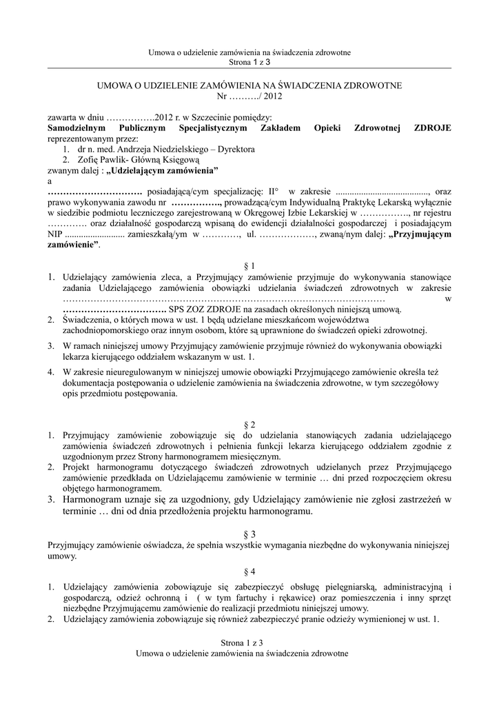 Umowa o udzielenie zamówienia na świadczenia zdrowotne Strona 1 z 3 UMOWA O UDZIELENIE ZAMÓWIENIA NA ŚWIADCZENIA ZDROWOTNE Nr ………./ 2012 zawarta w dniu …………….2012 r. w Szczecinie pomiędzy: Samodzielnym Publicznym Specjalistycznym Zakładem Opieki Zdrowotnej ZDROJE reprezentowanym przez: 1. dr n. med. Andrzeja Niedzielskiego – Dyrektora 2. Zofię Pawlik- Główną Księgową zwanym dalej : „Udzielającym zamówienia” a …………………………. posiadającą/cym specjalizację: II° w zakresie ........................................, oraz prawo wykonywania zawodu nr ……………., prowadzącą/cym Indywidualną Praktykę Lekarską wyłącznie w siedzibie podmiotu leczniczego zarejestrowaną w Okręgowej Izbie Lekarskiej w ……………., nr rejestru …………. oraz działalność gospodarczą wpisaną do ewidencji działalności gospodarczej i posiadającym NIP .......................... zamieszkałą/ym w …………, ul. ………………, zwaną/nym dalej: „Przyjmującym zamówienie”. §1 1. Udzielający zamówienia zleca, a Przyjmujący zamówienie przyjmuje do wykonywania stanowiące zadania Udzielającego zamówienia obowiązki udzielania świadczeń zdrowotnych w zakresie …………………………………………………………………………………………… w ……………………………. SPS ZOZ ZDROJE na zasadach określonych niniejszą umową. 2. Świadczenia, o których mowa w ust. 1 będą udzielane mieszkańcom województwa zachodniopomorskiego oraz innym osobom, które są uprawnione do świadczeń opieki zdrowotnej. 3. W ramach niniejszej umowy Przyjmujący zamówienie przyjmuje również do wykonywania obowiązki lekarza kierującego oddziałem wskazanym w ust. 1. 4. W zakresie nieuregulowanym w niniejszej umowie obowiązki Przyjmującego zamówienie określa też dokumentacja postępowania o udzielenie zamówienia na świadczenia zdrowotne, w tym szczegółowy opis przedmiotu postępowania. §2 1. Przyjmujący zamówienie zobowiązuje się do udzielania stanowiących zadania udzielającego zamówienia świadczeń zdrowotnych i pełnienia funkcji lekarza kierującego oddziałem zgodnie z uzgodnionym przez Strony harmonogramem miesięcznym. 2. Projekt harmonogramu dotyczącego świadczeń zdrowotnych udzielanych przez Przyjmującego zamówienie przedkłada on Udzielającemu zamówienie w terminie … dni przed rozpoczęciem okresu objętego harmonogramem. 3. Harmonogram uznaje się za uzgodniony, gdy Udzielający zamówienie nie zgłosi zastrzeżeń w terminie … dni od dnia przedłożenia projektu harmonogramu. §3 Przyjmujący zamówienie oświadcza, że spełnia wszystkie wymagania niezbędne do wykonywania niniejszej umowy. §4 1. Udzielający zamówienia zobowiązuje się zabezpieczyć obsługę pielęgniarską, administracyjną i gospodarczą, odzież ochronną i ( w tym fartuchy i rękawice) oraz pomieszczenia i inny sprzęt niezbędne Przyjmującemu zamówienie do realizacji przedmiotu niniejszej umowy. 2. Udzielający zamówienia zobowiązuje się również zabezpieczyć pranie odzieży wymienionej w ust. 1. Strona 1 z 3 Umowa o udzielenie zamówienia na świadczenia zdrowotne Umowa o udzielenie zamówienia na świadczenia zdrowotne Strona 2 z 3 §5 1. Przyjmujący zamówienie zobowiązuje się do prowadzenia wymaganej prawem w publicznych zakładach opieki zdrowotnej dokumentacji medycznej. 2. Przyjmujący zamówienie niezależnie od obowiązku określonego w ust. 1 zobowiązany jest do przedkładania Udzielającemu zamówienia sprawozdań z wykonanych w danym miesiącu świadczeń zdrowotnych, w formie i terminie uzgodnionym z Udzielającym zamówienia. 3. Dokumentacja, o której mowa w ust. 1 i 2 może być udostępniana osobom trzecim i uprawnionym organom jedynie na zasadach określonych w stosownych przepisach. §6 1. Przyjmujący zamówienie zobowiązany jest do ubezpieczenia się od odpowiedzialności cywilnej za szkody wyrządzone w związku z udzielaniem lub zaniechaniem udzielania świadczeń zdrowotnych określonych w niniejszej umowie, w tym również od ryzyka wystąpienia chorób zakaźnych, w tym wirusa HIV, na zasadach określonych we właściwych przepisach prawa. Przyjmujący zamówienie zobowiązuje się dostarczyć Udzielającemu zamówienia uwierzytelnioną kopię polisy, o której mowa w ust. 1, w terminie 30 dni od dnia podpisania niniejszej umowy, pod rygorem rozwiązania niniejszej umowy bez zachowania terminów wypowiedzenia, w przypadku, gdyby nie złożył jej przed podpisaniem umowy. 2. Przyjmujący zamówienie jest zobowiązany utrzymać ubezpieczenie przez cały okres obowiązywania umowy. Na 14 dni przed upływem dotychczasowego okresu ubezpieczenia Przyjmujący zamówienie zobowiązuje się dostarczyć Udzielającemu zamówienia uwierzytelnioną kopię polisy na kolejny okres ubezpieczenia. 3. Przyjmujący zamówienie upoważnia Udzielającego zamówienia do ujawnienia przed osobami kierującymi roszczenia odszkodowawcze danych dotyczących ubezpieczenia odpowiedzialności cywilnej Przyjmującego zamówienie. §7 1. Za wykonanie świadczeń objętych niniejszą umową Udzielający zamówienia zobowiązuje się wypłacać Przyjmującemu zamówienie wynagrodzenie wg stawki : …………….zł, za godzinę świadczonych usług. 2. W zakresie wynagrodzenia określonego w ust. 1 Strony przyjmują jednomiesięczny okres rozliczeniowy. 3. Ponadto Udzielający zamówienie w zależności od posiadanych środków finansowych przewiduje możliwość wypłacania Przyjmującemu zamówienia następujących świadczeń dodatkowych : a) premia roczna wynikająca z rozliczenia kontraktu rocznego z NFZ całego Szpitala i oddziału w wysokości do 2 % dochodu wygenerowanego przez kierowany oddział, b) premia za poprawę efektywności gospodarowania do 10 % rocznej wartości umowy. 4. Strony przyjmują, iż szacunkowe wynagrodzenie Przyjmującego zamówienie w okresie wykonywa