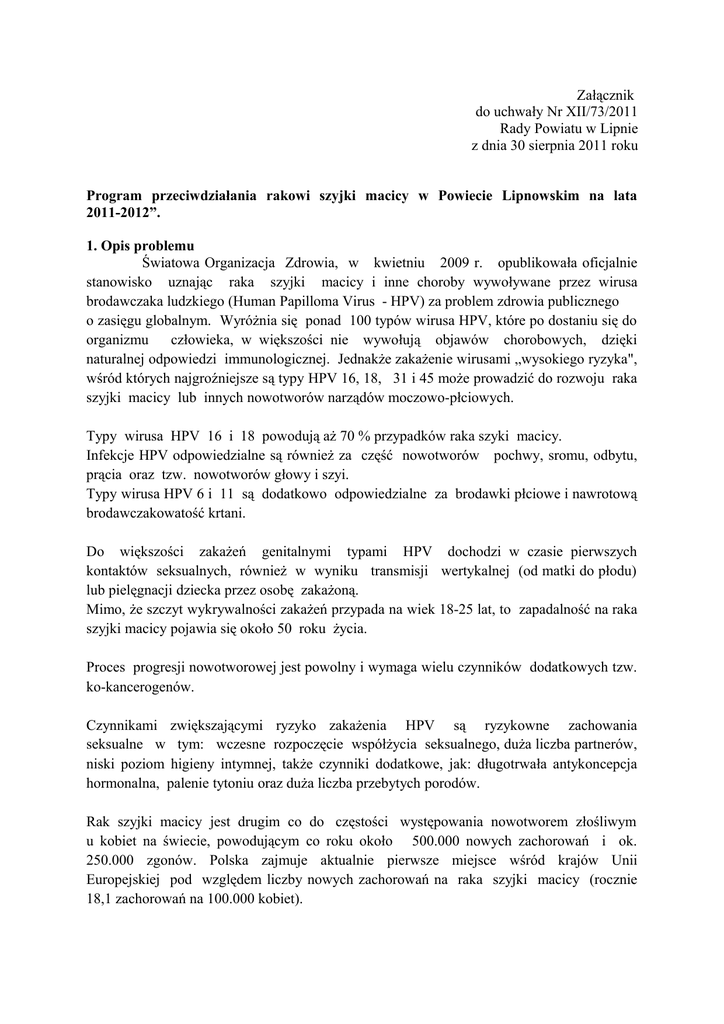 Załącznik do uchwały Nr XII/73/2011 Rady Powiatu w Lipnie z dnia 30 sierpnia 2011 roku Program przeciwdziałania rakowi szyjki macicy w Powiecie Lipnowskim na lata 2011-2012”. 1. Opis problemu Światowa Organizacja Zdrowia, w kwietniu 2009 r. opublikowała oficjalnie stanowisko uznając raka szyjki macicy i inne choroby wywoływane przez wirusa brodawczaka ludzkiego (Human Papilloma Virus - HPV) za problem zdrowia publicznego o zasięgu globalnym. Wyróżnia się ponad 100 typów wirusa HPV, które po dostaniu się do organizmu człowieka, w większości nie wywołują objawów chorobowych, dzięki naturalnej odpowiedzi immunologicznej. Jednakże zakażenie wirusami „wysokiego ryzyka", wśród których najgroźniejsze są typy HPV 16, 18, 31 i 45 może prowadzić do rozwoju raka szyjki macicy lub innych nowotworów narządów moczowo-płciowych. Typy wirusa HPV 16 i 18 powodują aż 70 % przypadków raka szyki macicy. Infekcje HPV odpowiedzialne są również za część nowotworów pochwy, sromu, odbytu, prącia oraz tzw. nowotworów głowy i szyi. Typy wirusa HPV 6 i 11 są dodatkowo odpowiedzialne za brodawki płciowe i nawrotową brodawczakowatość krtani. Do większości zakażeń genitalnymi typami HPV dochodzi w czasie pierwszych kontaktów seksualnych, również w wyniku transmisji wertykalnej (od matki do płodu) lub pielęgnacji dziecka przez osobę zakażoną. Mimo, że szczyt wykrywalności zakażeń przypada na wiek 18-25 lat, to zapadalność na raka szyjki macicy pojawia się około 50 roku życia. Proces progresji nowotworowej jest powolny i wymaga wielu czynników dodatkowych tzw. ko-kancerogenów. Czynnikami zwiększającymi ryzyko zakażenia HPV są ryzykowne zachowania seksualne w tym: wczesne rozpoczęcie współżycia seksualnego, duża liczba partnerów, niski poziom higieny intymnej, także czynniki dodatkowe, jak: długotrwała antykoncepcja hormonalna, palenie tytoniu oraz duża liczba przebytych porodów. Rak szyjki macicy jest drugim co do częstości występowania nowotworem złośliwym u kobiet na świecie, powodującym co roku około 500.000 nowych zachorowań i ok. 250.000 zgonów. Polska zajmuje aktualnie pierwsze miejsce wśród krajów Unii Europejskiej pod względem liczby nowych zachorowań na raka szyjki macicy (rocznie 18,1 zachorowań na 100.000 kobiet). Niekorzystne wskaźniki epidemiologiczne i statystyczne oraz bardzo niska zgłaszalność na badania cytologiczne, w populacyjnym programie skriningowym wymagają zintegrowania działań edukacyjnych oraz wprowadzenia profilaktyki pierwotnej, jaką są zalecane szczepienia ochronne przeciw wirusowi brodawczaka ludzkiego (HPV). Prowadzone od kilku lat badania wskazują na ograniczenie liczby zakażeń wirusem HPV, obserwowane po zastosowaniu szczepionki. Badania kliniczne dowodzą niemal 100%. skuteczności szczepionki przeciwko HPV. Najbardziej skuteczne są u osób, które nie zetknęły się jeszcze z wirusem. Szczepienie dziewcząt i kobiet w wieku 11-26 lat zalecają polskie towarzystwa medyczne (Polskie Towarzystwo Ginekologiczne oraz Polskie Towarzystwo Profilaktyki Zakażeń HPV), rekomendując je jako skuteczne działania w zakresie profilaktyki pierwotnej raka szyjki macicy. Polskie Towarzystwo Ginekologiczne szacuje, że szczepienia w Polsce nastolatek i młodych kobiet przeciwko HPV spowodują zmniejszenie ogólnej liczby zachorowań na raka szyjki macicy od 76% do 96% w ciągu 15-20 lat, od rozpoczęcia szczepień. Opracowano na podstawie: 1) "Walka z rakiem szyjki macicy w Polsce. Perspektywy, szanse i rekomendacje dla polityki państwa" pod red. Ostrowska A., Gujski M., Warszawa 2008; 2) "Wirus brodawczaka ludzkiego (HPV) i szczepionki przeciwko HPV szczegółowe informacje dla decydentów i pracowników służby zdrowia", Światowa Organizacja Zdrowia, Program Narodów Zjednoczonych ds. Rozwoju (UNDP), 2008. 2. Edukacja zdrowotna i szczepienia ochronne przeciw wirusowi HPV Światowa Organizacja Zdrowia rekomenduje wprowadzenie rutynowych szczepień przeciw HPV w poszczególnych krajach, jeżeli "Wprowadzenie szczepień jest wykonywalne w sposób programowy i można zagwarantować ich stabilne finansowanie". Podkreśla również, że szczepienia powinny być częścią programu, informację i edukację na temat profilaktyki zakażeń wirusem HPV. zawierającego Profilaktyka raka szyjki macicy powinna być zatem elementem edukacji zdrowotnej prowadzonej od wieku dojrzewania młodzieży. Dotyczy to zwłaszcza wiedzy na temat czynników ryzyka choroby, możliwości uodpornienia się na zakażenia wirusem HPV poprzez szczepienia oraz wykonywanie systematycznych badań cytologicznych. Wdrożenie wieloletniego programu edukacyjnego połączonego wykonywaniem szczepień ochronnych przeciw HPV w populacji dziewcząt przed rozpoczęciem inicjacji seksualnej obniży w przyszłości zachorowalność na raka szyjki macicy u kobiet. W Unii Europejskiej obecnie zarejestrowane i dopuszczone do obrotu są dwa rodzaje szczepionek: czterowalentna (przeciwko zakażeniom HPV typami: 6, 11, 16, 18) i dwuwalentna (przeciwko zakażeniom HPV typami 16 i 18). Wybór rodzaju szczepionki stosowanej w programie zostanie dokonany zgodnie z Ustawą z dnia 29 stycznia 2004 r. Prawo Zamówień Publicznych (Dz. U. z 2007 r. nr 223, poz. 1655 ze zmianami) oraz art. 48 ust. 4 ustawy z dnia 27 sierpnia 2004 r. o świadczeniach opieki zdrowotnej finansowanych ze środków publicznych (Dz. U. Nr 210 poz. 2135 ze zm.). 3. Cel ogólny programu: Zmniejszenie liczby zachorowań na raka szyjki macicy u kobiet poprzez przeprowadzenie edukacji zdrowotnej oraz wykonanie szczepień ochronnych szczepionką przeciwko wirusowi HPV w populacji 12 - 18 letnich dziewcząt, mieszkanek Powiatu Lipnowskiego. 4. Cele szczegółowe programu: 1) Zwiększenie poziomu wiedzy i świadomości rodziców oraz młodzieży szkolnej w wieku 12- 18 lat w zakresie ryzykownych zachowań oraz chorób przenoszonych drogą płciową, w tym zakażeń