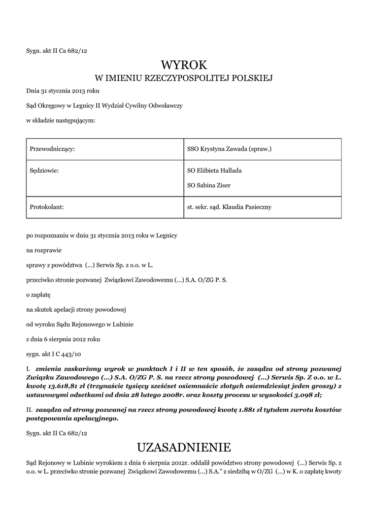 Sygn. akt II Ca 682/12 WYROK W IMIENIU RZECZYPOSPOLITEJ POLSKIEJ Dnia 31 stycznia 2013 roku Sąd Okręgowy w Legnicy II Wydział Cywilny Odwoławczy w składzie następującym: Przewodniczący: SSO Krystyna Zawada (spraw.) Sędziowie: SO Elżbieta Hallada SO Sabina Ziser Protokolant: st. sekr. sąd. Klaudia Pasieczny po rozpoznaniu w dniu 31 stycznia 2013 roku w Legnicy na rozprawie sprawy z powództwa (...) Serwis Sp. z o.o. w L. przeciwko stronie pozwanej Związkowi Zawodowemu (...) S.A. O/ZG P. S. o zapłatę na skutek apelacji strony powodowej od wyroku Sądu Rejonowego w Lubinie z dnia 6 sierpnia 2012 roku sygn. akt I C 443/10 I. zmienia zaskarżony wyrok w punktach I i II w ten sposób, że zasądza od strony pozwanej Związku Zawodowego (...) S.A. O/ZG P. S. na rzecz strony powodowej (...) Serwis Sp. Z o.o. w L. kwotę 13.618,81 zł (trzynaście tysięcy sześćset osiemnaście złotych osiemdziesiąt jeden groszy) z ustawowymi odsetkami od dnia 28 lutego 2008r. oraz koszty procesu w wysokości 3.098 zł; II. zasądza od strony pozwanej na rzecz strony powodowej kwotę 1.881 zł tytułem zwrotu kosztów postępowania apelacyjnego. Sygn. akt II Ca 682/12 UZASADNIENIE Sąd Rejonowy w Lubinie wyrokiem z dnia 6 sierpnia 2012r. oddalił powództwo strony powodowej (...) Serwis Sp. z o.o. w L. przeciwko stronie pozwanej Związkowi Zawodowemu (...) S.A.” z siedzibą w O/ZG (...) w K. o zapłatę kwoty 13.618,81 zł z ustawowymi odsetkami od dnia 28 lutego 2008r. (punkt I wyroku) i zasądził od powodowej Spółki na rzecz pozwanego Związku Zawodowego kwotę 2.417 zł kosztów zastępstwa procesowego (punkt II wyroku). Bezsporne między stronami były: rodzaj uszkodzeń pojazdu, zakres napraw dokonanych w serwisie powodowej Spółki oraz wysokość należnego wykonawcy wynagrodzenia wyliczonego w fakturze VAT nr (...) z dnia 20 lutego 2008r. Istota sporu sprowadzała się do kwestii czy wykonana w dniu 20 lutego 2008r. przez stronę powodową w jej stacji serwisowej usługa – naprawa usterki silnika w posiadanym przez pozwany Związek Zawodowy samochodzie marki F. (...) o nr rej. (...), wyceniona na 13.618,81 zł, miała charakter naprawy gwarancyjnej czy też jej podstawę stanowiła odrębna umowa o dzieło, zawarta przez strony w dniu 20 lutego 2008r. Zdaniem Sądu pierwszej instancji ustalenie przyczyny powstania uszkodzenia w pojeździe miało decydujące znaczenie dla przyjęcia jaki stosunek prawny łączył strony w dacie zlecenia stronie powodowej przez pozwany Związek Zawodowy naprawy samochodu. Na podstawie zebranych w sprawie dowodów oraz dowodów znajdujących się w aktach sprawy z powództwa Związku Zawodowego (...) S.A.” z siedzibą w O/ZG (...) w K. przeciwko pozwanym S. G. i R. L. s.j. w P. o zapłatę kwoty 13.618,81 zł (sygn. akt I C 246/08 Sądu Rejonowego w Lubinie), a w szczególności opinii biegłego sądowego M. P. Sąd Rejonowy przyjął, że nie jest obecnie możliwe określenie w sposób jednoznaczny bezpośredniej przyczyny uszkodzenia silnika samochodu marki F. (...), bowiem w toku procesu nie zostały zbadane przez biegłego sądowego uszkodzone części pojazdu, tj. pompa paliwowa i wtryskiwacze - uszkodzone części zostały przesłane po naprawie gwarantowi (...) Sp. z o.o. w W., a stacja serwisowa powodowej spółki nie posiadała już wydruku komputerowego z diagnostyki silnika ani wyników przeprowadzonych testów przelewowych wtryskiwaczy. Sąd wskazał, że to właśnie na stronie powodowej spoczywał ciężar wykazania, że do uszkodzenia samochodu objętego gwarancją doszło z przyczyn nie tkwiących uprzednio w oddanej w leasing rzeczy, tj. nieobjętych gwarancją, takich chociażby jak np. nieumiejętna eksploatacja, zdarzenie losowe, uszkodzenie przez osoby trzecie. Skoro powodowa Spółka nie wykazała takich okoliczności to z racji prowadzonej działalności gospodarczej przyjęła na siebie ryzyko, że wykonane prace mogą być objęte gwarancją. Za bezzasadny uznał Sąd Rejonowy zarzut strony powodowej, iż przyczyną uszkodzeń silnika było zatankowanie przez użytkownika pojazdu paliwem niespełniającym norm. Kwestia ta została bowiem przesądzona prawomocnym wyrokiem Sądu Rejonowego w Lubinie z dnia 25 października 2010r. w sprawie z powództwa Związku Zawodowego (...) S.A.” z siedzibą w O/ZG (...) w K. przeciwko pozwanym S. G. i R. L. s.j. w P. o zapłatę kwoty 13.618,81 zł sygn. akt I C 246/08 Sądu Rejonowego w Lubinie. W całości wyrok Sądu pierwszej instancji zaskarżyła strona powodowa (...) Serwis Sp. z o.o. z siedzibą w L. zarzucając: naruszenie prawa procesowego, a to art. 233§1 kpc poprzez sprzeczność istotnych ustaleń Sądu z treścią zebranego w sprawie materiału przez przyjęcie, że usługi wykonane przez powoda, a objęte fakturą VAT nr (...), która do dnia dzisiejszego nie została uregulowana i której zapłaty dotyczy postępowanie, wykonane zostały w ramach naprawy gwarancyjnej, gdy tymczasem powód dokonał naprawy na podstawie odrębnego zlecenia, nadto niedokonanie wszechstronnego rozważenia materiału zebranego w sprawie, w szczególności poprzez nieuwzględnienie, iż pozwany nie kwestionował konieczności zapłaty za zleconą usługę, a jedynie zwracał się o przedłużenie terminu zapłaty, nie poinformował powoda o wynikach analizy próbki paliwa przesłanej przez stację paliw, nadto przez pominięcie okoliczności wysłania do analizy drugiej próbki paliwa po długim okresie czasu. Skarżąca spółka wniosła o zmianę zaskarżonego wyroku przez uwzględnienie w całości powództwa wraz z kosztami procesu za obie instancje. Złożyła ewentualny wniosek o uchylenie wyroku i przekazanie sprawy Sądowi I instancji do ponownego rozpoznania i rozstrzygnięcia o kosztach procesu. Sąd Okręgowy zważył: Apelacja strony powodowej (...) Serwis Sp. z o.o. z siedzibą w L. jest zasadna. Ze względu na bezsporność między stronami takich okoliczności jak: rodzaj uszk