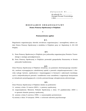 Załącznik Nr..... do uchwały Nr ....................... Zarządu Powiatu Tczewskiego z dnia ....................................... REGULAMIN ORGANIZACYJNY Domu Pomocy Społecznej w Pelplinie I Postanowienia ogólne § 1. Regulamin organizacyjny określa strukturę organizacyjną i szczegółowy zakres zadań Domu Pomocy Społecznej z siedzibą w Pelplinie przy ul. Szpitalnej 2, 83-130 Pelplin. § 2. 1. Dom Pomocy Społecznej w Pelplinie jest jednostką organizacyjną Powiatu Tczewskiego o zasięgu ponadgminnym. 2. Dom Pomocy Społecznej w Pelplinie prowadzi gospodarkę finansową w formie jednostki budżetowej. § 3. Dom Pomocy Społecznej w Pelplinie świadczy, na poziomie obowiązującego standardu, osobom wymagającym całodobowej opieki z powodu niepełnosprawności i choroby usługi: bytowe, opiekuńcze i wspomagające w formach i zakresach wynikających z indywidualnych potrzeb i możliwości oraz umożliwia i organizuje korzystanie ze świadczeń przysługujących z tytułu powszechnego ubezpieczenia zdrowotnego. . § 4. Dom Pomocy Społecznej w Pelplinie działa na podstawie: 1) ustawy z dnia 12 marca 2004 r. o pomocy społecznej, 2) rozporządzenia Ministra Polityki Społecznej z dnia 19 października 2005 r. w sprawie domów pomocy społecznej, 3) ustawy z dnia 5 czerwca 1998 r. o samorządzie powiatowym 4] ustawy z dnia 19 sierpnia 1994r. o ochronie zdrowia psychicznego 5] ustawy z dnia 21 listopada 2008r. o pracownikach samorządowych 6) regulaminu wynagradzania pracowników Domu Pomocy Społecznej w Pelplinie (zarządzenie Nr 13/09 dyrektora DPS w Pelplinie z dnia 09 czerwca 2009r.) 7) statutu Domu Pomocy Społecznej w Pelplinie, przyjętego uchwałą Nr XLVII/344/06 Rady Powiatu Tczewskiego z dnia 22 sierpnia 2006r. w sprawie nadania statutów domom pomocy społecznej prowadzonym przez Powiat Tczewski, 8) niniejszego Regulaminu. § 5. Ilekroć w dalszej części Regulaminu Organizacyjnego jest mowa o: 1) regulaminie – rozumie się przez to regulamin organizacyjny Domu Pomocy Społecznej w Pelplinie, 2) Domu – rozumie się przez to Dom Pomocy Społecznej w Pelplinie, 3) dyrektorze – rozumie się przez to dyrektora Domu Pomocy Społecznej w Pelplinie, 4) Zarządzie Powiatu – rozumie się przez to Zarząd Powiatu Tczewskiego, 5) mieszkańcu – rozumie się przez to mieszkańca Domu Pomocy Społecznej w Pelplinie, 6) dziale – rozumie się przez to Dział w Domu Pomocy Społecznej w Pelplinie lub równorzędną komórkę organizacyjną o innej nazwie, 7) kierowniku działu – rozumie się przez to: Głównego Księgowego, Głównego Administratora, Starszego Administratora w Domu Pomocy Społecznej w Pelplinie, 8) standardzie usług – rozumie się przez to standard obowiązujących podstawowych usług świadczonych przez domy pomocy społecznej określony w rozporządzeniu Ministra Polityki Społecznej z dnia 19 października 2005 r. w sprawie domów pomocy społecznej. II Ogólne cele i zadania Domu § 6. Dom zapewnia mieszkańcom całodobową opiekę oraz zaspokaja ich niezbędne potrzeby bytowe, opiekuńcze i wspomagające na poziomie obowiązującego standardu. § 7. 1. Dom przeznaczony jest dla: 1) osób niepełnosprawnych fizycznie, 2) osób przewlekle somatycznie chorych. 2. Dom posiada 150 miejsc dla mieszkańców, w tym: 95 miejsc dla niepełnosprawnych fizycznie i 55 miejsc dla przewlekle somatycznie chorych. § 8. Organizacja Domu, zakres i poziom świadczonych usług uwzględniają w szczególności wolność, intymność, godność i poczucie bezpieczeństwa mieszkańców domu oraz stopień ich fizycznej i psychicznej sprawności. § 9. Dom pokrywa w całości wydatki związane z zapewnieniem całodobowej opieki mieszkańcom oraz zaspokajaniem ich niezbędnych potrzeb bytowych i społecznych. § 10. 1. Dom umożliwia i organizuje mieszkańcom korzystanie z przysługujących na podstawie odrębnych przepisów świadczeń zdrowotnych oraz pokrywa opłaty ryczałtowe i częściową odpłatność do wysokości limitu ceny – przewidziane w przepisach o powszechnym ubezpieczeniu zdrowotnym. 2. Dom może również pokryć wydatki ponoszone na niezbędne usługi pielęgnacyjne w zakresie wykraczającym poza uprawnienia wynikające z przepisów o powszechnym ubezpieczeniu zdrowotnym. § 11. 1.Dom świadczy mieszkańcom usługi bytowe, zapewniając miejsce zamieszkania w otoczeniu i budynku bez barier architektonicznych. 2.Budynek Domu posiada: 1) pokoje mieszkalne jednoosobowe, dwuosobowe, trzyosobowe oraz czteroosobowe dla osób leżących; wyposażone odpowiednio do liczby mieszkańców i zgodnie z ich potrzebami w łóżko lub tapczan, szafę, szafkę nocną, stół, krzesła i inne meble oraz wyprowadzenia elektryczne; 2) pokoje dziennego pobytu, 3) jadalnię, 4) gabinet medycznej pomocy doraźnej, 5) kuchenkę pomocniczą, 6) pomieszczenia pomocnicze do prania i suszenia, 7) pokój gościnny, 8) pomieszczenia sanitarne przystosowane do potrzeb osób niepełnosprawnych, 9) pomieszczenie do terapii zajęciowej, 10) pomieszczenia do rehabilitacji. 3. W sprawie wyżywienia Dom zapewnia: 1) 3 posiłki dziennie, 2) możliwość wyboru zestawu posiłków lub otrzymania posiłku dodatkowego oraz dietetycznego, zgodnie ze wskazaniem lekarza, 3) podstawowe produkty żywnościowe oraz napoje dostępne przez całą dobę. 4.Mieszkańcom nieposiadającym własnej odzieży i obuwia oraz możliwości ich zakupienia z własnych środków, Dom zapewnia: odzież codzienną i zewnętrzną, bieliznę dzienną i nocną, obuwie i pantofle domowe – odpowiedniego rozmiaru, dostosowane do pory roku, utrzymane w czystości i wymieniane w razie potrzeby. 5.Mieszkańcy Domu otrzymują pomoc w utrzymaniu higieny osobistej, a w przypadku gdy sami nie są w stanie zapewnić sobie środków czystości i higienicznych, zapewnia się im, w miarę potrzeb: osobiste środki czystości, przybory toaletowe, ręczniki, pościel i inne niezbędne przedmioty. § 12. Dom świadczy mieszka