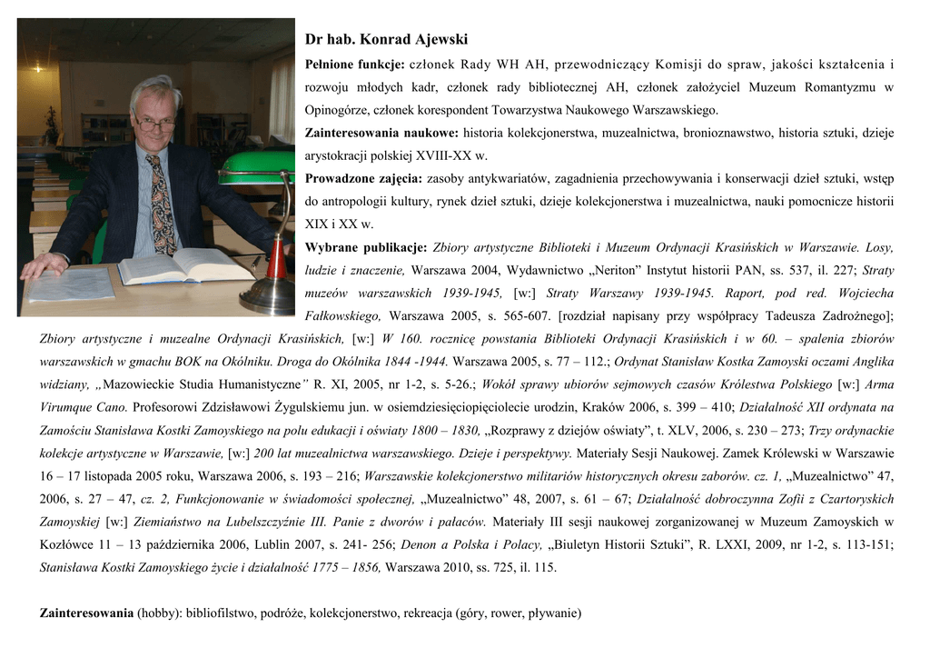 Dr hab. Konrad Ajewski Pełnione funkcje: członek Rady WH AH, przewodniczący Komisji do spraw, jakości kształcenia i rozwoju młodych kadr, członek rady bibliotecznej AH, członek załoŜyciel Muzeum Romantyzmu w Opinogórze, członek korespondent Towarzystwa Naukowego Warszawskiego. Zainteresowania naukowe: historia kolekcjonerstwa, muzealnictwa, bronioznawstwo, historia sztuki, dzieje arystokracji polskiej XVIII-XX w. Prowadzone zajęcia: zasoby antykwariatów, zagadnienia przechowywania i konserwacji dzieł sztuki, wstęp do antropologii kultury, rynek dzieł sztuki, dzieje kolekcjonerstwa i muzealnictwa, nauki pomocnicze historii XIX i XX w. Wybrane publikacje: Zbiory artystyczne Biblioteki i Muzeum Ordynacji Krasińskich w Warszawie. Losy, ludzie i znaczenie, Warszawa 2004, Wydawnictwo „Neriton” Instytut historii PAN, ss. 537, il. 227; Straty muzeów warszawskich 1939-1945, [w:] Straty Warszawy 1939-1945. Raport, pod red. Wojciecha Fałkowskiego, Warszawa 2005, s. 565-607. [rozdział napisany przy współpracy Tadeusza ZadroŜnego]; Zbiory artystyczne i muzealne Ordynacji Krasińskich, [w:] W 160. rocznicę powstania Biblioteki Ordynacji Krasińskich i w 60. – spalenia zbiorów warszawskich w gmachu BOK na Okólniku. Droga do Okólnika 1844 -1944. Warszawa 2005, s. 77 – 112.; Ordynat Stanisław Kostka Zamoyski oczami Anglika widziany, „Mazowieckie Studia Humanistyczne” R. XI, 2005, nr 1-2, s. 5-26.; Wokół sprawy ubiorów sejmowych czasów Królestwa Polskiego [w:] Arma Virumque Cano. Profesorowi Zdzisławowi śygulskiemu jun. w osiemdziesięciopięciolecie urodzin, Kraków 2006, s. 399 – 410; Działalność XII ordynata na Zamościu Stanisława Kostki Zamoyskiego na polu edukacji i oświaty 1800 – 1830, „Rozprawy z dziejów oświaty”, t. XLV, 2006, s. 230 – 273; Trzy ordynackie kolekcje artystyczne w Warszawie, [w:] 200 lat muzealnictwa warszawskiego. Dzieje i perspektywy. Materiały Sesji Naukowej. Zamek Królewski w Warszawie 16 – 17 listopada 2005 roku, Warszawa 2006, s. 193 – 216; Warszawskie kolekcjonerstwo militariów historycznych okresu zaborów. cz. 1, „Muzealnictwo” 47, 2006, s. 27 – 47, cz. 2, Funkcjonowanie w świadomości społecznej, „Muzealnictwo” 48, 2007, s. 61 – 67; Działalność dobroczynna Zofii z Czartoryskich Zamoyskiej [w:] Ziemiaństwo na Lubelszczyźnie III. Panie z dworów i pałaców. Materiały III sesji naukowej zorganizowanej w Muzeum Zamoyskich w Kozłówce 11 – 13 października 2006, Lublin 2007, s. 241- 256; Denon a Polska i Polacy, „Biuletyn Historii Sztuki”, R. LXXI, 2009, nr 1-2, s. 113-151; Stanisława Kostki Zamoyskiego Ŝycie i działalność 1775 – 1856, Warszawa 2010, ss. 725, il. 115. Zainteresowania (hobby): bibliofilstwo, podróŜe, kolekcjonerstwo, rekreacja (góry, rower, pływanie)