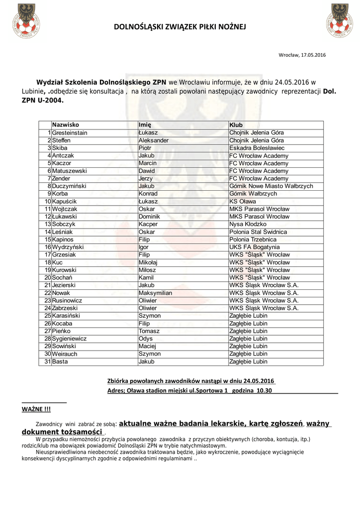 DOLNOŚLĄSKI ZWIĄZEK PIŁKI NOŻNEJ Wrocław, 17.05.2016 Wydział Szkolenia Dolnośląskiego ZPN we Wrocławiu informuje, że w dniu 24.05.2016 w Lubinie, .odbędzie się konsultacja , na którą zostali powołani następujący zawodnicy reprezentacji Dol. ZPN U-2004. Nazwisko Imię 1 Gresteinstain 2 Steffen 3 Skiba 4 Antczak 5 Kaczor 6 Matuszewski 7 Zender 8 Duczymiński 9 Korba 10 Kapuścik 11 Wojtczak 12 Łukawski 13 Sobczyk 14 Leśniak 15 Kapinos 16 Wydrzyński 17 Grzesiak 18 Kuc 19 Kurowski 20 Sochań 21 Jezierski 22 Nowak 23 Rusinowicz 24 Zabrzeski 25 Karasiński 26 Kocaba 27 Pieńko 28 Sygieniewicz 29 Sowiński 30 Weirauch 31 Basta Łukasz Aleksander Piotr Jakub Marcin Dawid Jerzy Jakub Konrad Łukasz Oskar Dominik Kacper Oskar Filip Igor Filip Mikołaj Miłosz Kamil Jakub Maksymilian Oliwier Oliwier Szymon Filip Tomasz Odys Maciej Szymon Jakub Klub Chojnik Jelenia Góra Chojnik Jelenia Góra Eskadra Bolesławiec FC Wrocław Academy FC Wrocław Academy FC Wrocław Academy FC Wrocław Academy Górnik Nowe Miasto Wałbrzych Górnik Wałbrzych KS Oława MKS Parasol Wrocław MKS Parasol Wrocław Nysa Kłodzko Polonia Stal Świdnica Polonia Trzebnica UKS FA Bogatynia WKS "Śląsk" Wrocław WKS "Śląsk" Wrocław WKS "Śląsk" Wrocław WKS "Śląsk" Wrocław WKS Śląsk Wrocław S.A. WKS Śląsk Wrocław S.A. WKS Śląsk Wrocław S.A. WKS Śląsk Wrocław S.A. Zagłębie Lubin Zagłębie Lubin Zagłębie Lubin Zagłębie Lubin Zagłębie Lubin Zagłębie Lubin Zagłębie Lubin Zbiórka powołanych zawodników nastąpi w dniu 24.05.2016 Adres; Oława stadion miejski ul.Sportowa 1 godzina 10.30 WAŻNE !!! Zawodnicy wini zabrać ze sobą: dokument tożsamości aktualne ważne badania lekarskie, kartę zgłoszeń, ważny . W przypadku niemożności przybycia powołanego zawodnika z przyczyn obiektywnych (choroba, kontuzja, itp.) rodzic/klub ma obowiązek powiadomić Dolnośląski ZPN w trybie natychmiastowym. Nieusprawiedliwiona nieobecność zawodnika traktowana będzie, jako wykroczenie, powodujące wyciągnięcie konsekwencji dyscyplinarnych zgodnie z odpowiednimi regulaminami .. DOLNOŚLĄSKI ZWIĄZEK PIŁKI NOŻNEJ Trenerzy prowadzący . na 3 dni przed podanym terminem prosi o potwierdzenie przybycia zawodnika : Łukasz Czajka tel – 602-644-878 Jacek Imianowski – 533-254-651 Maciej Kuziomko – 791-905-004 Paweł Sochacki - 669-398-468 TRENER KOORDYNATOR Klaus Masseli