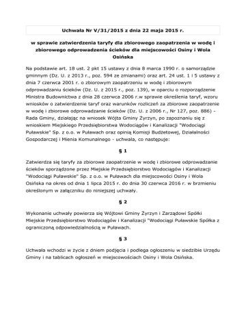 Uchwała Nr V/31/2015 z dnia 22 maja 2015 r. w sprawie zatwierdzenia taryfy dla zbiorowego zaopatrzenia w wodę i zbiorowego odprowadzenia ścieków dla miejscowości Osiny i Wola Osińska Na podstawie art. 18 ust. 2 pkt 15 ustawy z dnia 8 marca 1990 r. o samorządzie gminnym (Dz. U. z 2013 r., poz. 594 ze zmianami) oraz art. 24 ust. 1 i 5 ustawy z dnia 7 czerwca 2001 r. o zbiorowym zaopatrzeniu w wodę i zbiorowym odprowadzaniu ścieków (Dz. U. z 2015 r., poz. 139), w oparciu o rozporządzenie Ministra Budownictwa z dnia 28 czerwca 2006 r.w sprawie określenia taryf, wzoru wniosków o zatwierdzenie taryf oraz warunków rozliczeń za zbiorowe zaopatrzenie w wodę i zbiorowe odprowadzanie ścieków (Dz. U. z 2006 r., Nr 127, poz. 886) Rada Gminy, działając na wniosek Wójta Gminy Żyrzyn, po zapoznaniu się z wnioskiem Miejskiego Przedsiębiorstwa Wodociągów i Kanalizacji "Wodociągi Puławskie" Sp. z o.o. w Puławach oraz opinią Komisji Budżetowej, Działalności Gospodarczej i Mienia Komunalnego - uchwala, co następuje: §1 Zatwierdza się taryfy za zbiorowe zaopatrzenie w wodę i zbiorowe odprowadzanie ścieków sporządzone przez Miejskie Przedsiębiorstwo Wodociągów i Kanalizacji "Wodociągi Puławskie" Sp. z o.o. w Puławach dla miejscowości Osiny i Wola Osińska na okres od dnia 1 lipca 2015 r. do dnia 30 czerwca 2016 r. w brzmieniu określonym w załączniku do niniejszej uchwały. §2 Wykonanie uchwały powierza się Wójtowi Gminy Żyrzyn i Zarządowi Spółki Miejskie Przedsiębiorstwo Wodociągów i Kanalizacji "Wodociągi Puławskie Spółka z ograniczoną odpowiedzialnością w Puławach. §3 Uchwała wchodzi w życie z dniem podjęcia i podlega ogłoszeniu w siedzibie Urzędu Gminy i na tablicach ogłoszeń w miejscowościach Osiny i Wola Osińska. Załącznik do Uchwały Nr V/31/2015 z 22 maja 2015 r. Taryfa za zbiorowe zaopatrzenie w wodę i zbiorowe odprowadzanie ścieków obowiązująca na terenie Gminy Żyrzyn dla miejscowości Osiny i Wola Osińska od dnia 1 lipca 2015 r. do dnia 30 czerwca 2016 r. 1. Zaopatrzenie w wodę 1.1. Cena netto za wodę dla gospodarstw 3,59 zł/m3 + VAT* domowych na cele: socjalne, komunalne i przeciwpożarowe z terenu Gminy Żyrzyn 2. Odprowadzanie i oczyszczanie ścieków 2.1. Cena netto za odprowadzanie i oczyszczanie 6,37 zł/m3 + VAT* ścieków z gospodarstw domowych i pozostałych odbiorców z terenu Gminy Żyrzyn 3. Stawki opłat abonamentowych 3.1. Grupa Ż_IA - woda (wodomierz główny) 3.2. Grupa Ż_IB - woda + ścieki (wodomierz główny) 3.3. Grupa Ż_IC - ścieki (wodomierz główny) 3.4. Grupa Ż_II - woda + ścieki (wodomierz przy punkcie czerpalnym - wodomierz "lokalowy") 3.5. Grupa Ż_ IIIA - woda (przeciętne normy zużycia) 3.6. Grupa Ż_ IIIB - woda + ścieki (przeciętne normy zużycia) 3.7. Grupa Ż_ IIIC - ścieki (przeciętne normy zużycia) 1,56 zł/odbiorcę/m-c + VAT* 4,49 zł/odbiorcę/m-c + VAT* 2,93 zł/odbiorcę/m-c + VAT* 3,70 zł/odbiorcę/m-c + VAT* 0,78 zł/odbiorcę/m-c + VAT* 2,63 zł/odbiorcę/m-c + VAT* 1,85 zł/odbiorcę/m-c + VAT* * Stawka podatku VAT zgodna z obowiązującymi przepisami. Aktualna stawka podatku VAT na dostawę wody i odprowadzenie ścieków wynosi 8%.