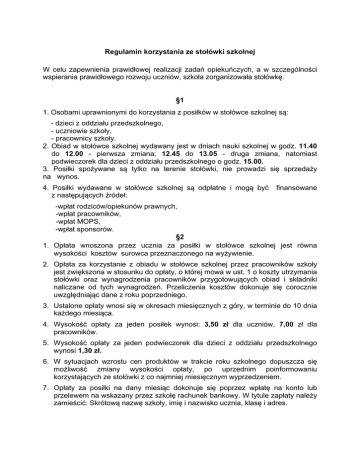 Regulamin korzystania ze stołówki szkolnej W celu zapewnienia prawidłowej realizacji zadań opiekuńczych, a w szczególności wspierania prawidłowego rozwoju uczniów, szkoła zorganizowała stołówkę. §1 1. Osobami uprawnionymi do korzystania z posiłków w stołówce szkolnej są: - dzieci z oddziału przedszkolnego, - uczniowie szkoły, - pracownicy szkoły. 2. Obiad w stołówce szkolnej wydawany jest w dniach nauki szkolnej w godz. 11.40 do 12.00 - pierwsza zmiana; 12.45 do 13.05 - druga zmiana, natomiast podwieczorek dla dzieci z oddziału przedszkolnego o godz. 15.00. 3. Posiłki spożywane są tylko na terenie stołówki, nie prowadzi się sprzedaży na wynos. 4. Posiłki wydawane w stołówce szkolnej są odpłatne i mogą być z następujących źródeł: finansowane -wpłat rodziców/opiekunów prawnych, -wpłat pracowników, -wpłat MOPS, -wpłat sponsorów. §2 1. Opłata wnoszona przez ucznia za posiłki w stołówce szkolnej jest równa wysokości kosztów surowca przeznaczonego na wyżywienie. 2. Opłata za korzystanie z obiadu w stołówce szkolnej przez pracowników szkoły jest zwiększona w stosunku do opłaty, o której mowa w ust. 1 o koszty utrzymania stołówki oraz wynagrodzenia pracowników przygotowujących obiad i składniki naliczane od tych wynagrodzeń. Przeliczenia kosztów dokonuje się corocznie uwzględniając dane z roku poprzedniego. 3. Ustalone opłaty wnosi się w okresach miesięcznych z góry, w terminie do 10 dnia każdego miesiąca. 4. Wysokość opłaty za jeden posiłek wynosi: 3,50 zł dla uczniów, 7,00 zł dla pracowników. 5. Wysokość opłaty za jeden podwieczorek dla dzieci z oddziału przedszkolnego wynosi 1,30 zł. 6. W sytuacjach wzrostu cen produktów w trakcie roku szkolnego dopuszcza się możliwość zmiany wysokości opłaty, po uprzednim poinformowaniu korzystających ze stołówki z co najmniej miesięcznym wyprzedzeniem. 7. Opłaty za posiłki na dany miesiąc dokonuje się poprzez wpłatę na konto lub przelewem na wskazany przez szkołę rachunek bankowy. W tytule zapłaty należy zamieścić: Skrótową nazwę szkoły, imię i nazwisko ucznia, klasę i adres. 8. W przypadku dokonywania opłaty poprzez wpłatę na konto lub przelewem za dzień zapłaty uznaje się dzień wpływu środków na wyznaczony rachunek bankowy szkoły. §3 1. Opłatę wniesioną przez Rodzica za posiłki, z których uczeń nie skorzystał w razie usprawiedliwionej nieobecności na zajęciach powyżej kolejnych 3 dni, zwraca się Rodzicowi na jego wniosek. Termin zgłoszenia wniosku upływa w trzecim dniu roboczym po powrocie ucznia do szkoły, nie później jednak niż w ostatnim dniu zajęć w danym roku szkolnym, z zastrzeżeniem ust. 3. 2. Jeżeli rodzic nie skorzysta z możliwości zwrotu opłaty, o której mowa w ust. 1 nadpłata z tytułu niewykorzystania posiłków ma być w pierwszej kolejności zaliczona na poczet należności następnego miesiąca. 3. Za miesiąc grudzień oraz za miesiąc czerwiec odliczeń nie dokonuje się. 4. W przypadku planowanej nieobecności w szkole, należy zgłosić ten fakt przynajmniej jeden dzień wcześniej. 5. Zasady określone w niniejszym paragrafie dotyczą także pracowników szkoły. §4 1. Podczas wydawania posiłków zabrania się pobytu w pomieszczeniach stołówki osobom niespożywającym posiłku. 2. W stołówce oraz na tablicy ogłoszeń wywieszany jest aktualny jadłospis na dany tydzień.