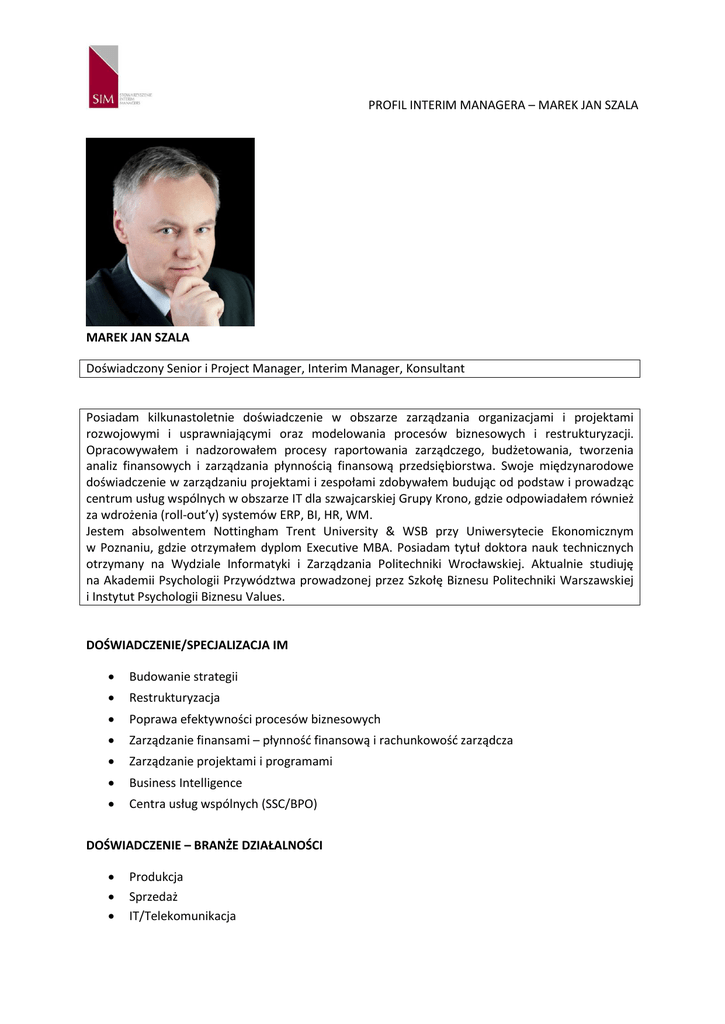 PROFIL INTERIM MANAGERA – MAREK JAN SZALA MAREK JAN SZALA Doświadczony Senior i Project Manager, Interim Manager, Konsultant Posiadam kilkunastoletnie doświadczenie w obszarze zarządzania organizacjami i projektami rozwojowymi i usprawniającymi oraz modelowania procesów biznesowych i restrukturyzacji. Opracowywałem i nadzorowałem procesy raportowania zarządczego, budżetowania, tworzenia analiz finansowych i zarządzania płynnością finansową przedsiębiorstwa. Swoje międzynarodowe doświadczenie w zarządzaniu projektami i zespołami zdobywałem budując od podstaw i prowadząc centrum usług wspólnych w obszarze IT dla szwajcarskiej Grupy Krono, gdzie odpowiadałem również za wdrożenia (roll-out’y) systemów ERP, BI, HR, WM. Jestem absolwentem Nottingham Trent University & WSB przy Uniwersytecie Ekonomicznym w Poznaniu, gdzie otrzymałem dyplom Executive MBA. Posiadam tytuł doktora nauk technicznych otrzymany na Wydziale Informatyki i Zarządzania Politechniki Wrocławskiej. Aktualnie studiuję na Akademii Psychologii Przywództwa prowadzonej przez Szkołę Biznesu Politechniki Warszawskiej i Instytut Psychologii Biznesu Values. DOŚWIADCZENIE/SPECJALIZACJA IM Budowanie strategii Restrukturyzacja Poprawa efektywności procesów biznesowych Zarządzanie finansami – płynność finansową i rachunkowość zarządcza Zarządzanie projektami i programami Business Intelligence Centra usług wspólnych (SSC/BPO) DOŚWIADCZENIE – BRANŻE DZIAŁALNOŚCI Produkcja Sprzedaż IT/Telekomunikacja PROFIL INTERIM MANAGERA – MAREK JAN SZALA Usługi B2B Służba zdrowia Szkolenia/edukacja DOŚWIADCZENIE - PEŁNIONE FUNKCJE W ORGANIACJI Dyrektor ds. rozwoju systemów informatycznych, Vulcan Sp. z o.o. (produkcja i wdrażanie oprogramowania dla szkolnictwa i samorządów terytorialnych) (PL) Dyrektor zarządzający, finansowy, wiceprezes, Max Computers Sp. z o.o., (sprzedaż i dystrybucja oprogramowania i sprzętu IT), (PL) Dyrektor Działu Wdrożeń, członek zarządu, ITG S.A., (firma konsultingowo-wdrożeniowa), (PL) Dyrektor ds. Informatyki i Telekomunikacji, szef EastHUB Competence Centre (SSC), Kronopol Sp. z o.o. (Swiss Krono Group), (produkcja wyrobów drewnopochodnych), (PL, DE, RU, UA) Współwłaściciel, partner zarządzający, Mikram s.c., (wdrażanie i produkcja oprogramowania dla szpitali i bibliotek), (PL) DOŚWIADCZENIE - ZASIĘG DZIALALNOSCI Polska Europa Centralna