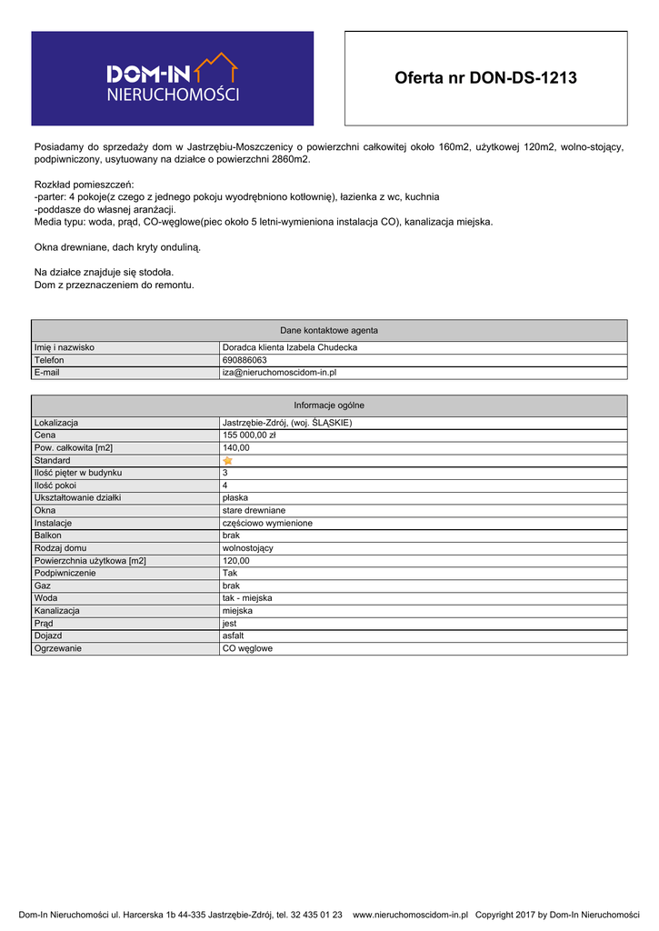 Oferta nr DON-DS-1213 Posiadamy do sprzedaży dom w Jastrzębiu-Moszczenicy o powierzchni całkowitej około 160m2, użytkowej 120m2, wolno-stojący, podpiwniczony, usytuowany na działce o powierzchni 2860m2. Rozkład pomieszczeń: -parter: 4 pokoje(z czego z jednego pokoju wyodrębniono kotłownię), łazienka z wc, kuchnia -poddasze do własnej aranżacji. Media typu: woda, prąd, CO-węglowe(piec około 5 letni-wymieniona instalacja CO), kanalizacja miejska. Okna drewniane, dach kryty onduliną. Na działce znajduje się stodoła. Dom z przeznaczeniem do remontu. Dane kontaktowe agenta Imię i nazwisko Telefon E-mail Doradca klienta Izabela Chudecka 690886063 [email protected] Informacje ogólne Lokalizacja Cena Pow. całkowita [m2] Standard Ilość pięter w budynku Ilość pokoi Ukształtowanie działki Okna Instalacje Balkon Rodzaj domu Powierzchnia użytkowa [m2] Podpiwniczenie Gaz Woda Kanalizacja Prąd Dojazd Ogrzewanie Jastrzębie-Zdrój, (woj. ŚLĄSKIE) 155 000,00 zł 140,00 3 4 płaska stare drewniane częściowo wymienione brak wolnostojący 120,00 Tak brak tak - miejska miejska jest asfalt CO węglowe Dom-In Nieruchomości ul. Harcerska 1b 44-335 Jastrzębie-Zdrój, tel. 32 435 01 23 www.nieruchomoscidom-in.pl Copyright 2017 by Dom-In Nieruchomości