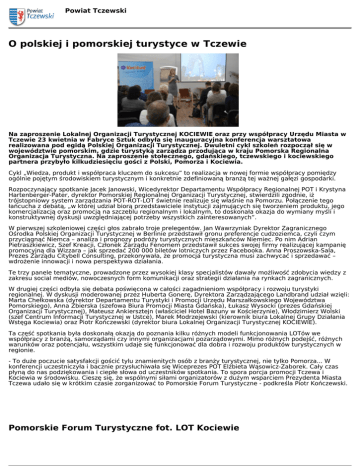 Powiat Tczewski O polskiej i pomorskiej turystyce w Tczewie Na zaproszenie Lokalnej Organizacji Turystycznej KOCIEWIE oraz przy współpracy Urzędu Miasta w Tczewie 23 kwietnia w Fabryce Sztuk odbyła się inauguracyjna konferencja warsztatowa realizowana pod egidą Polskiej Organizacji Turystycznej. Dwuletni cykl szkoleń rozpoczął się w województwie pomorskim, gdzie turystyką zarządza przodująca w kraju Pomorska Regionalna Organizacja Turystyczna. Na zaproszenie stołecznego, gdańskiego, tczewskiego i kociewskiego partnera przybyło kilkudziesięciu gości z Polski, Pomorza i Kociewia. Cykl „Wiedza, produkt i współpraca kluczem do sukcesu” to realizacja w nowej formie współpracy pomiędzy ogólnie pojętym środowiskiem turystycznym i konkretnie zdefiniowaną branżą tej ważnej gałęzi gospodarki. Rozpoczynający spotkanie Jacek Janowski, Wicedyrektor Departamentu Współpracy Regionalnej POT i Krystyna Hartenberger-Pater, dyrektor Pomorskiej Regionalnej Organizacji Turystycznej, stwierdzili zgodnie, iż trójstopniowy system zarządzania POT-ROT-LOT świetnie realizuje się właśnie na Pomorzu. Połączenie tego łańcucha z debatą, „w której udział biorą przedstawiciele instytucji zajmujących się tworzeniem produktu, jego komercjalizacją oraz promocją na szczeblu regionalnym i lokalnym, to doskonała okazja do wymiany myśli i konstruktywnej dyskusji uwzględniającej potrzeby wszystkich zainteresowanych”. W pierwszej szkoleniowej części głos zabrało troje prelegentów. Jan Wawrzyniak Dyrektor Zagranicznego Ośrodka Polskiej Organizacji Turystycznej w Berlinie przedstawił gronu preferencje cudzoziemca, czyli czym przyciągnąć Niemca – analiza i prognozy podróży turystycznych mieszkańców Niemiec. Po nim Adrian Pietraszkiewicz, Szef Kreacji, Członek Zarządu Fenomem przedstawił sukces swojej firmy realizującej kampanię promocyjną dla Wizzara – jak sprzedać 200 000 biletów lotniczych przez Facebooka. Anna Proszowska-Sala, Prezes Zarządu Citybell Consulting, przekonywała, że promocja turystyczna musi zachwycać i sprzedawać – wdrożenie innowacji i nowa perspektywa działania. Te trzy panele tematyczne, prowadzone przez wysokiej klasy specjalistów dawały możliwość zdobycia wiedzy z zakresu social mediów, nowoczesnych form komunikacji oraz strategii działania na rynkach zagranicznych. W drugiej części odbyła się debata poświęcona w całości zagadnieniom współpracy i rozwoju turystyki regionalnej. W dyskusji moderowanej przez Huberta Gonerę, Dyrektora Zarządzającego Landbrand udział wzięli: Marta Chełkowska (dyrektor Departamentu Turystyki i Promocji Urzędu Marszałkowskiego Województwa Pomorskiego), Anna Zbierska (szefowa Biura Promocji Miasta Gdańska), Łukasz Wysocki (prezes Gdańskiej Organizacji Turystycznej), Mateusz Ankiersztejn (właściciel Hotel Bazuny w Kościerzynie), Włodzimierz Wolski (szef Centrum Informacji Turystycznej w Ustce), Marek Modrzejewski (kierownik biura Lokalnej Grupy Działania Wstęga Kociewia) oraz Piotr Kończewski (dyrektor biura Lokalnej Organizacji Turystycznej KOCIEWIE). Ta część spotkania była doskonałą okazją do poznania kilku różnych modeli funkcjonowania LOTów we współpracy z branżą, samorządami czy innymi organizacjami pozarządowymi. Mimo różnych podejść, różnych warunków oraz potencjału, wszystkim udaje się funkcjonować dla dobra i rozwoju produktów turystycznych w regionie. - To duże poczucie satysfakcji gościć tylu znamienitych osób z branży turystycznej, nie tylko Pomorza... W konferencji uczestniczyła i bacznie przysłuchiwała się Wiceprezes POT Elżbieta Wąsowicz-Zaborek. Cały czas płyną do nas podziękowania i ciepłe słowa od uczestników spotkania. To spora porcja promocji Tczewa i Kociewia w środowisku. Cieszę się, że wspólnymi siłami organizatorów z dużym wsparciem Prezydenta Miasta Tczewa udało się w krótkim czasie zorganizować to Pomorskie Forum Turystyczne - podkreśla Piotr Kończewski. Pomorskie Forum Turystyczne fot. LOT Kociewie Powiat Tczewski Powered by TCPDF (www.tcpdf.org)